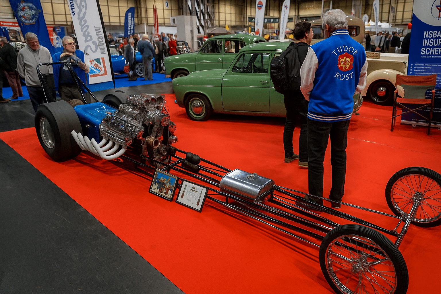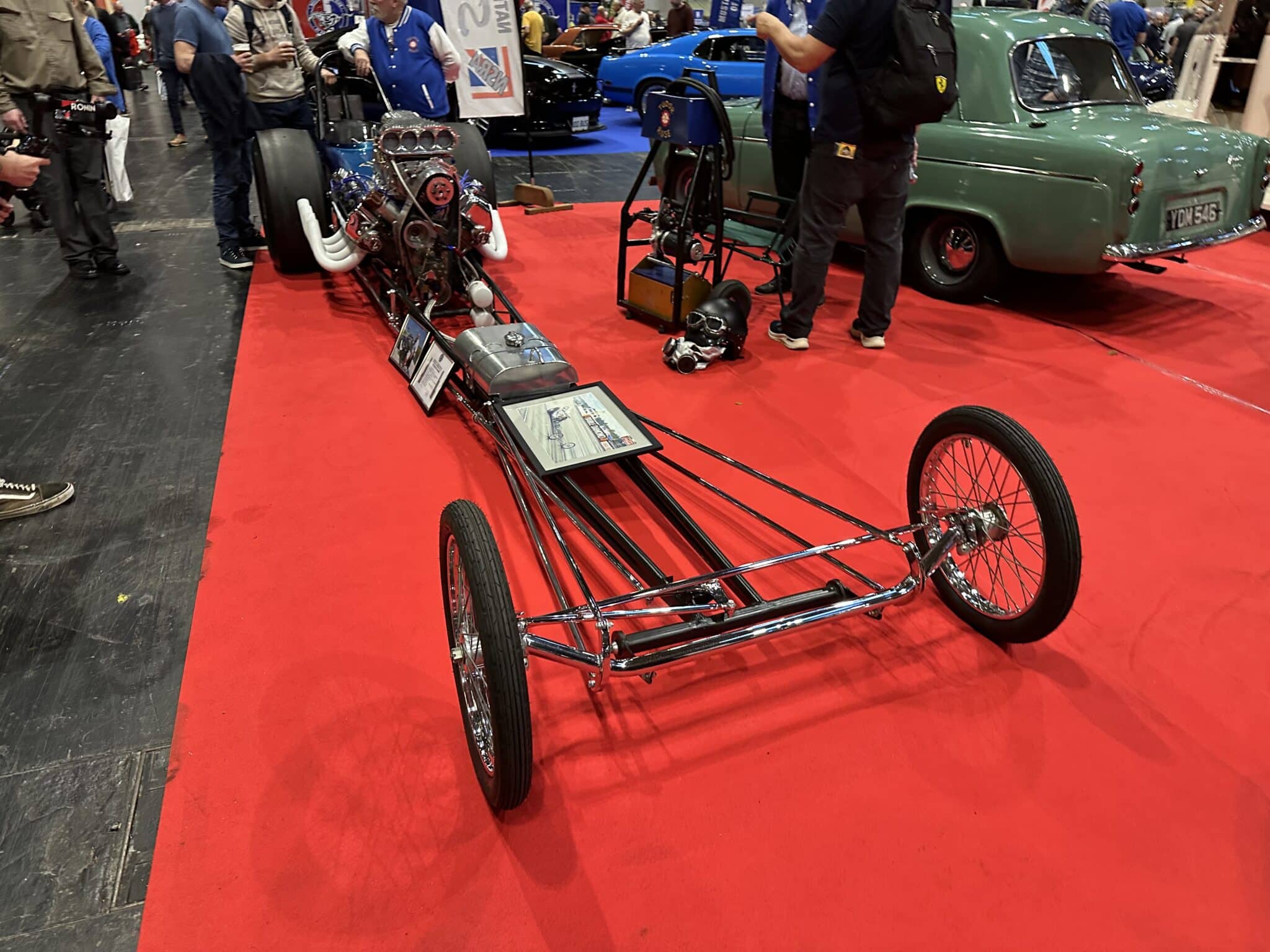 The Tudor Rose Dragster has had lots of different parts and people working on it over the years. Engines were swapped, new wheels added, and it even got a new coat of paint In the 1980s. It also got a huge new engine from an American car brand called Chevy.