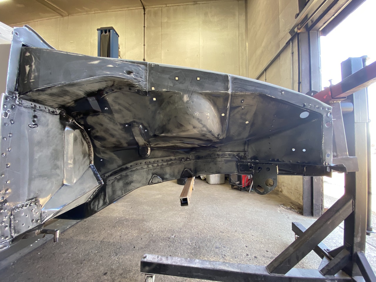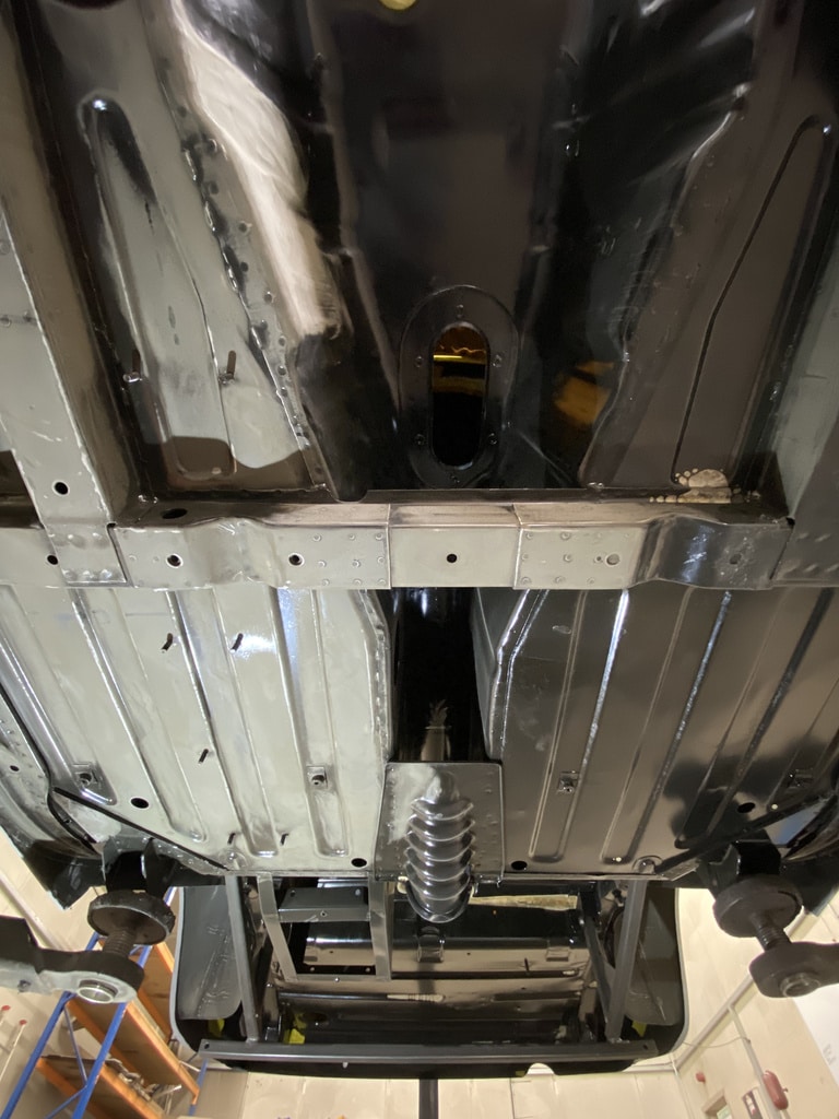 Adam, one of our amazing technicians, has been continuing to march ahead with the restoration of the 1975 MGB GT. At this point, with the classic sports car on a rottisserie, he has been getting the underside prepped and ready before shooting the underside in epoxy primer prior to the team seam sealing and and raptor guarding the car.