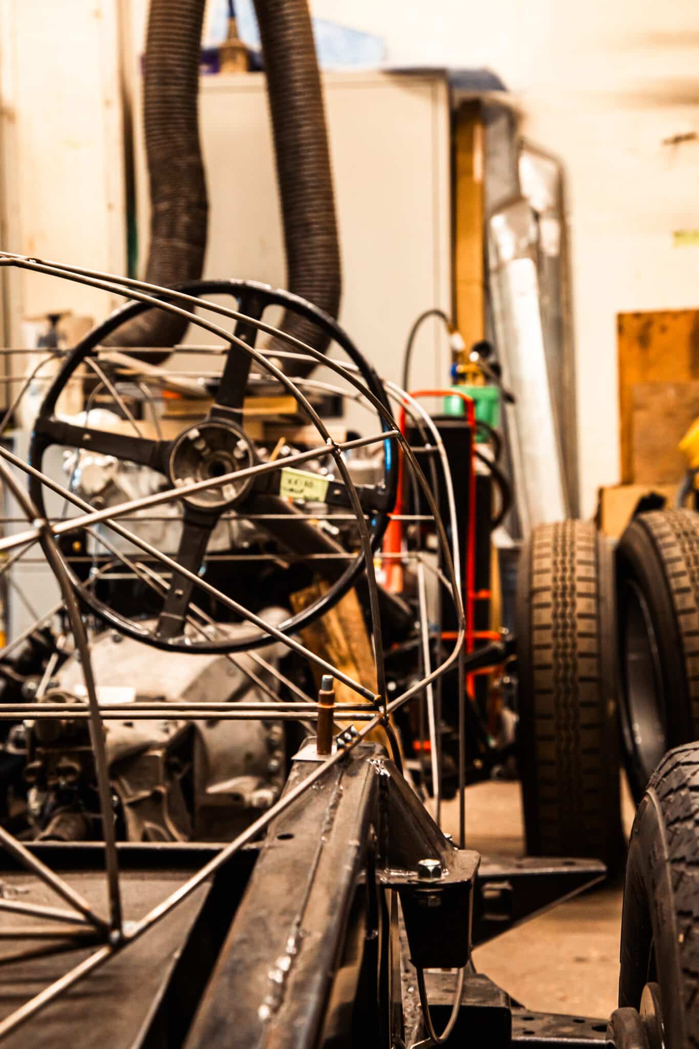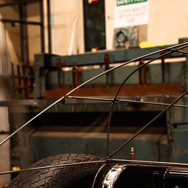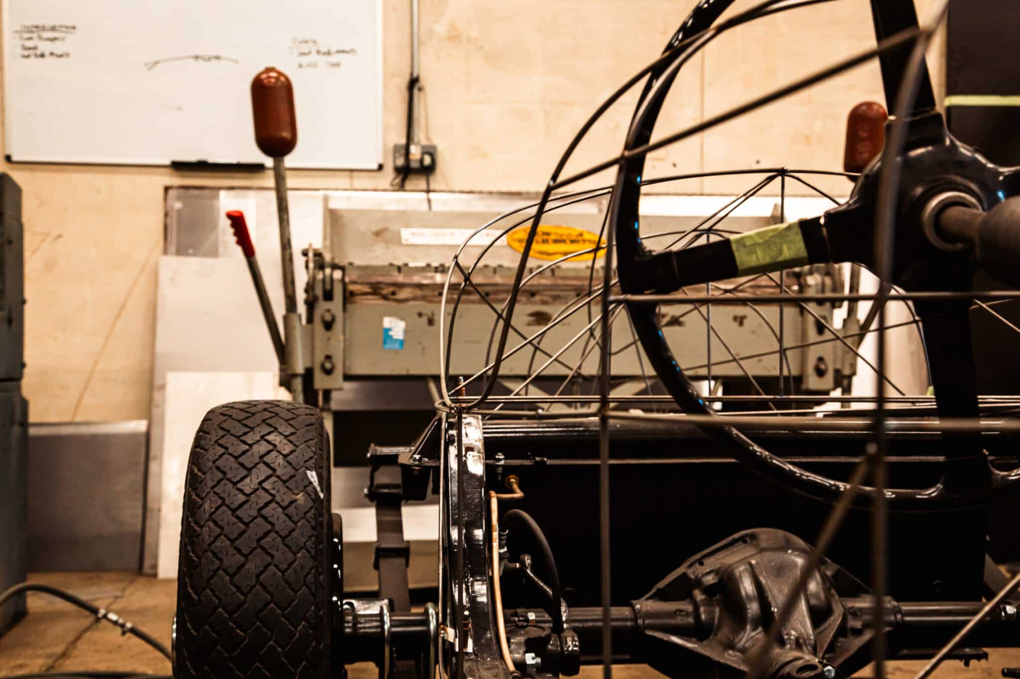 This time, Clinton has been building the ‘birdcage’ forward to give the handbuilt classic car more of a shape and form with its waist line. The sides of the cockpit gently roll out and back in towards the firewall to form a teardrop shape and give the car an organic form.
