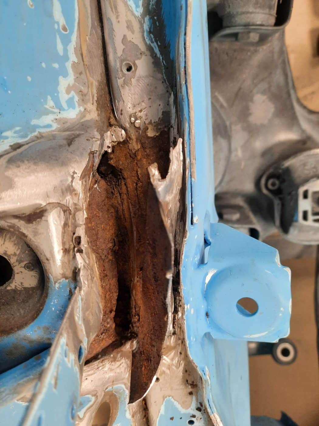 Our body and paint technicians have been working on getting the engine bay of the classic Mercedes into the same shape as the outside of the car but upon further inspection during sanding, some areas have some rust issues and previous poor repairs.