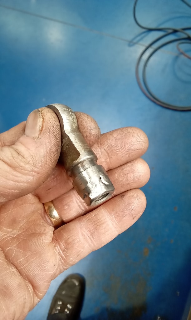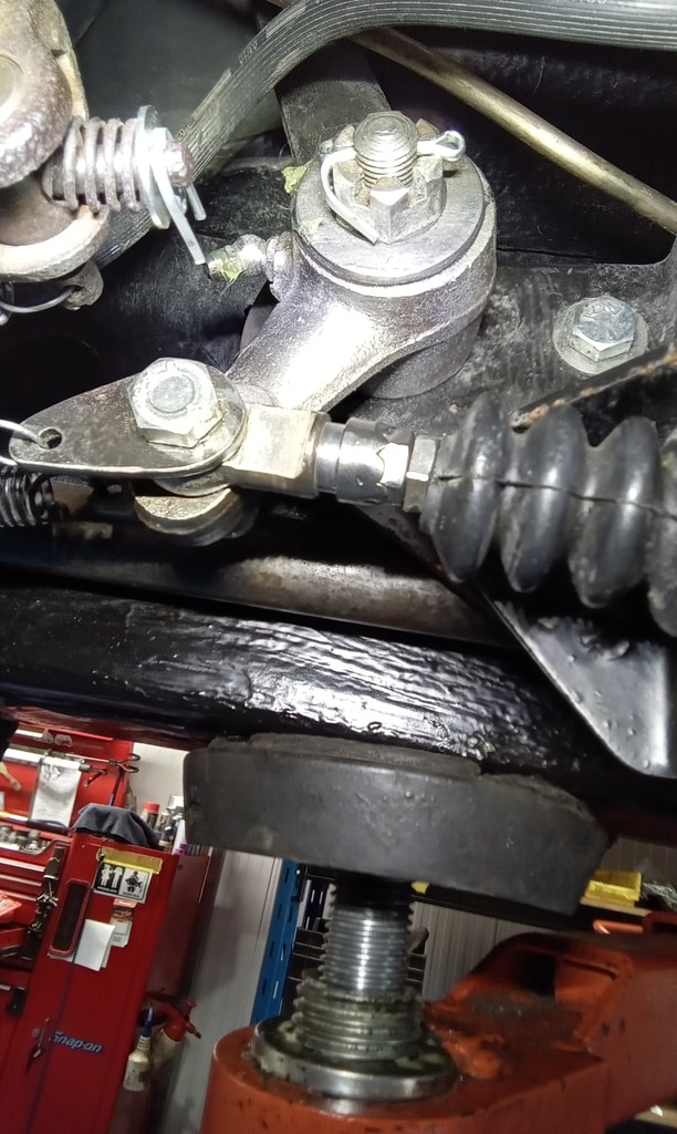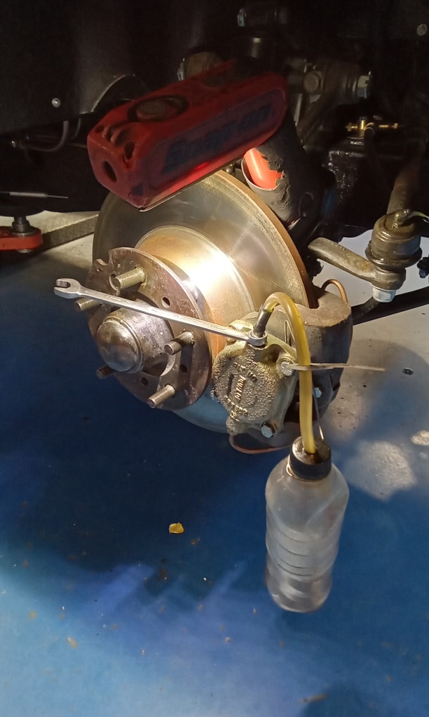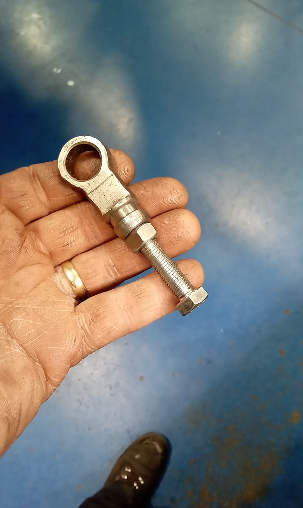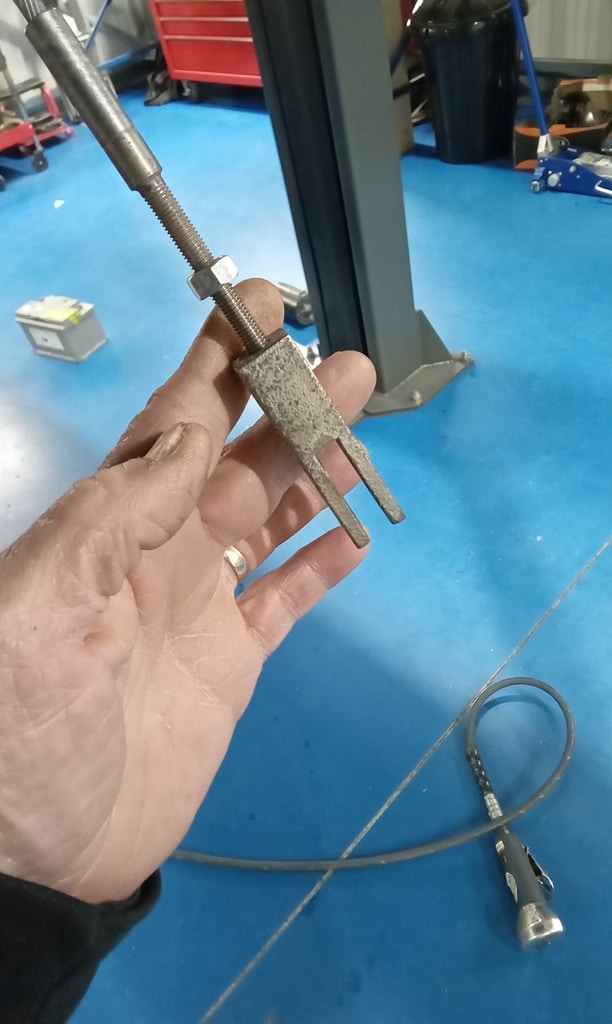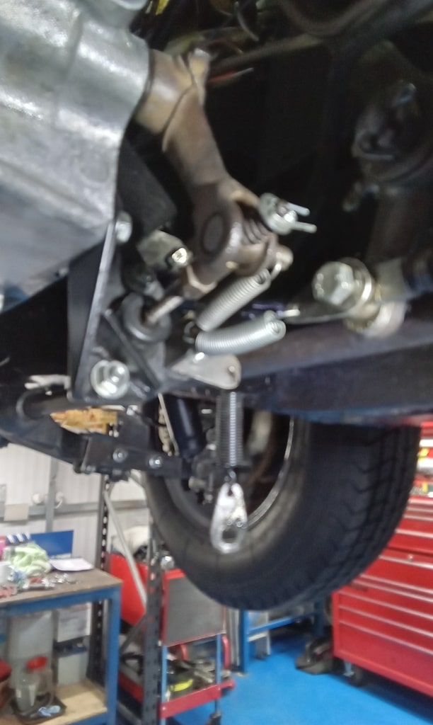 ‘Attend to hanbrake. Remove link from rear axle pivot and cut down cable thread. Refit end link and reattach. Adjust nearside cable via cable adjuster. Reconnect main cable and pin. Find return spring to fit to lever on chassis. Drill hole in inner wing and fit spring to lever and test. Adjust clutch pedal height as sitting lower than brake pedal and bite point low. Remove master cylinder under push rod end and weld new one to give more thread. Refit and adjust until pedal height set. Lower to floor and test. Feels better. Refit intake pipe and air filter. Remove all wheels again and bleed brakes. Lots of air in fronts. Top up fluid and refit wheels. Torque up and refit trims. Take outside warm up and adjust idle. Carry out road test. 2 chrome rings from wheels came off but managed to find all clips and put in back of car. Adjust idle speed and mixture slightly. Re-road test with John to assess noises and performance.’