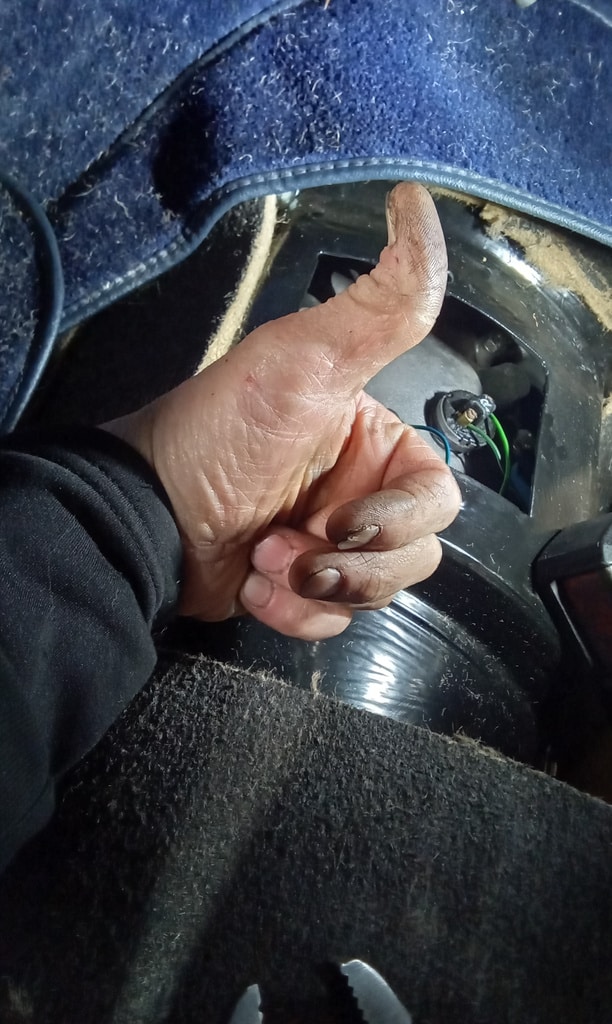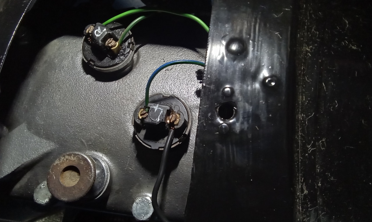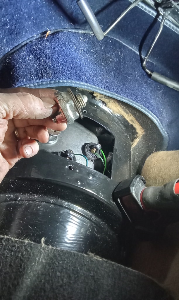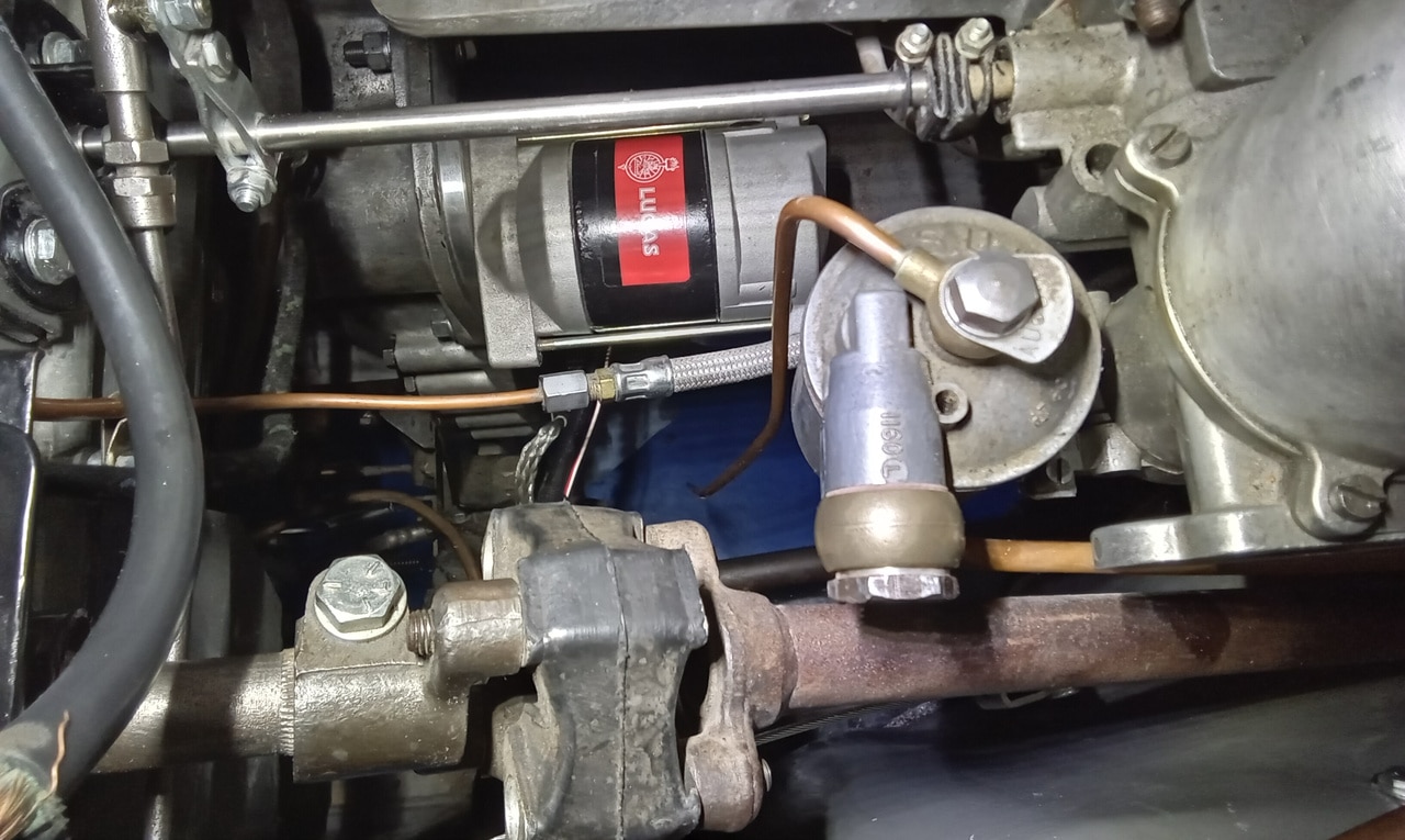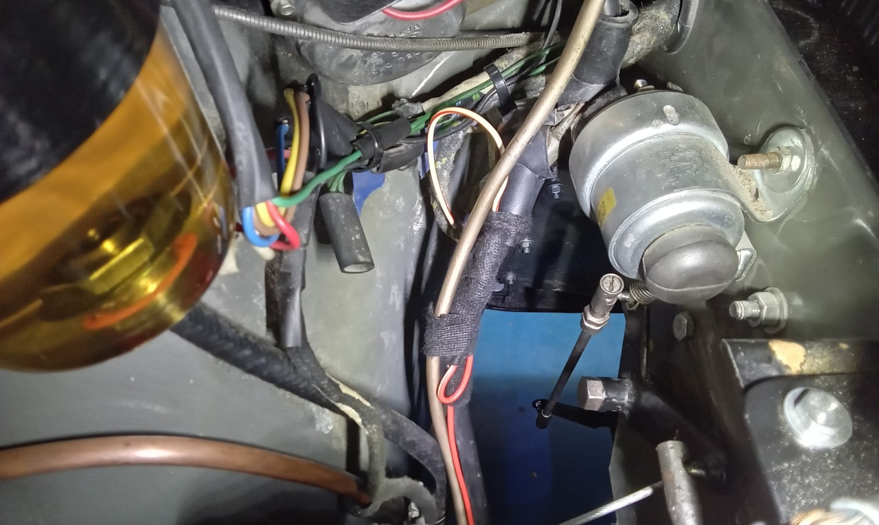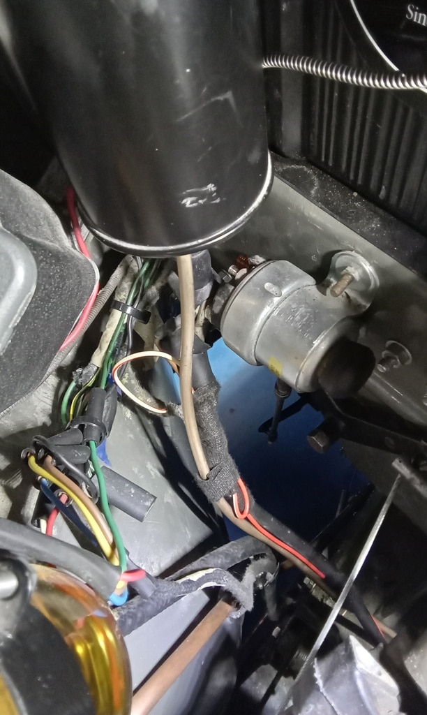 ‘Make wire to go from original solenoid on bulkhead to new starter. Crimp and solder onspade terminal one end. Feed wire through and to solenoid. Cut amd crimp on bullet and then use joiner to connect. Fit starter and secure. Test, starts fine now. Tidy and secure wiring and refit clutch reservoir.’