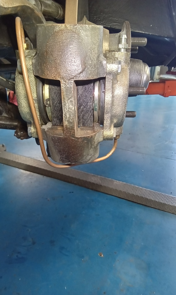 ‘Brakes staying on or hanging up. Pump pedal several times and check each wheel spins freely. Both fronts a little tight. Remove front wheels. Get will to hold pedal down and release. Strip and remove nearside pads and check pistons return . Tight to squeeze back but they do go back.’