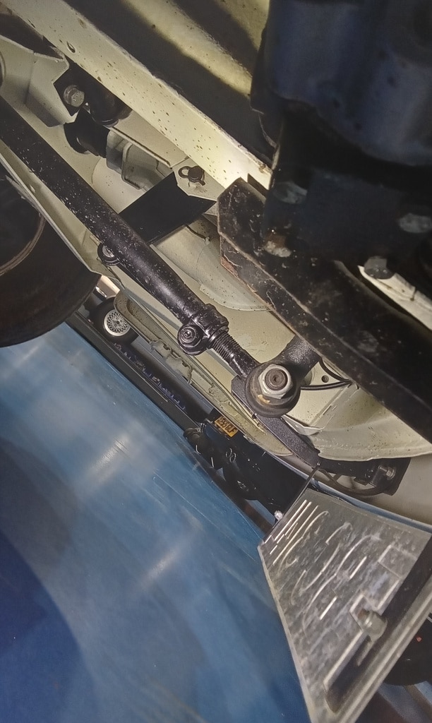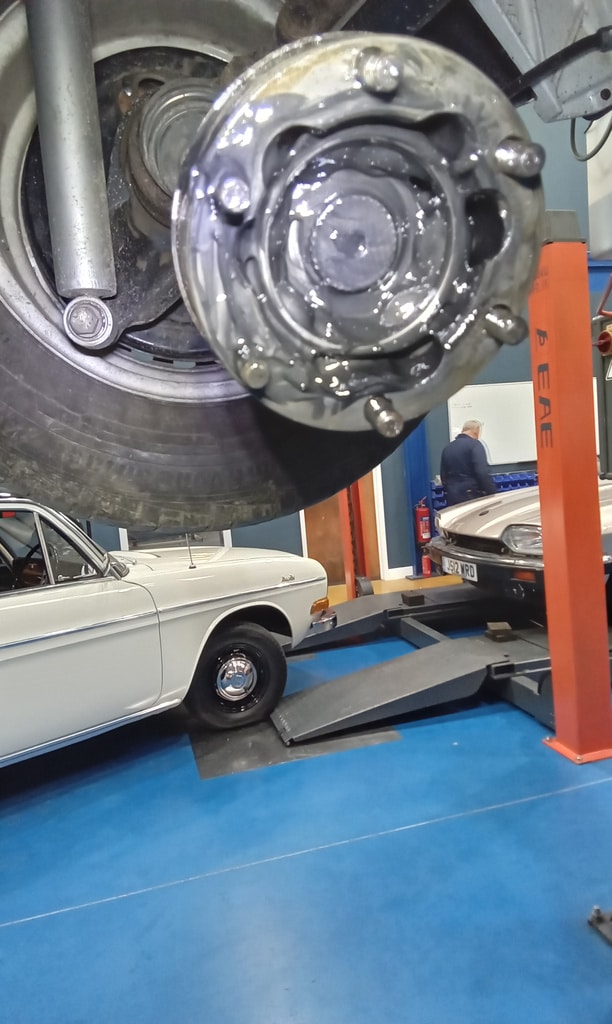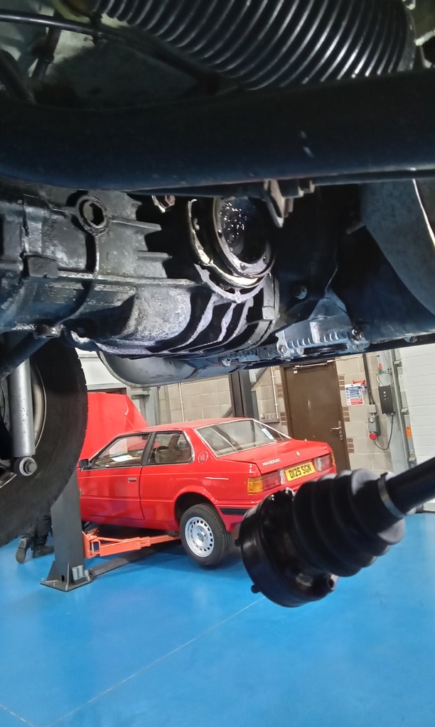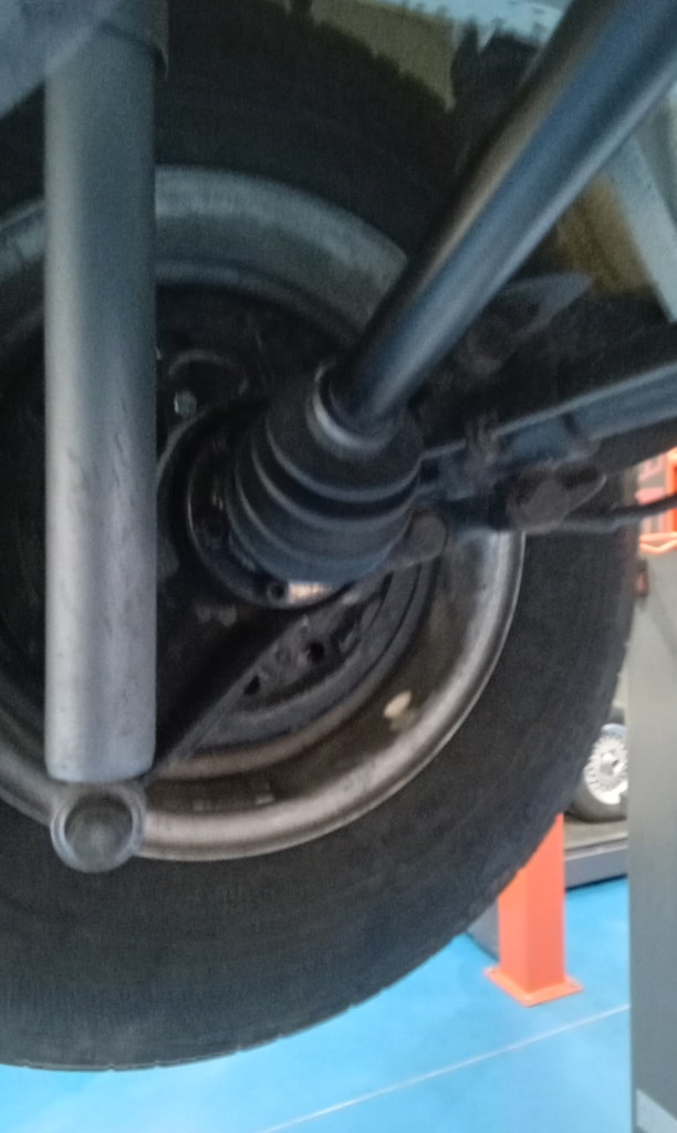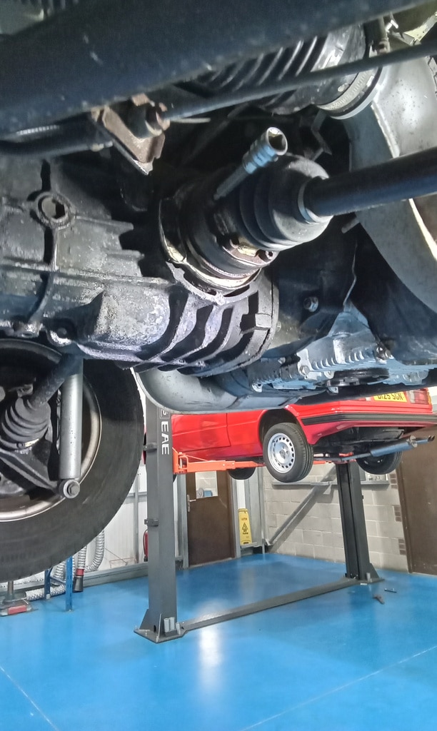 ‘Fit circlip to speedo cable end in nearside front dust cover. Refit wheel trim. Disconnect drag link ball joint and adjust until steering wheel straight. Resecure and tighten clamp. Warm up and carry out road test with John and Rob in the back to trace noise. Return and put on ramp. Suspect driveshaft nearside. Remove driveshaft and inspect joints. Inner joint been excessively greased and has slight play. Turn driveshaft through 180 so inner now becomes outer and viceversa, changing the direction of rotation and more importantly load. Carry out another road test, noise now gone.’
