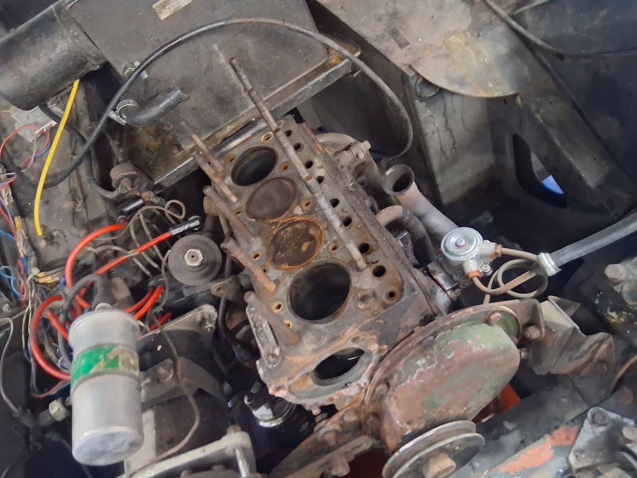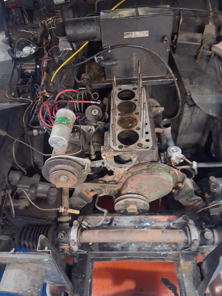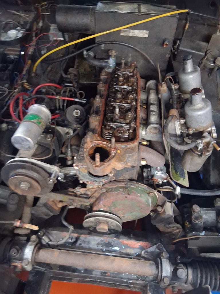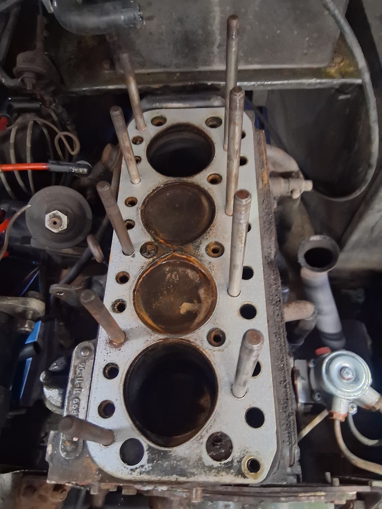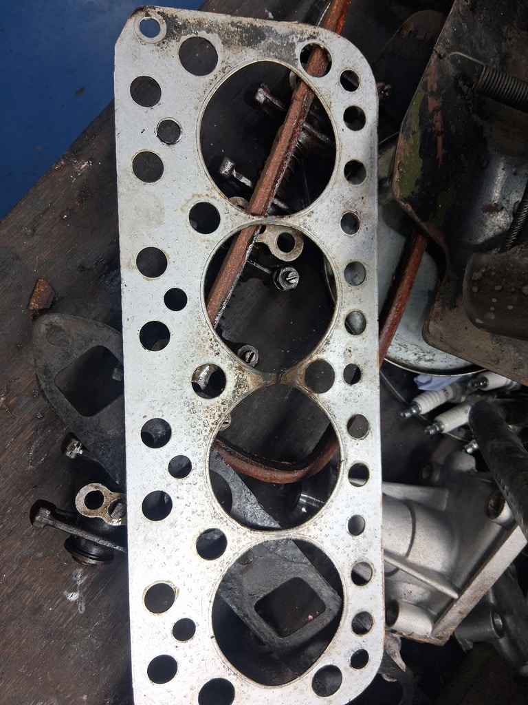 First off, the car arrived at the Bridge Classic Cars workshop as non-runner, so our workshop manager John started to dive into the classic convertible. The owner had told us that the car had gotten hot, and then began to run rough. First off, John check for fuel and spark which he find were ok, after finally getting the car to start, John found that it was only firing on two cylinders. After removing the spark plugs, of which two were very stiff to come out and when they did were heavily corroded (specifically number 2 and 3). Once these removed, John could carry out a cylinder pressure check – cylinders 2 and 3 were reading low. The next port of call was for John to remove the cylinder head from the 950cc engine.