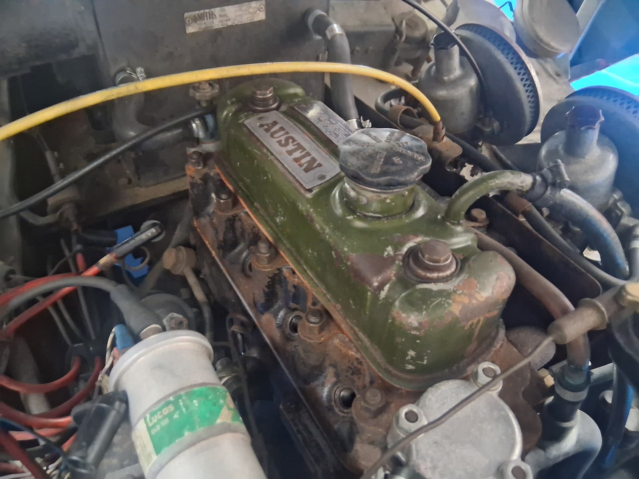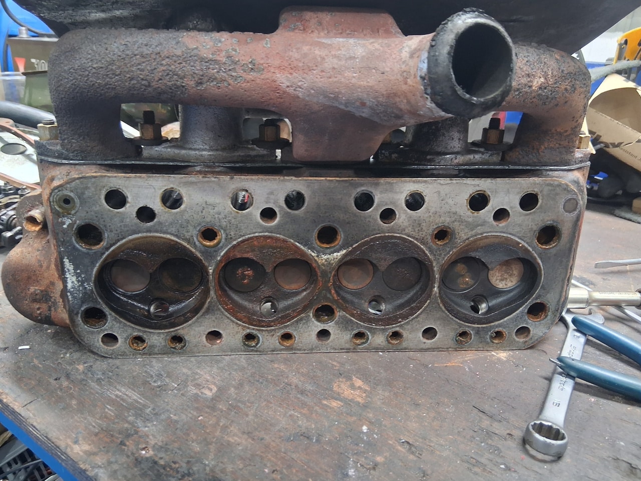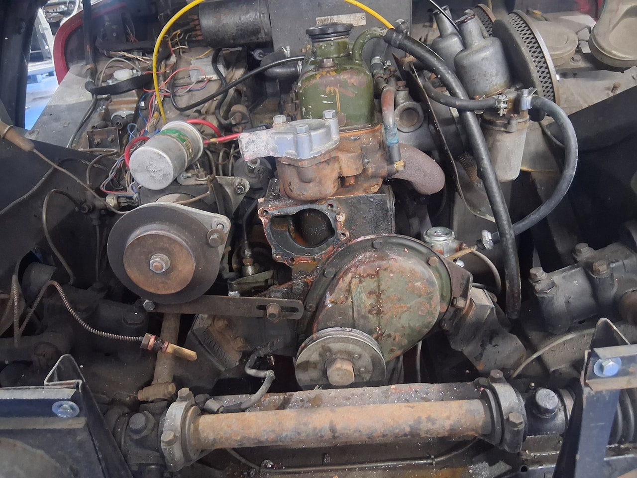 First off, the car arrived at the Bridge Classic Cars workshop as non-runner, so our workshop manager John started to dive into the classic convertible. The owner had told us that the car had gotten hot, and then began to run rough. First off, John check for fuel and spark which he find were ok, after finally getting the car to start, John found that it was only firing on two cylinders. After removing the spark plugs, of which two were very stiff to come out and when they did were heavily corroded (specifically number 2 and 3). Once these removed, John could carry out a cylinder pressure check – cylinders 2 and 3 were reading low. The next port of call was for John to remove the cylinder head from the 950cc engine.