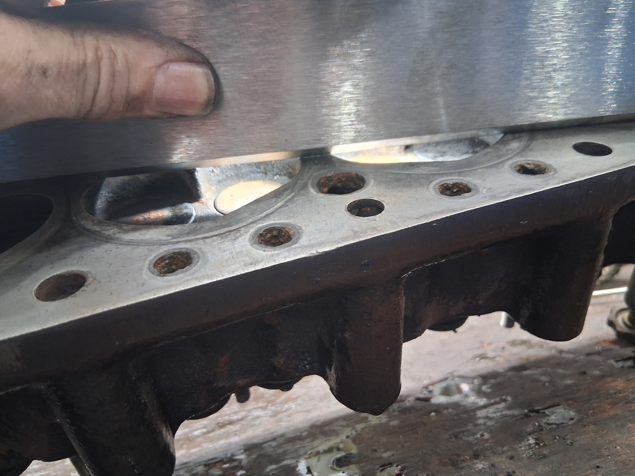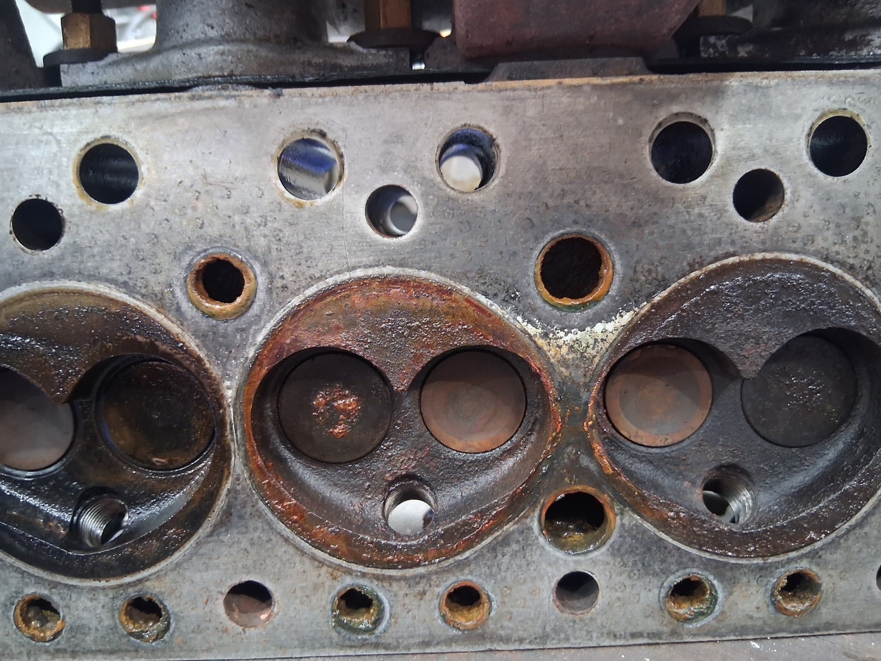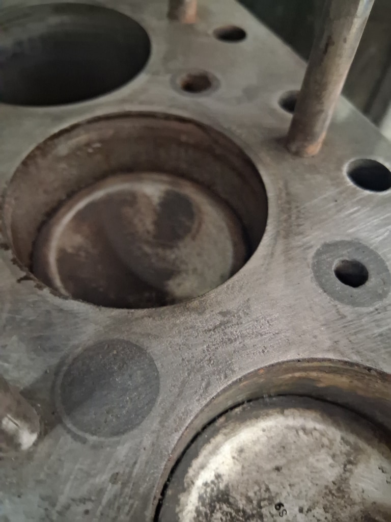 After thoroughly cleaning out the coolant passages and the radiator of the Frogeye until all that came out was clean water, John could begin the process of removing the cylinder head. Upon inspection, John found cylinders 2 and 3 to have corrosion on them cause by the head gasket failing between cylinder 2 and 3.