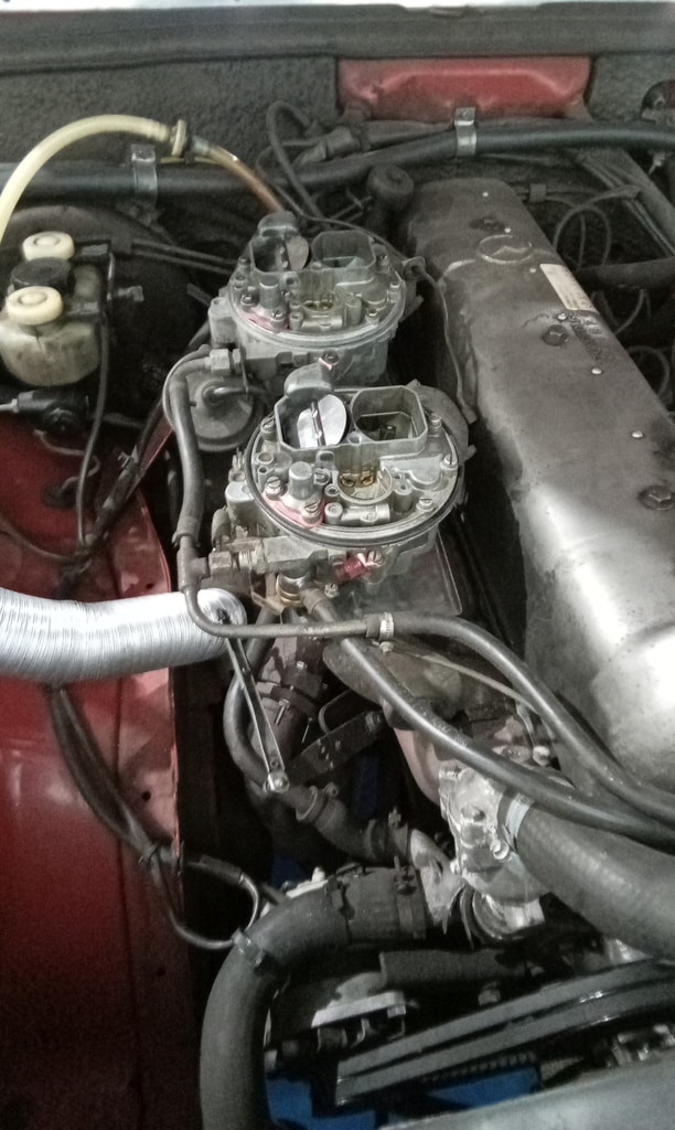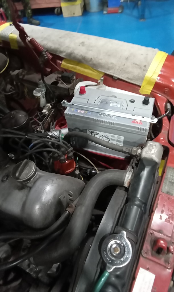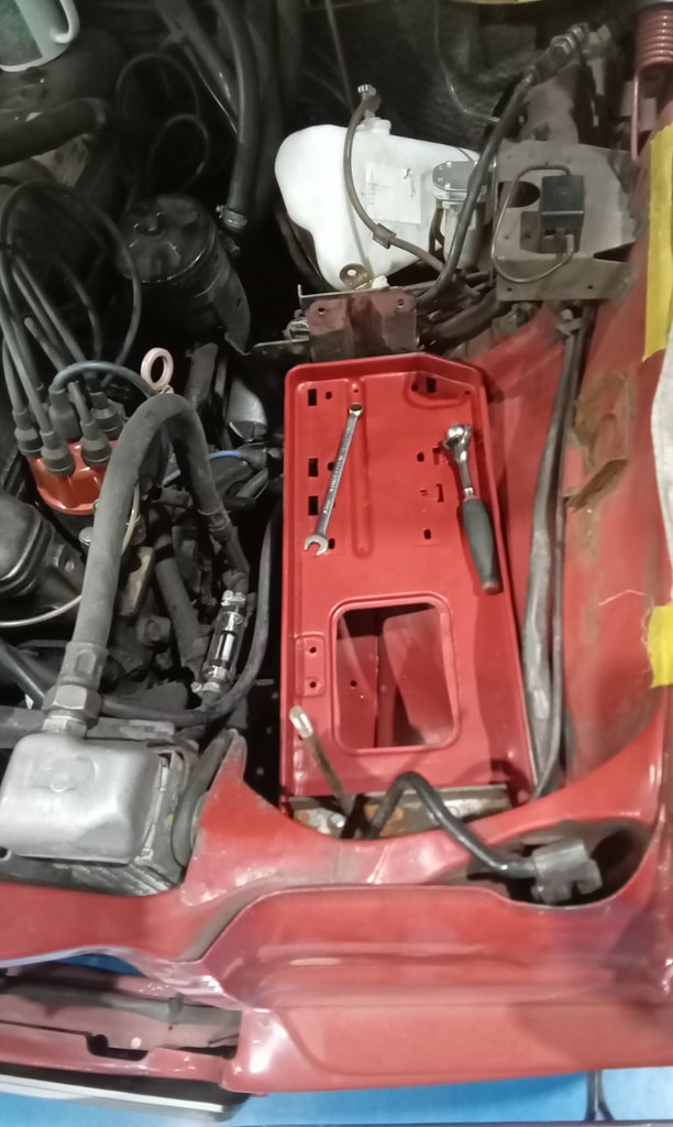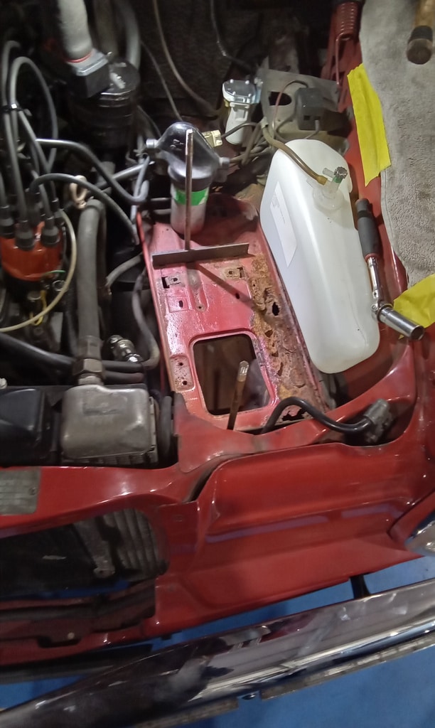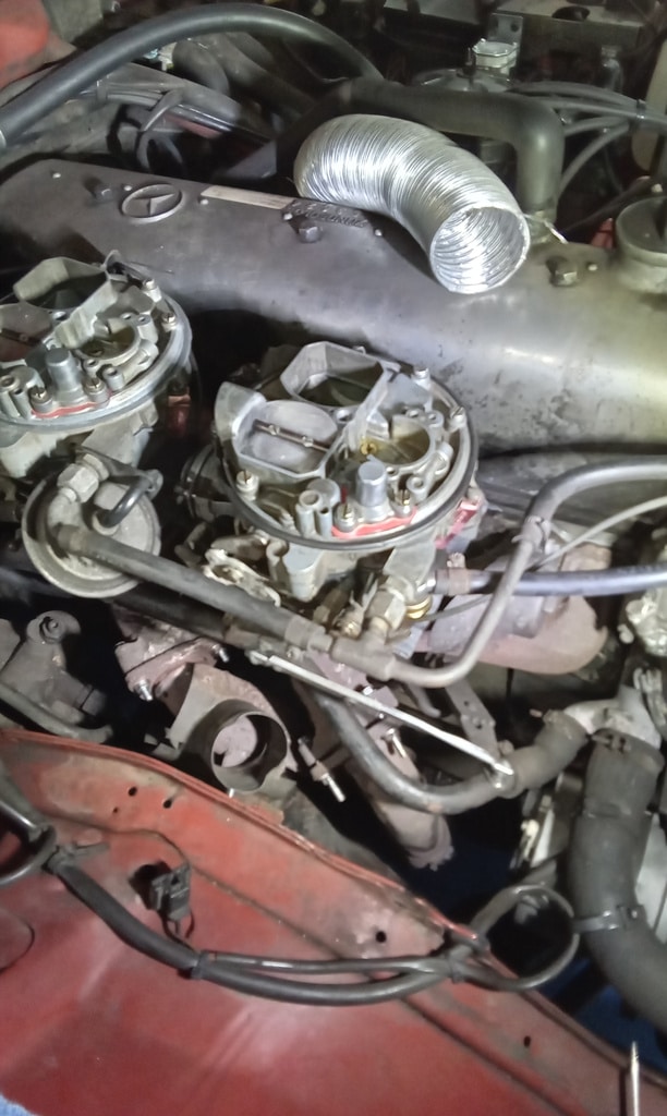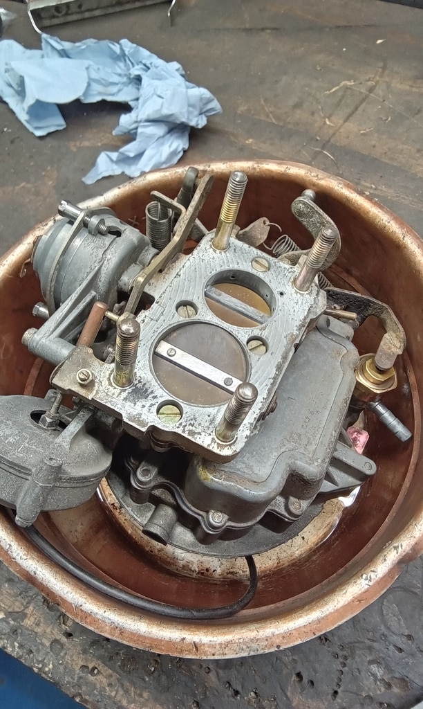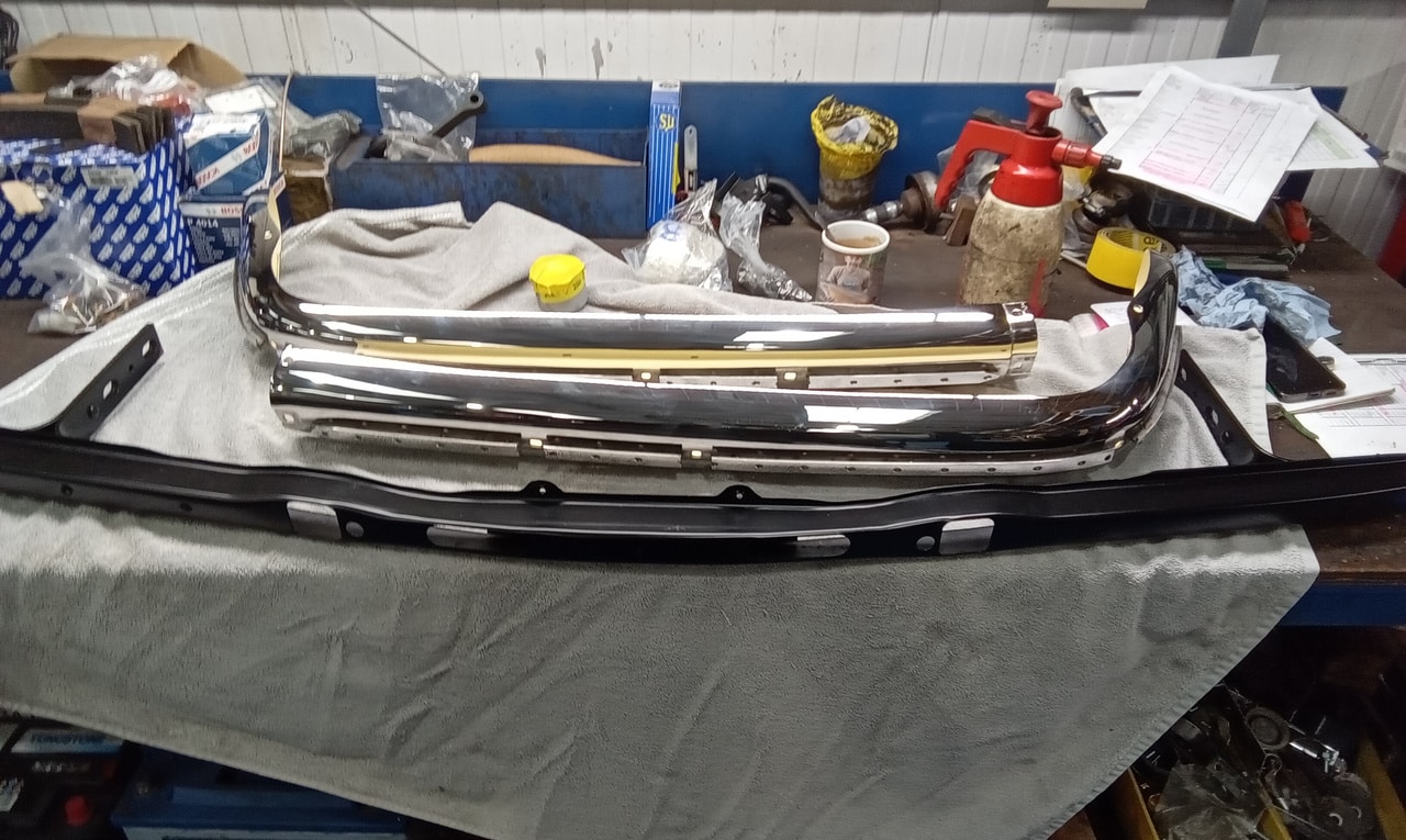 ”Refit battery hold down brackets. Fit new battery and secure. Refit coil and ballast resistor. Crank over and check for fuel at arbs. Starts, runs and idles now but has an air leak on front carb. Also needs timing up correctly and testing. Fit rubber over rider trim to front and rear bumpers and trim to length. Start stripping front carb.”
