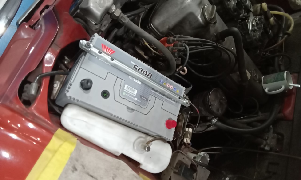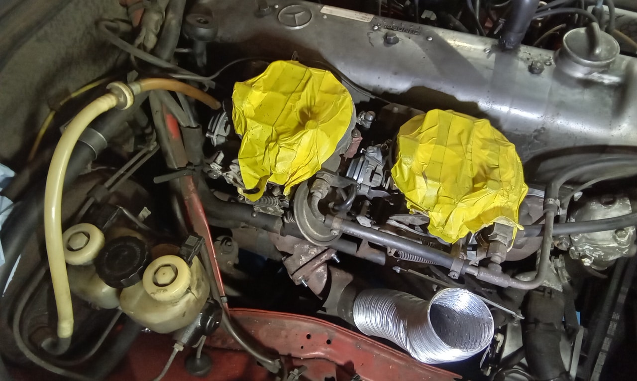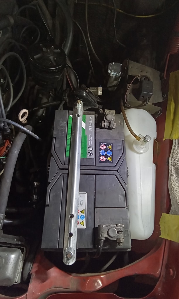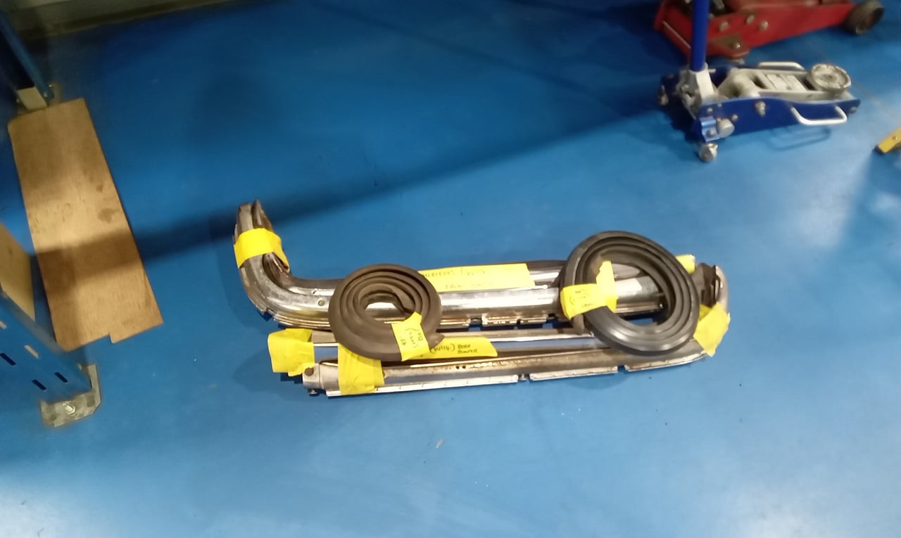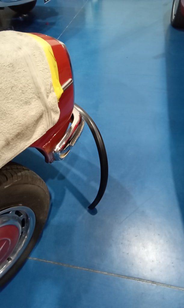 ”Refit battery hold down brackets. Fit new battery and secure. Refit coil and ballast resistor. Crank over and check for fuel at arbs. Starts, runs and idles now but has an air leak on front carb. Also needs timing up correctly and testing. Fit rubber over rider trim to front and rear bumpers and trim to length. Start stripping front carb.”