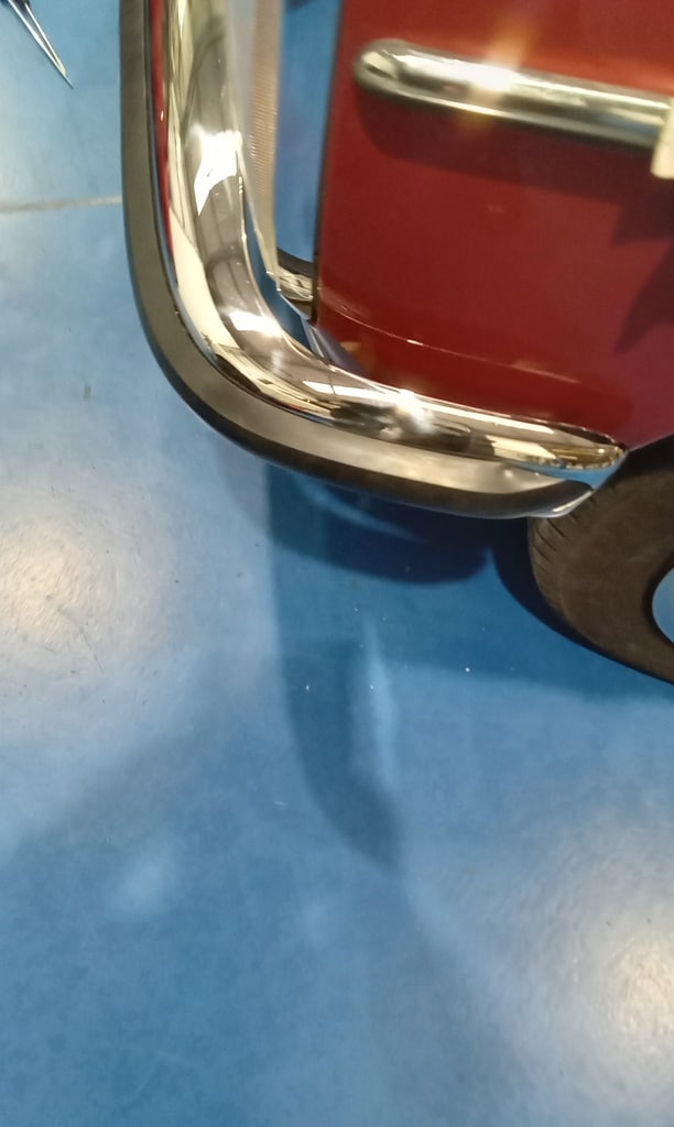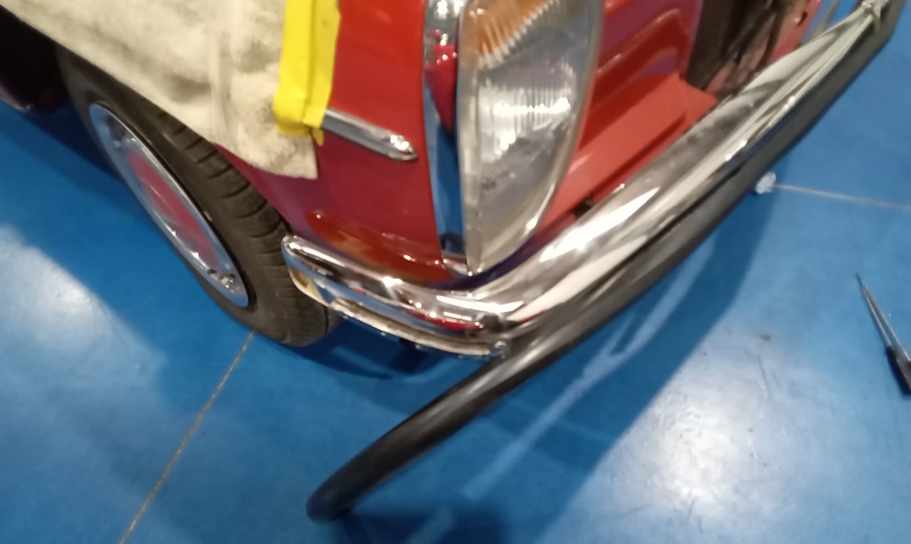 ”Continue with rear bumper. Disassemble old rear bumper and remove crash bar. Clean and paint bar black. Build chrome’s. Tap out threaded holes. Mount chromes to crash bar and mount to car and secure. Attempt to start again but battery still low after been on charge for hours.”
