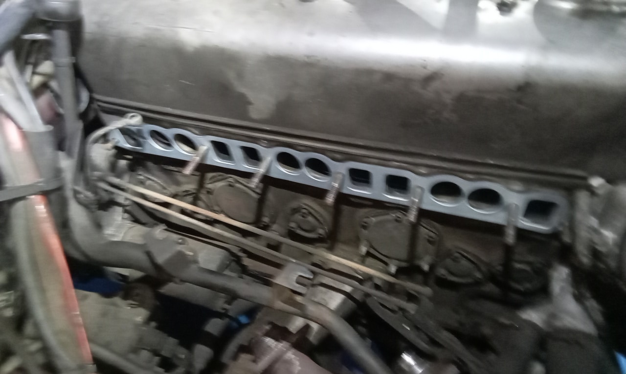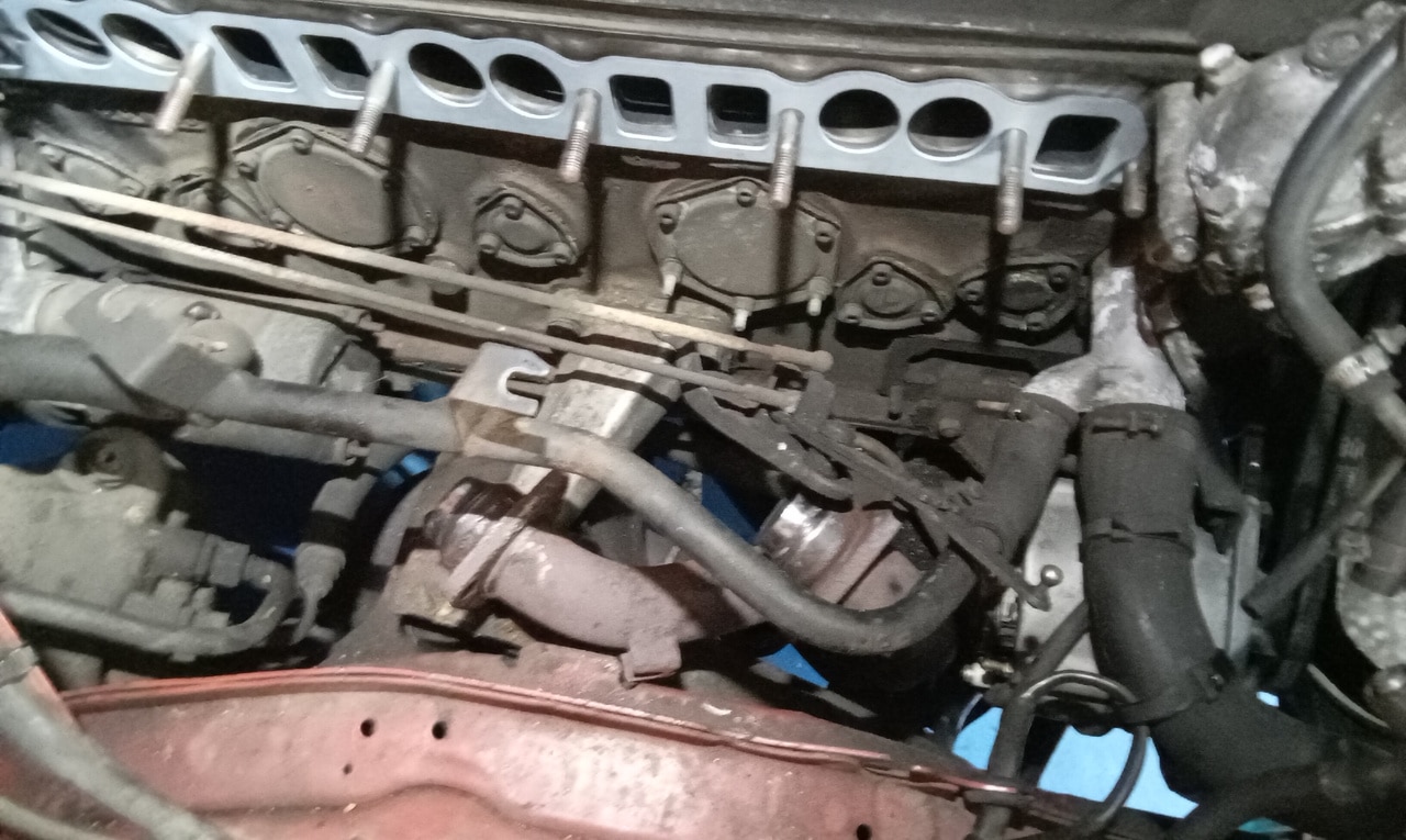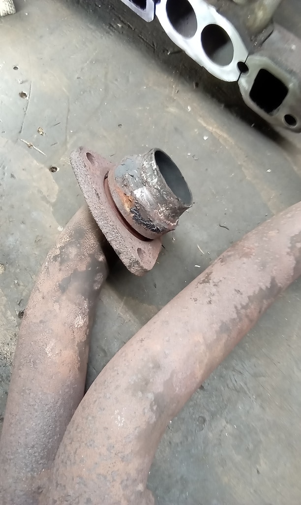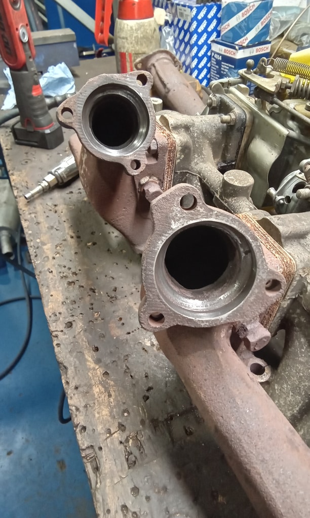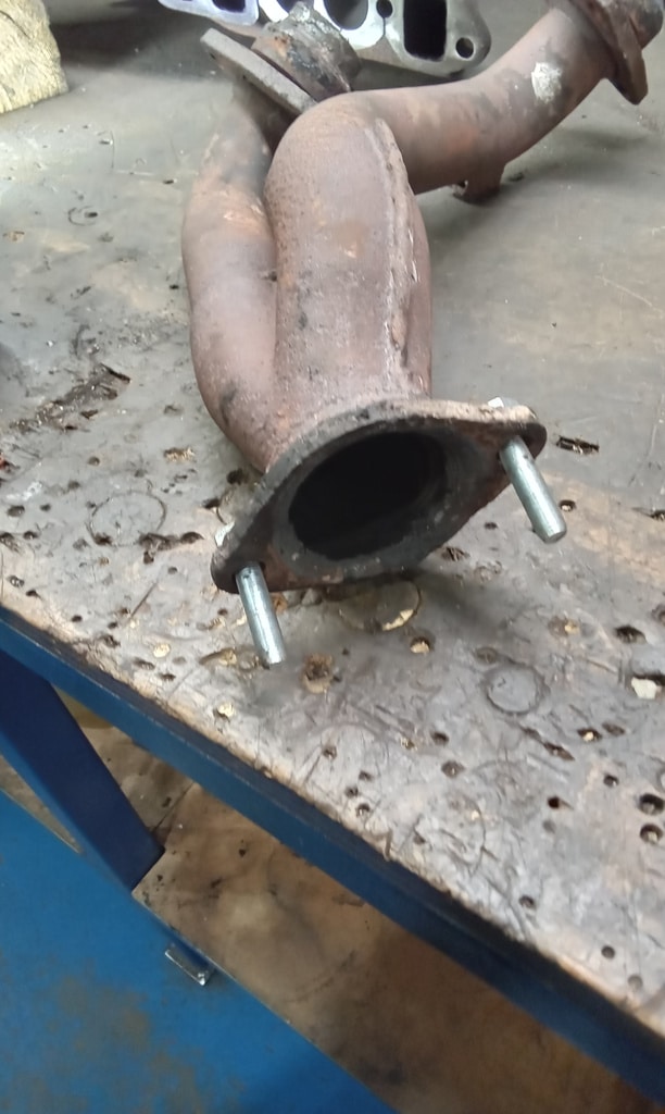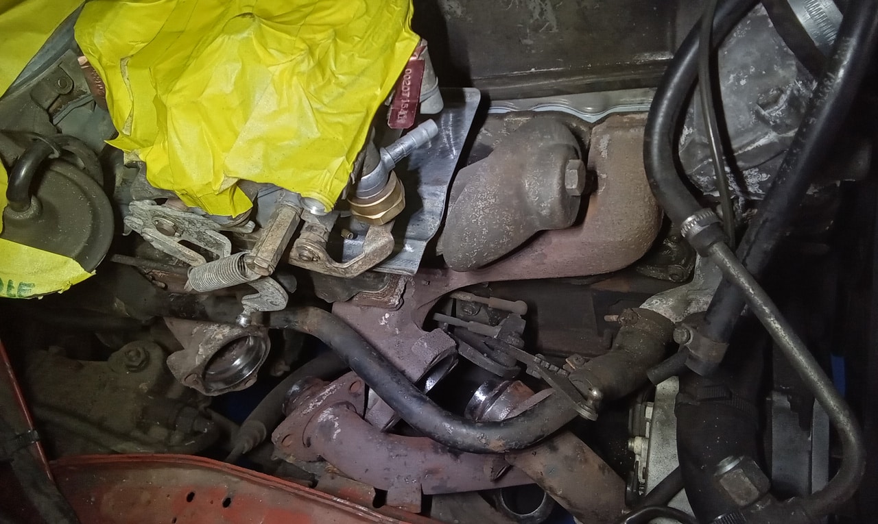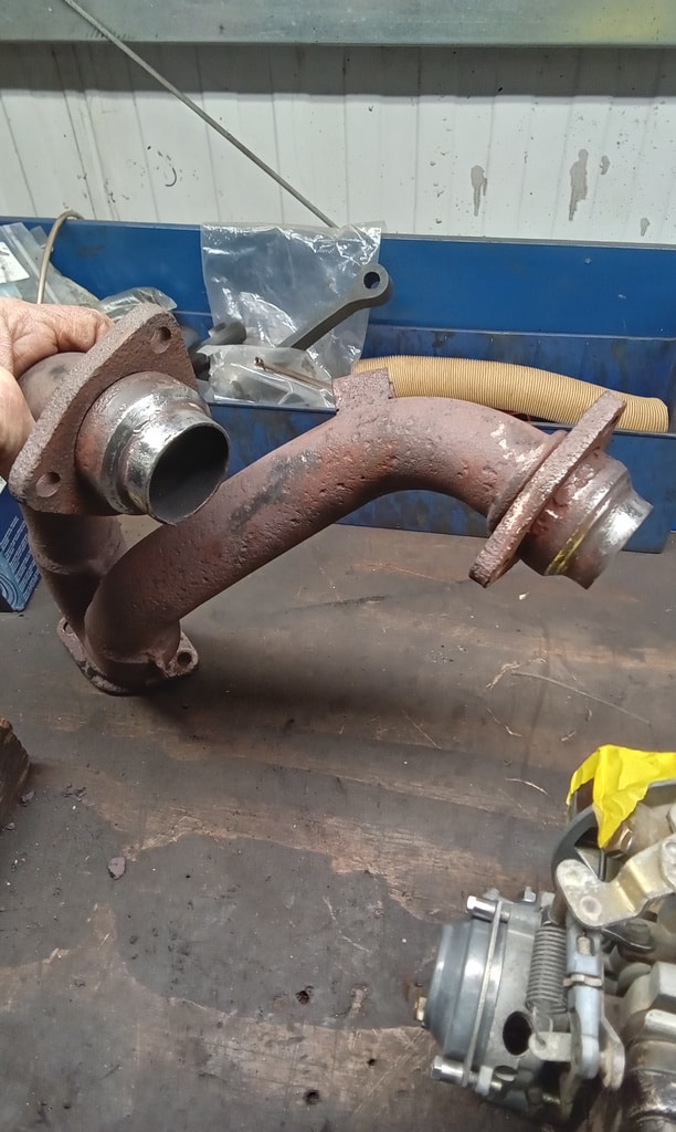 ”Clean block and manifold. Clean all exhaust flanges. Fit new gasket, refit manifold and secure. Refit all pipes and hoses. Resecure throttle to block and reconnect to carbs. Refit exhaust downpipes and front pipe and secure. Reconnect battery and turn over. Battery low, put on charge. Build new front bumper. Secure chrome’s to crash bar and mount to car.”