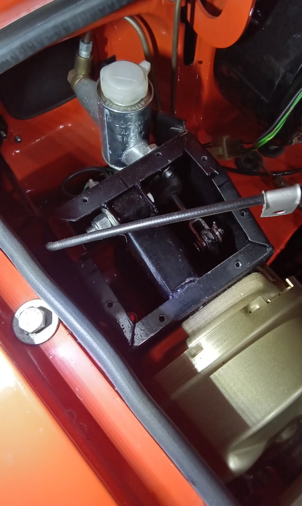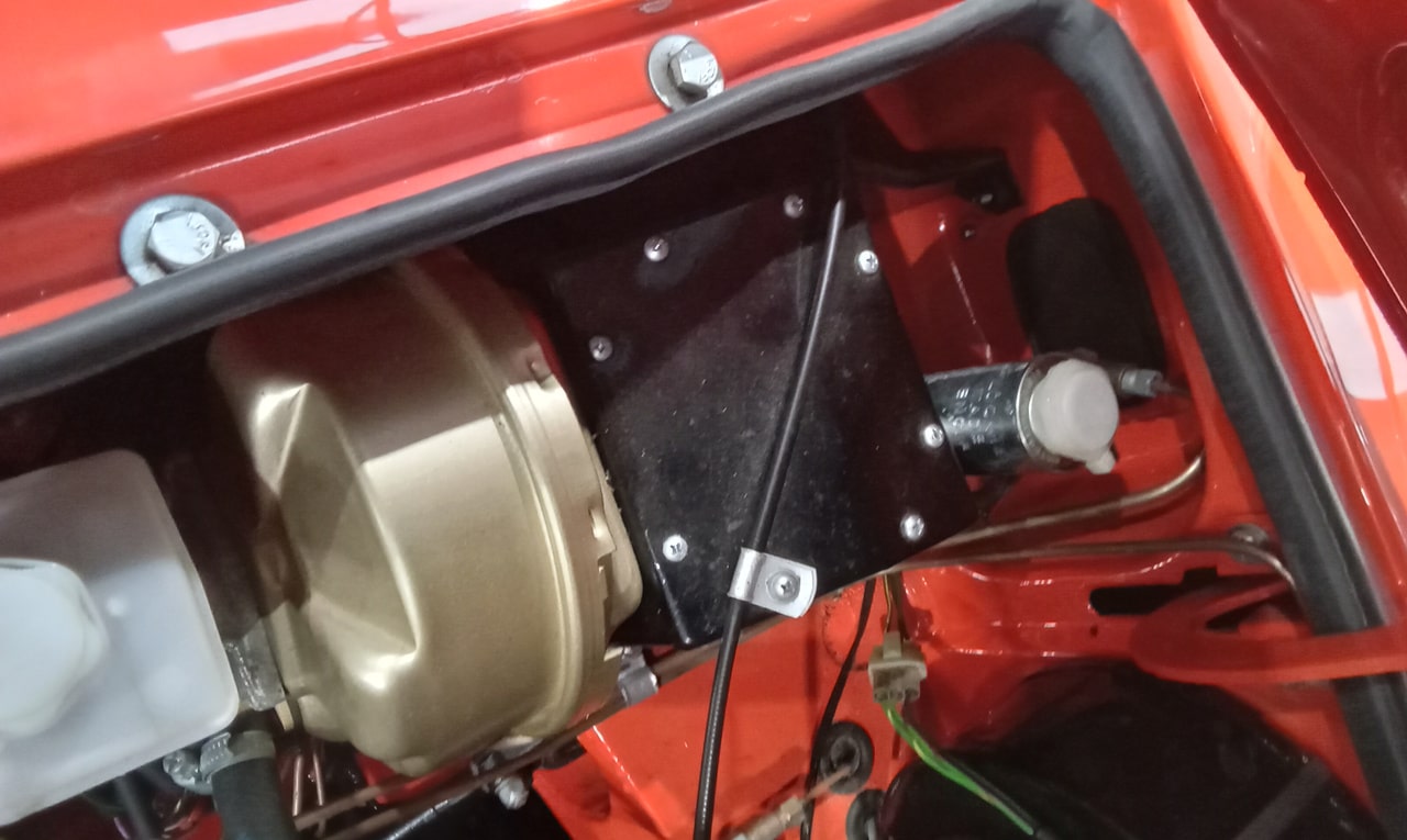 ‘Check brakes. Pedal has slightly long travel but doesn’t pump up. Check pedal rod for adjustment. Remove cover and inspect. No adjustment on rod so refit cover.‘