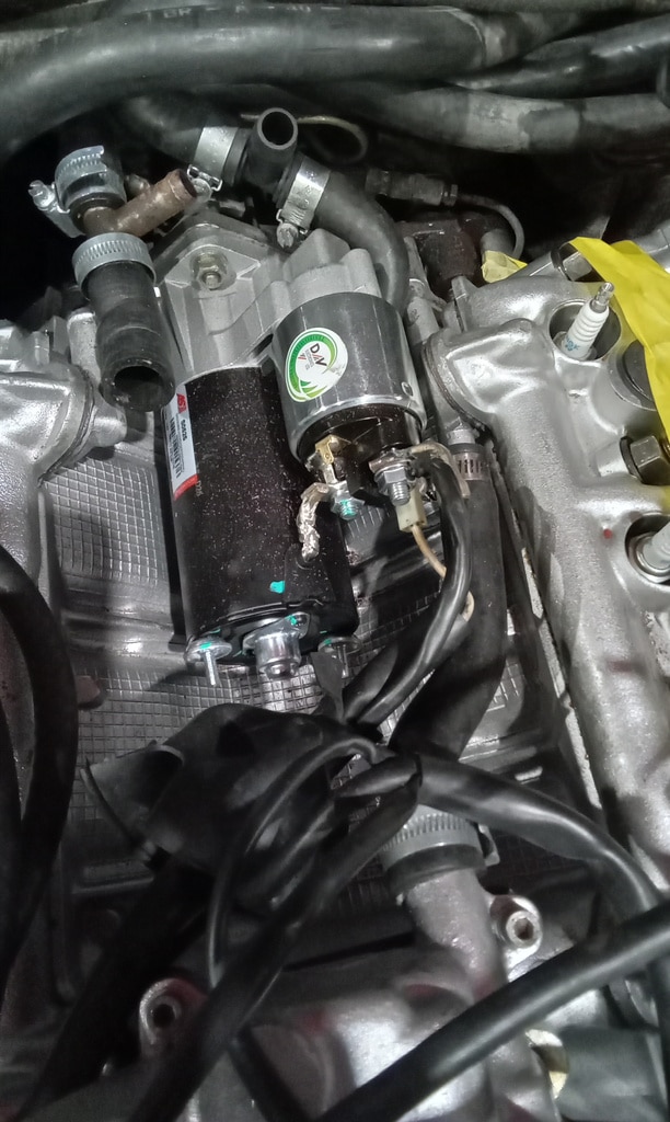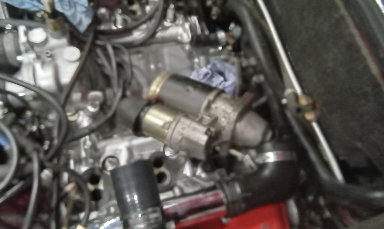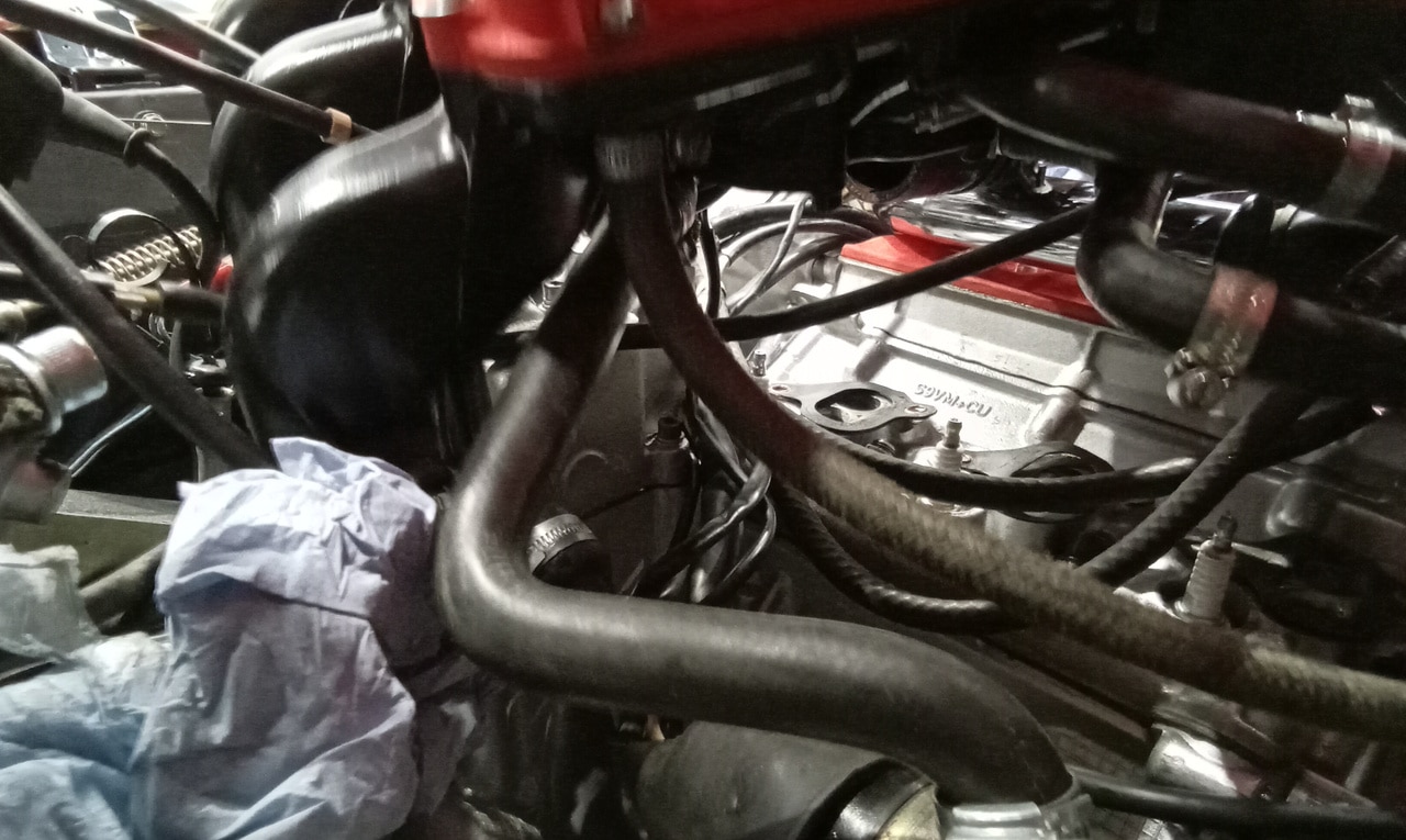 ‘Help will with testing new starter motor for clearance when fitted. Turn over by hand and check flywheel clears. All OK. Connect up and check turns over NY starter. Sound so much better and clears ok. Recheck again by hand and seems good. Align timing. Remove and refit distributor and cap. Trim starter label and secure. Refit rubber boot. Connect coolant pipes to oth heads.