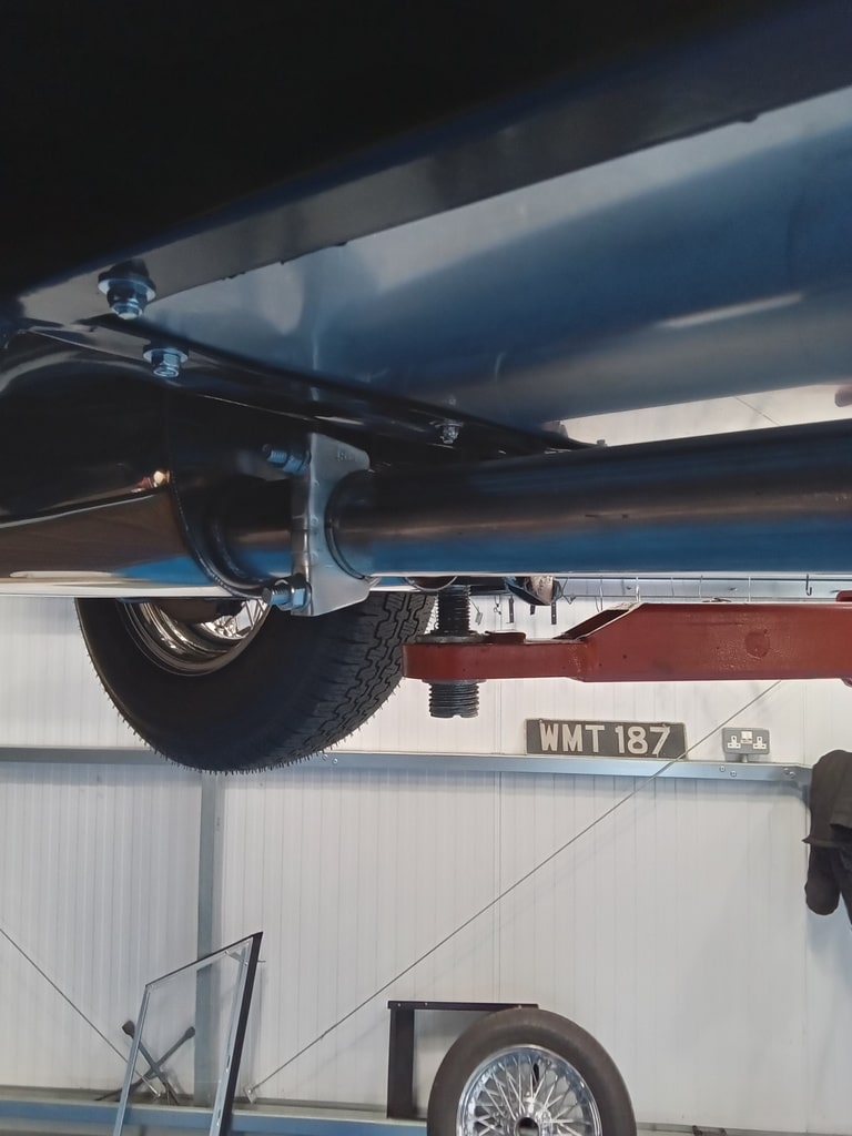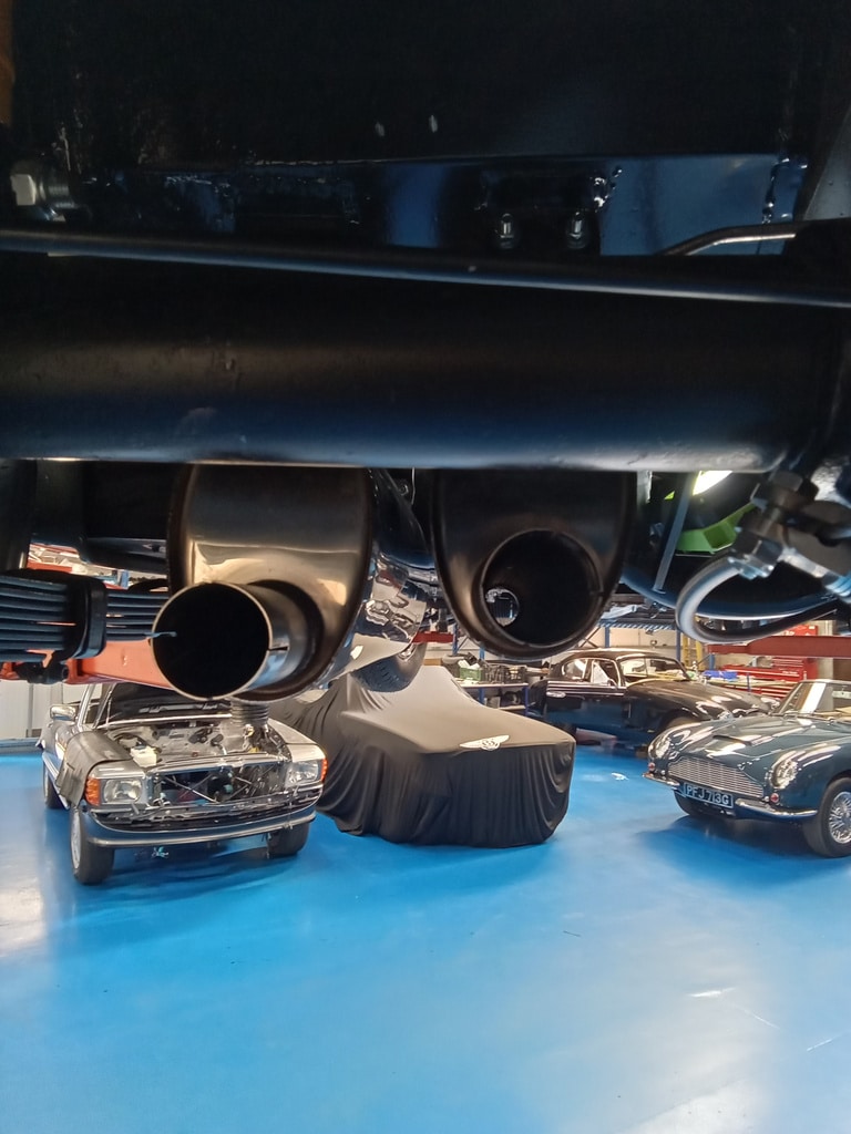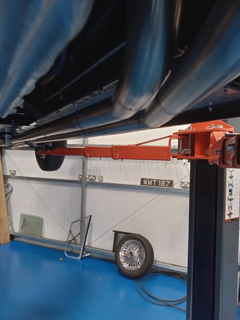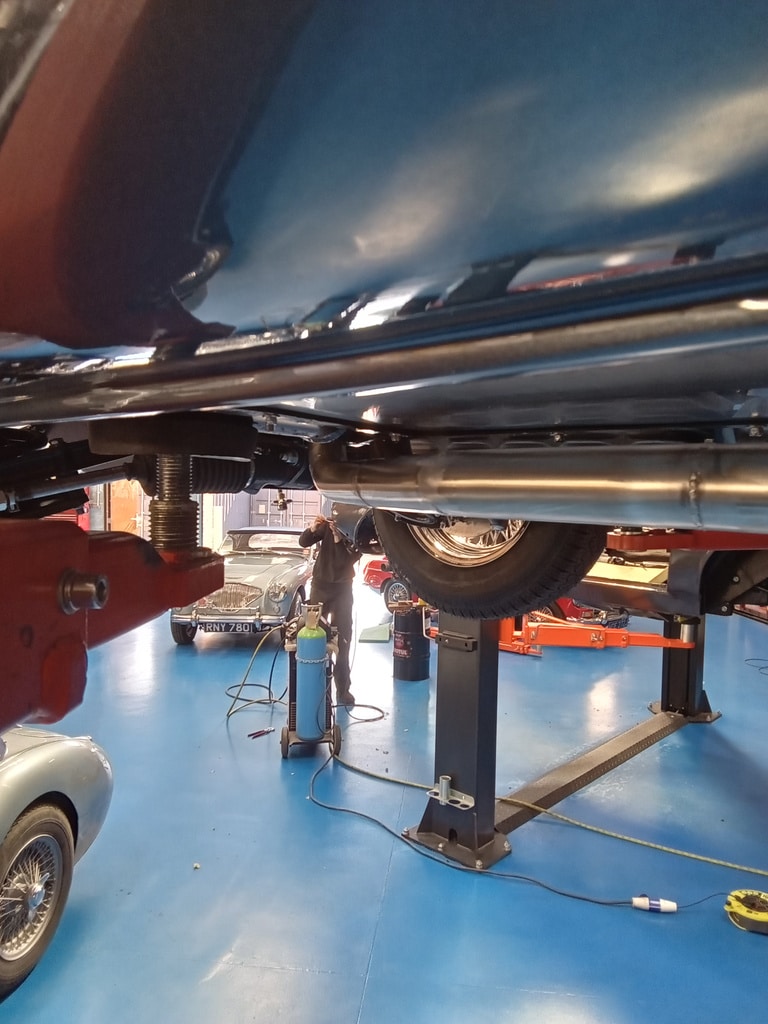 The 1960 Jensen 541R has gone back up on the ramp during this phase of the restoration here at the Bridge Classic Cars restoration workshops. Our technician Rob has had to adjust and rethink the exhaust mounts as he found one of the silencers under the car was out of alignment with the other but it also hung too low.