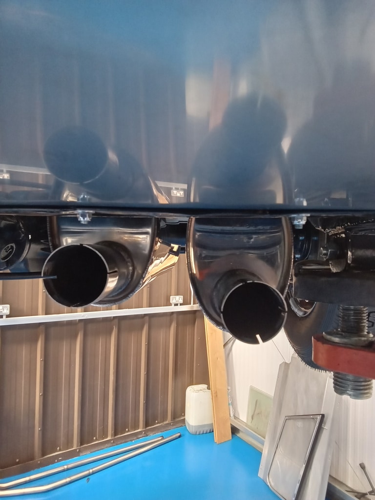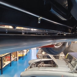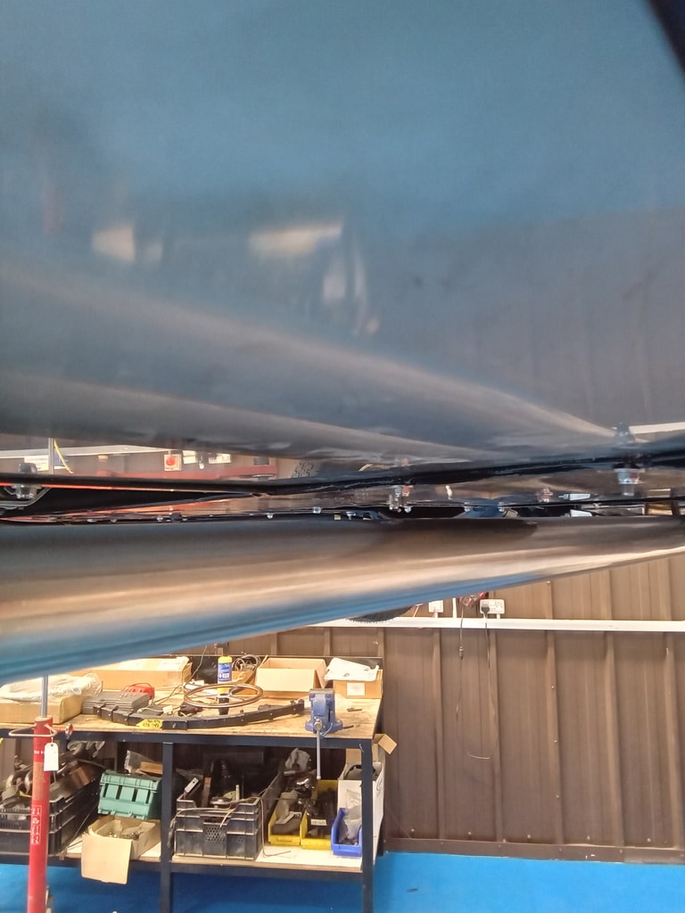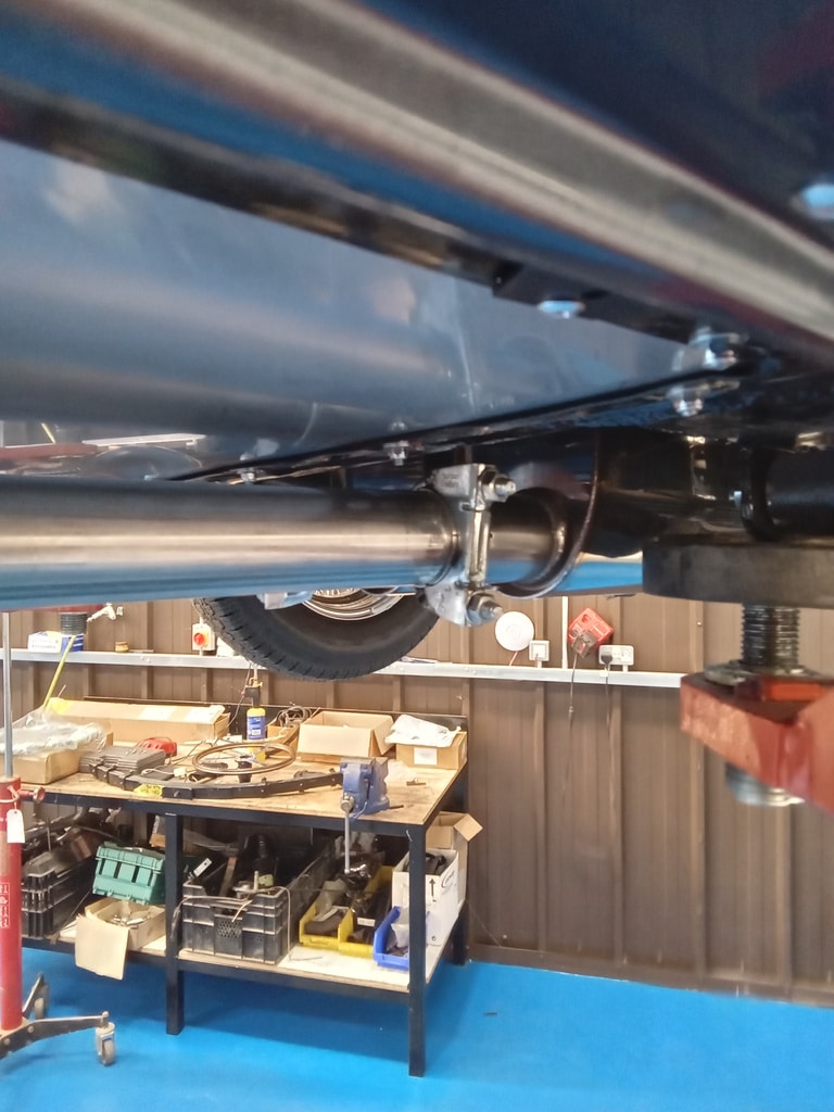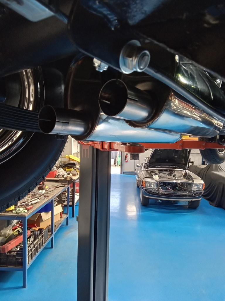 The 1960 Jensen 541R has gone back up on the ramp during this phase of the restoration here at the Bridge Classic Cars restoration workshops. Our technician Rob has had to adjust and rethink the exhaust mounts as he found one of the silencers under the car was out of alignment with the other but it also hung too low.
