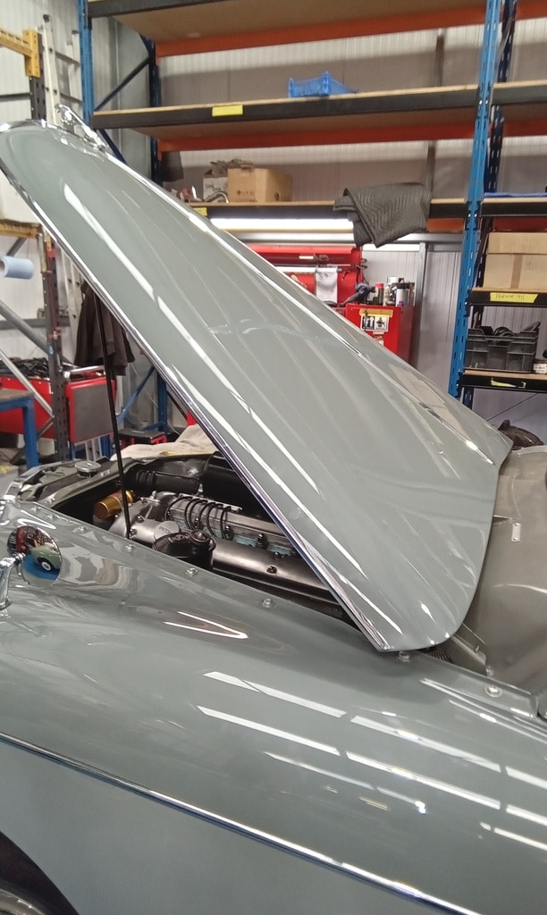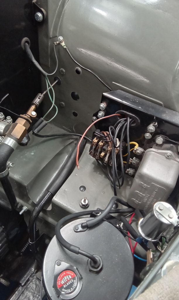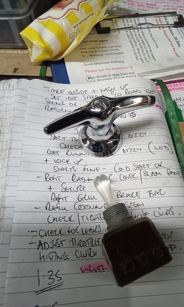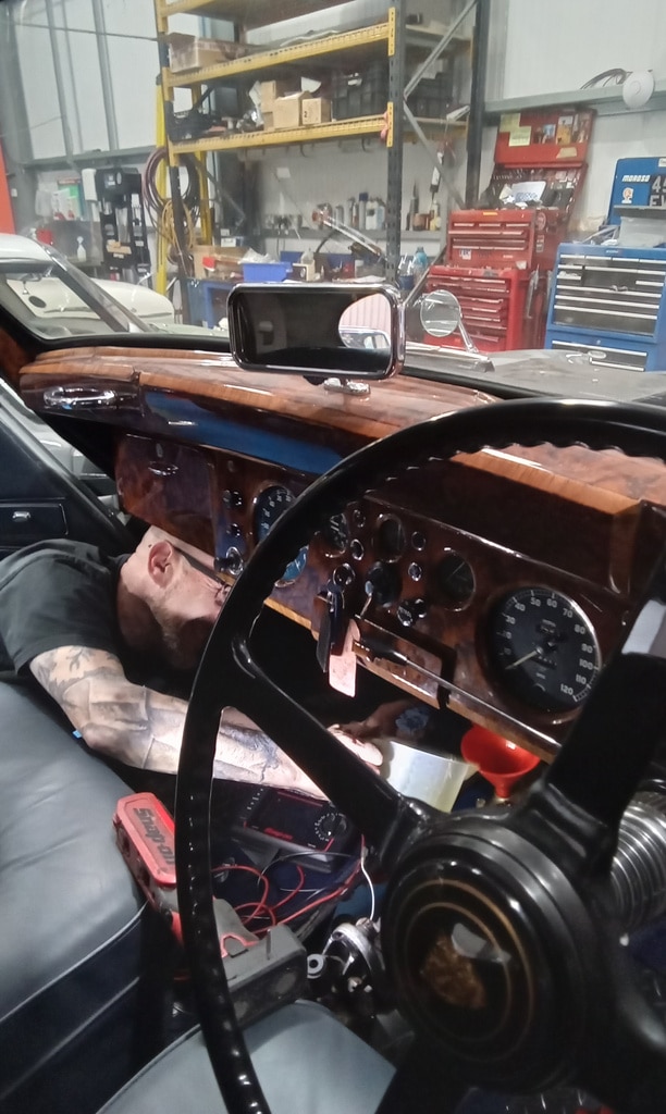 ‘Sort ignition timing and get running. Check spark. Adjust dizzy and set. Starts fine on cold start. Refit radiator and slam panel. Refit grill and brace bar. Refill cooling system manually. Check all hose clips and tighten where required. Check for leaks. Adjust throttle link to stop hitting clutch cable at bulkhead. Finish throttle adjustment and check. Go inside and connect reverse light switch and check wiring from loom for overdrive or inhibitor switch.’