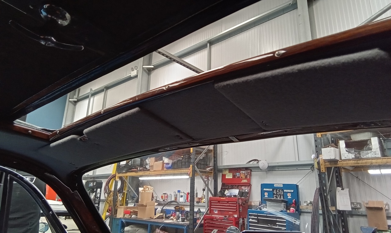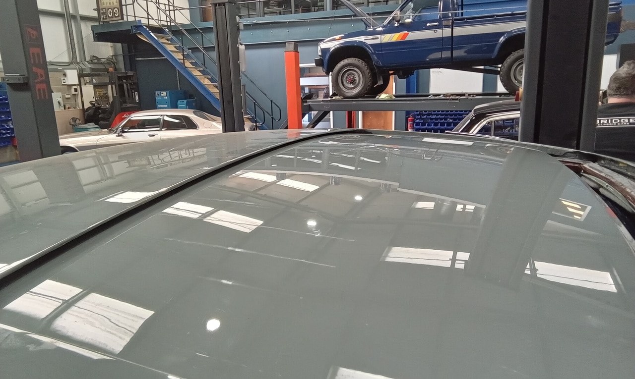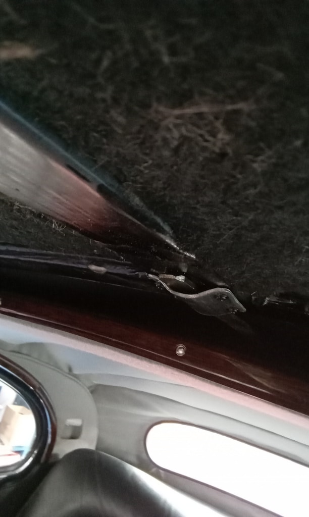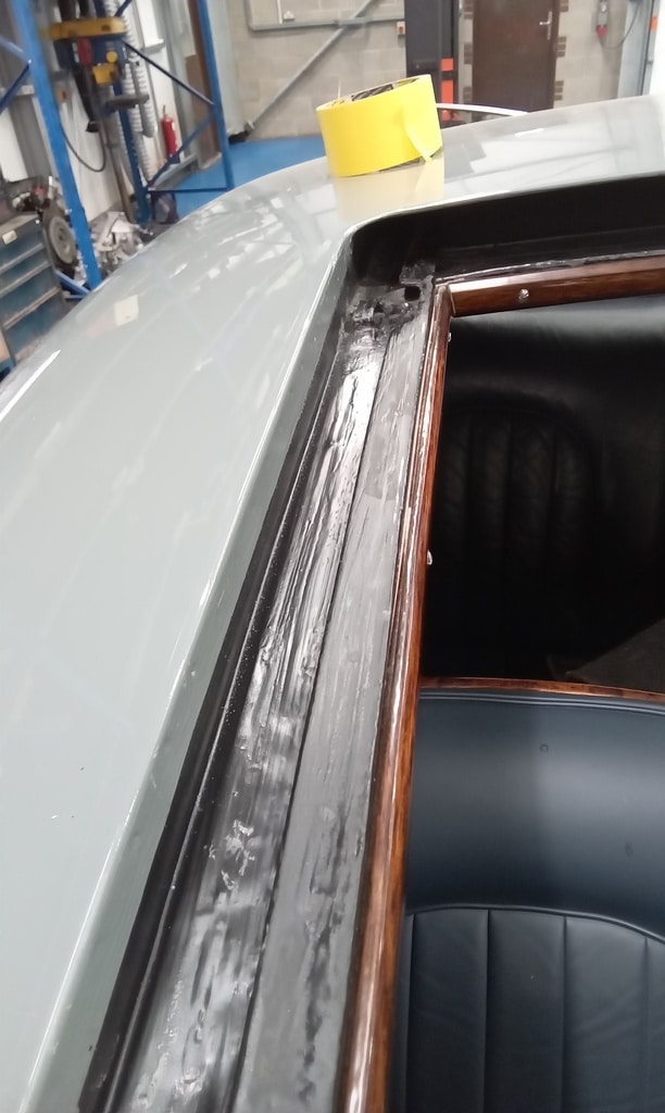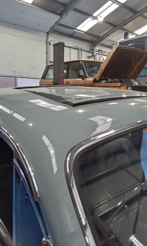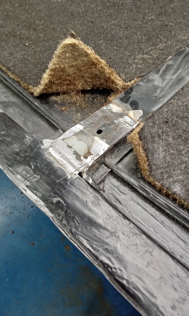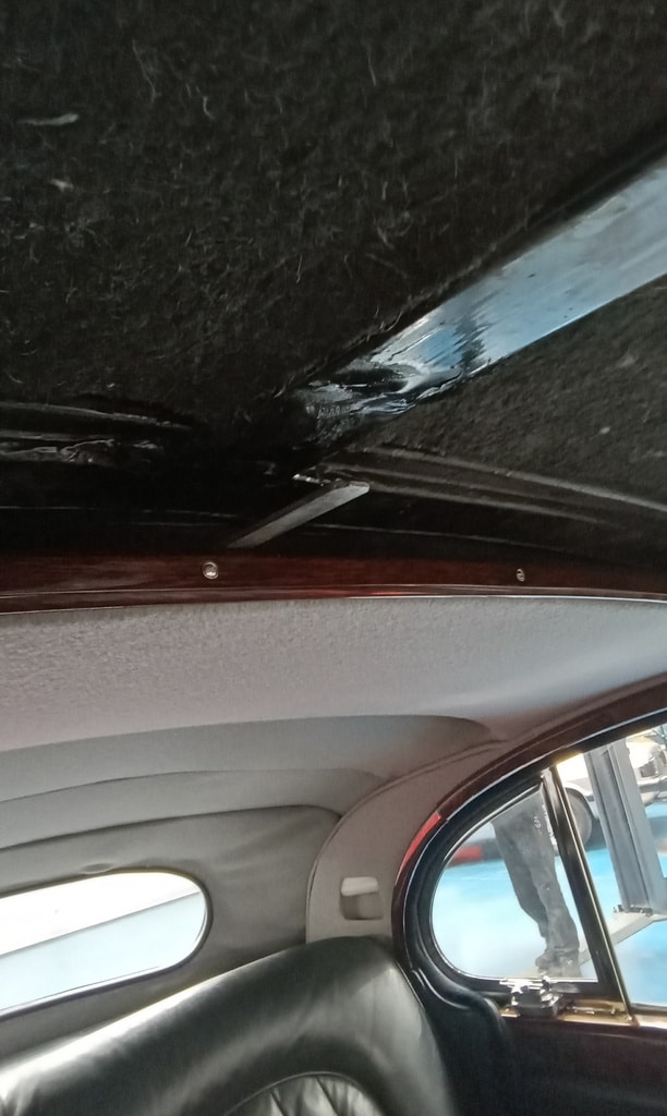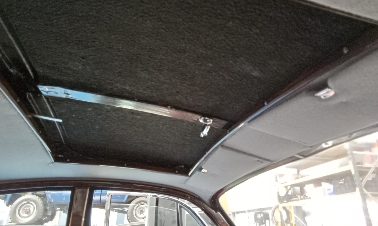 ‘Remove sunroof and remove trim. Cut open sunroof frame to gain access to mechanism. Reconnect linkage inside and get working. Get rob to reweld roof frame. Paint black. Tap out holes for guides and cut down 5mm bolts to fit. Tape edges of roof to protect when fitting. Reinstall roof. Fit and secure guides and grease up. Mak small bracket for rear guide and fit. Remove sunroof as unable to fit trim in situ. Fit off car and reinstall roof. Adjust guides and test. Works OK but don’t secure yet incase we have to have it out and paint it.’