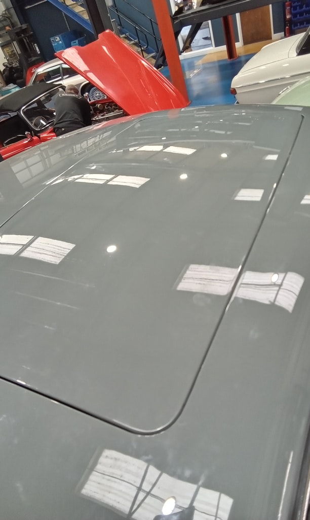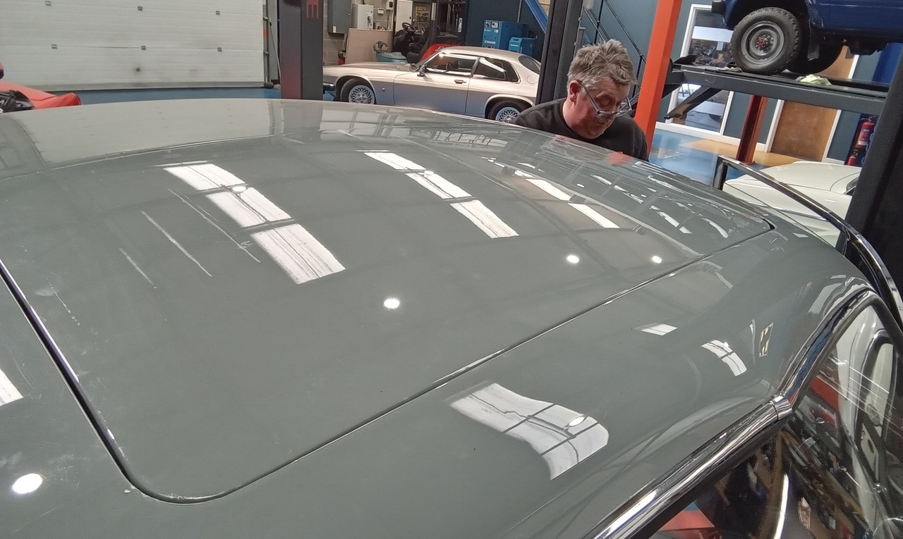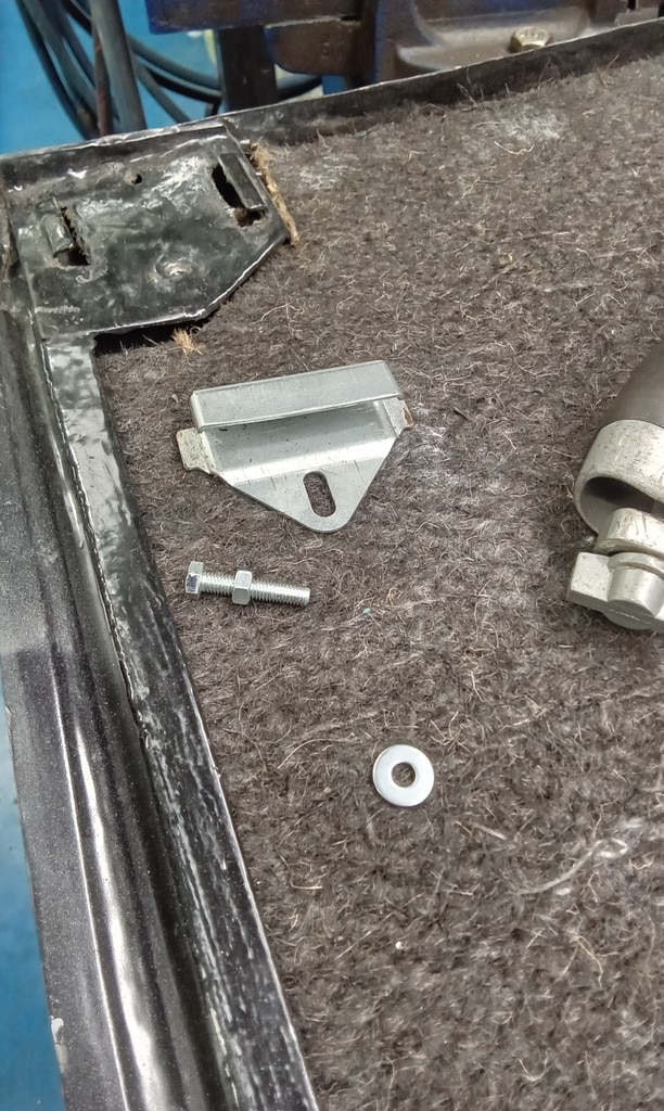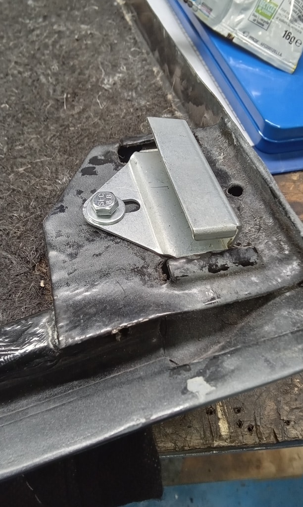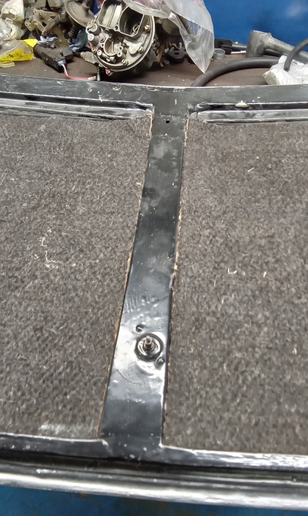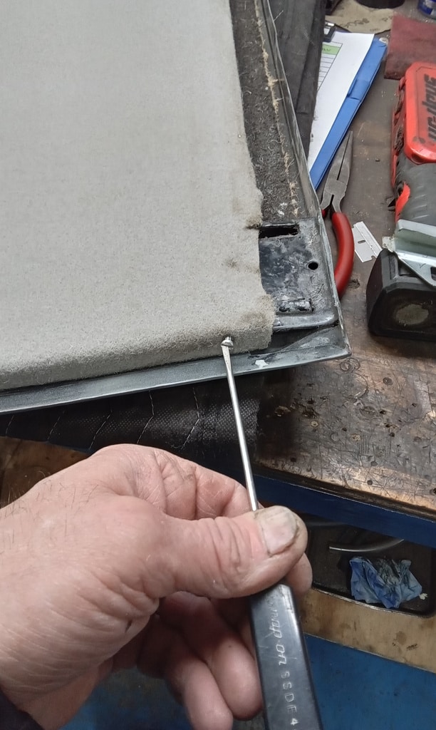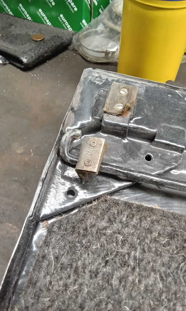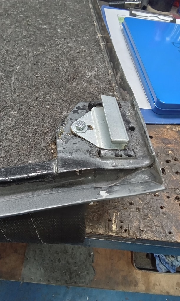 ‘Remove sunroof and remove trim. Cut open sunroof frame to gain access to mechanism. Reconnect linkage inside and get working. Get rob to reweld roof frame. Paint black. Tap out holes for guides and cut down 5mm bolts to fit. Tape edges of roof to protect when fitting. Reinstall roof. Fit and secure guides and grease up. Mak small bracket for rear guide and fit. Remove sunroof as unable to fit trim in situ. Fit off car and reinstall roof. Adjust guides and test. Works OK but don’t secure yet incase we have to have it out and paint it.’