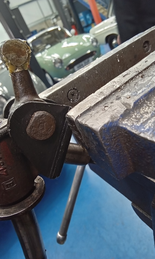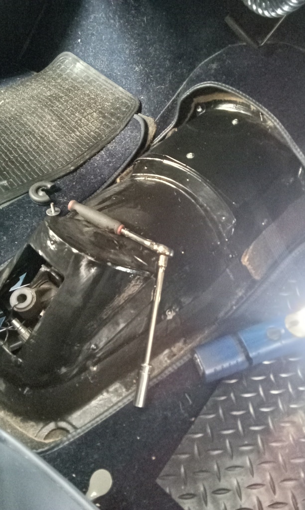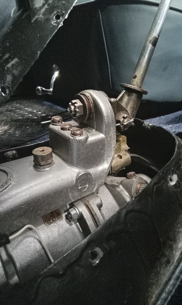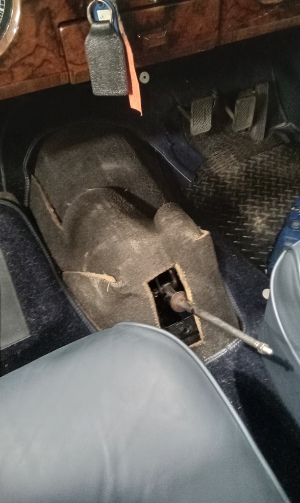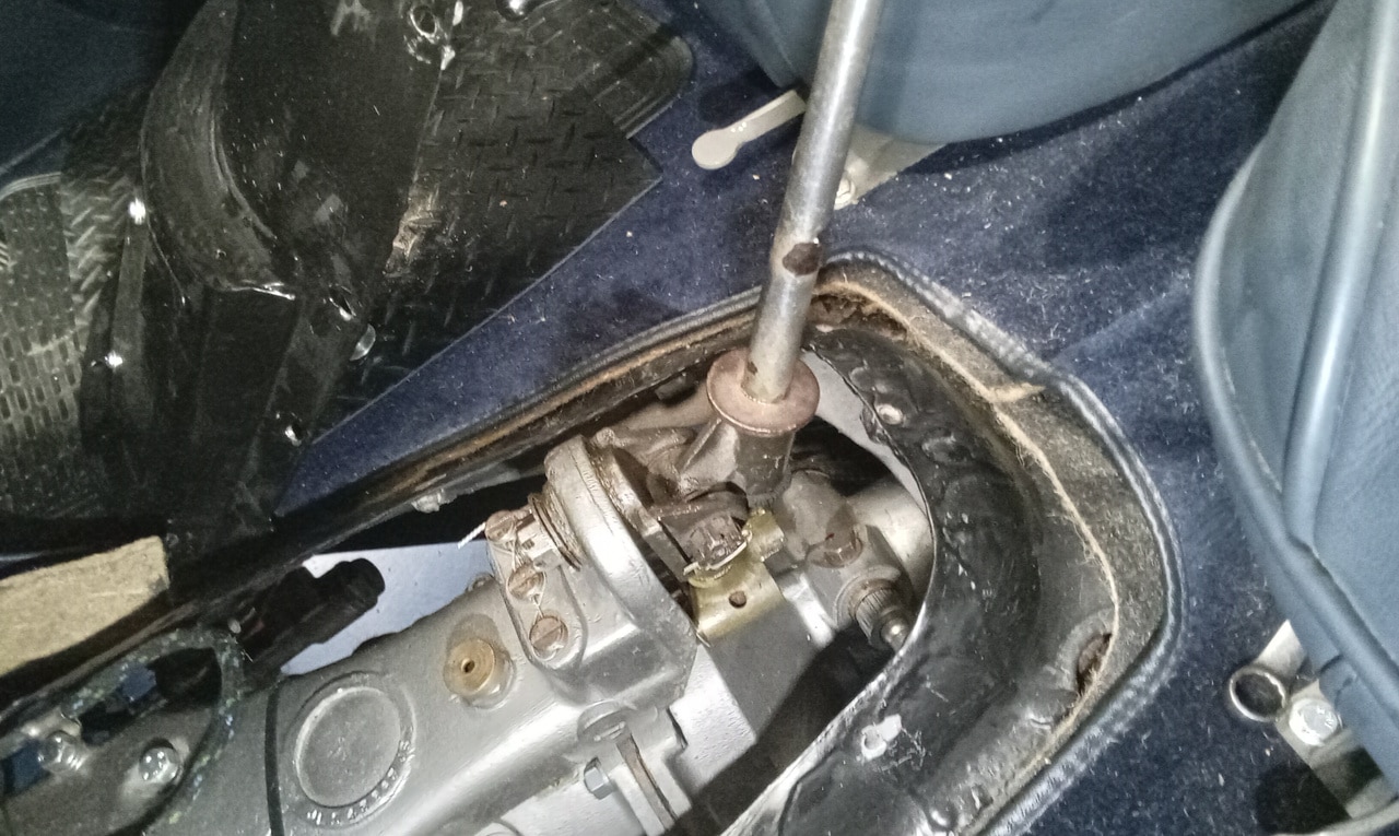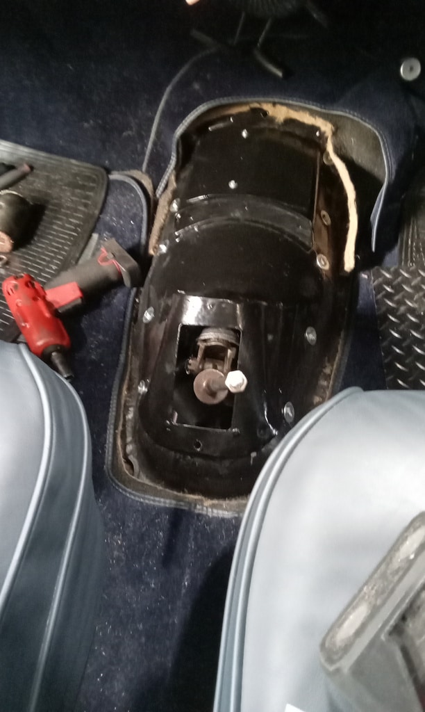 ‘Remove gearlever mount. Swap over to old one. Clean and lube. Secure mount and lever in bracket. Secure and fit split pins. Mount to gearbox and test. Raise car and start up. Run through all gears and reverse ok. Lower and refit tunnel with new bolts and refit carpet. Refit bonnet and test.’