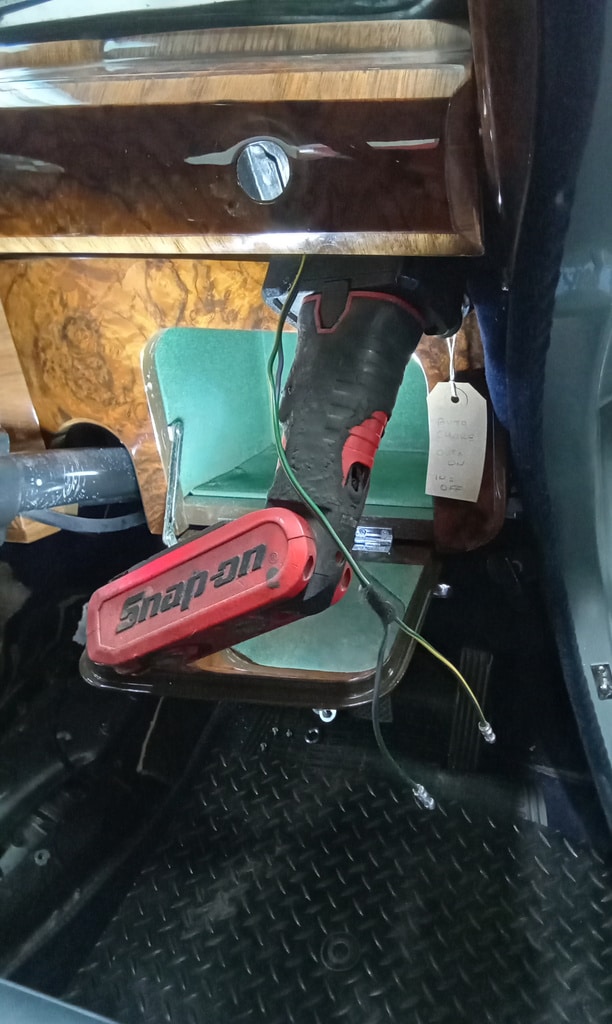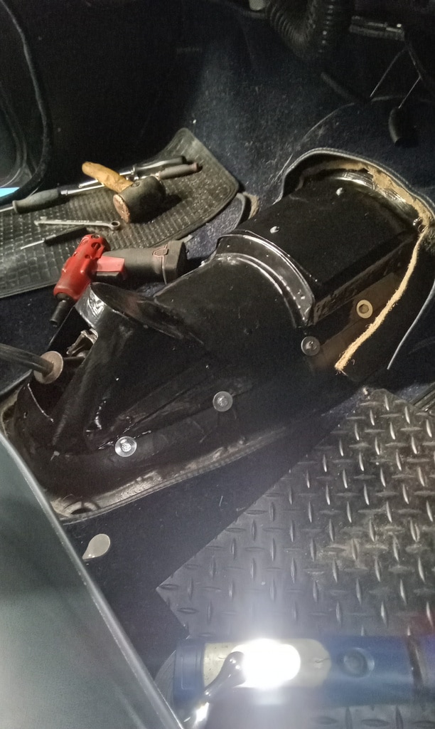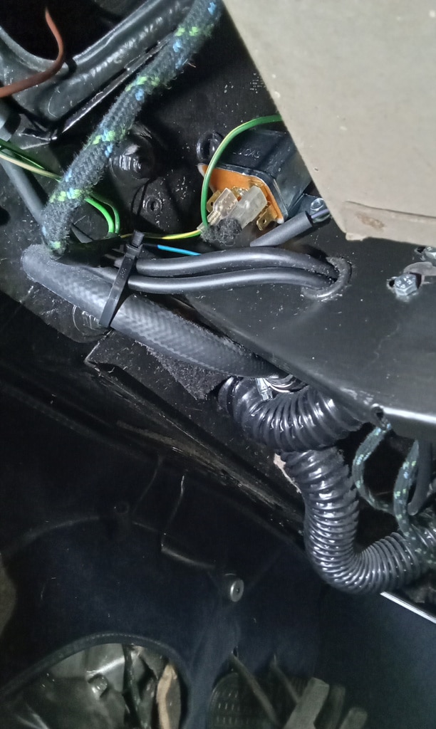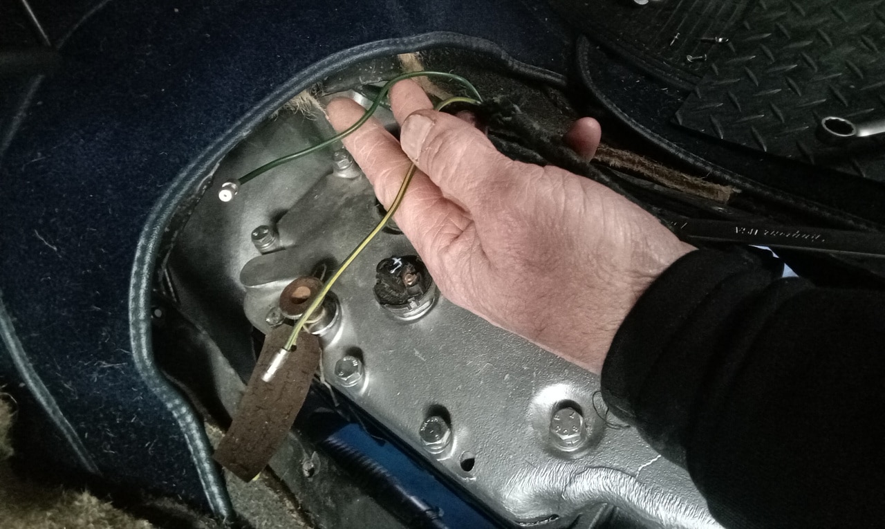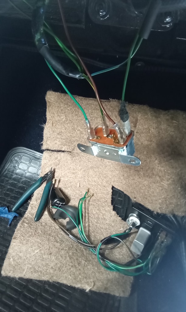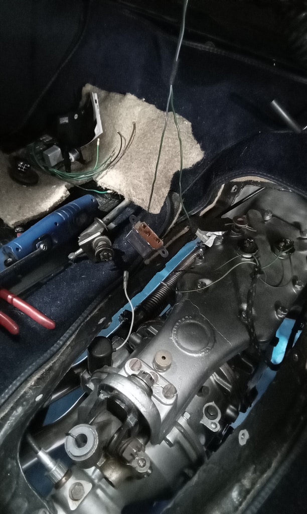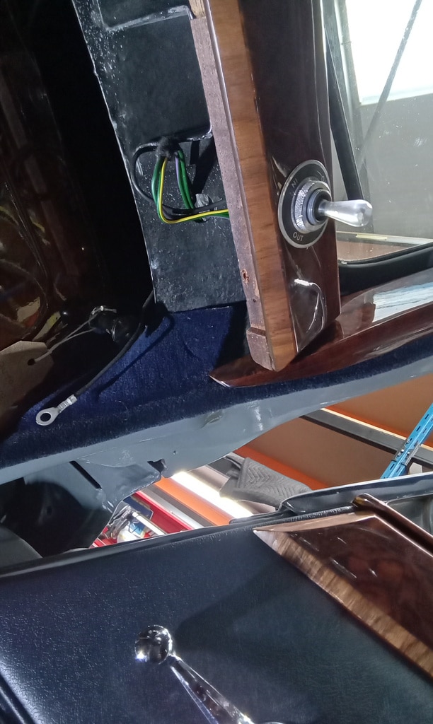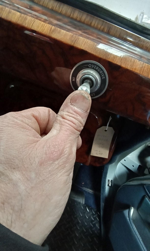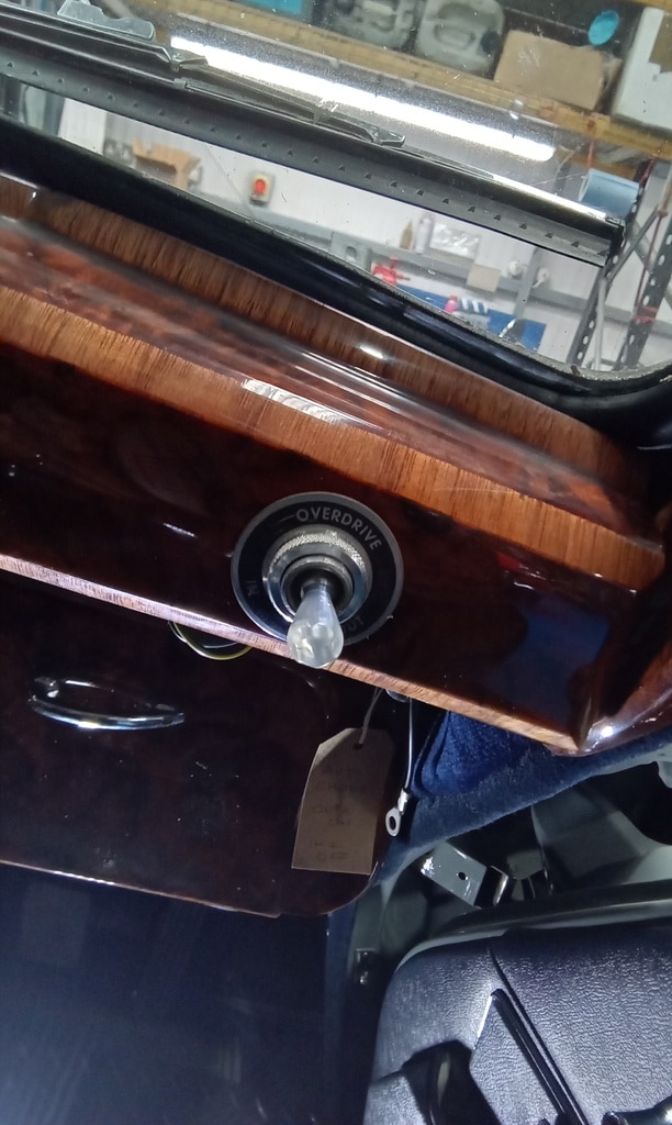 ‘Wire in overdrive. Cut open new loom and select wires I need, as part of loom already on car. Wire in switch, to and from nearside and wire in earth for switch. Mount switch in dash. Make wires from gearbox switch to earth. Connect to relay and to solenoid. Secure wiring. Find permanent 12v feed from fuse box and feed wires through into car. Crimp on terminals where required and connect to relay. Find ignition live at fuse box and repeat. Once all connected turn isolator on and ignition and test solenoid. Working fine. Refit trim andtunnel but noticed gear lever mount not fully secure on gearbox so remove tunnel again.‘