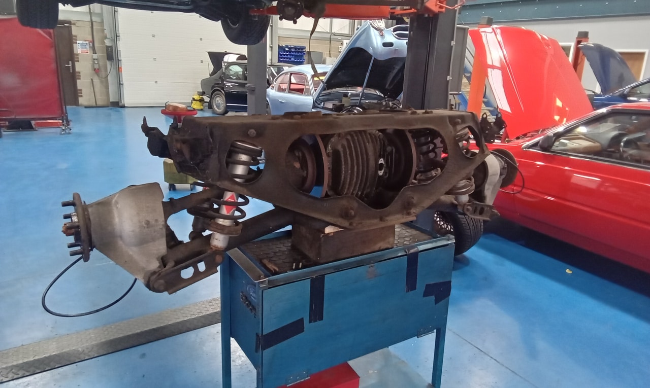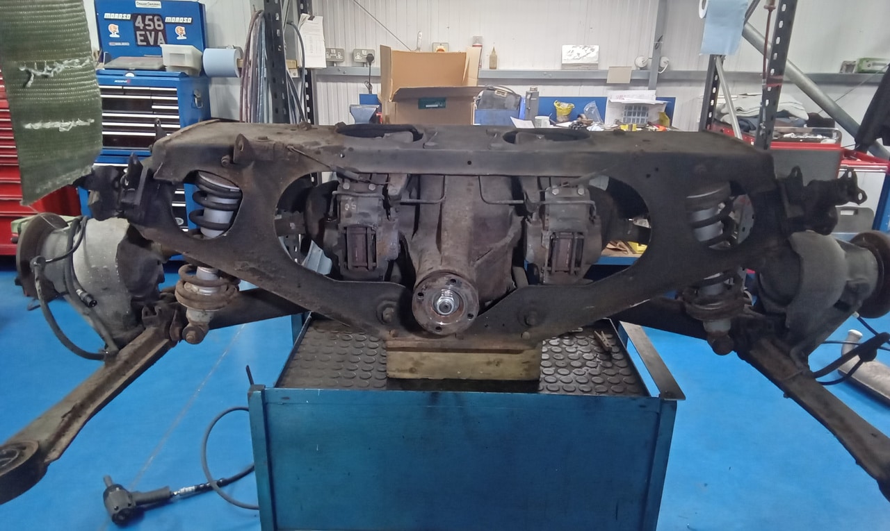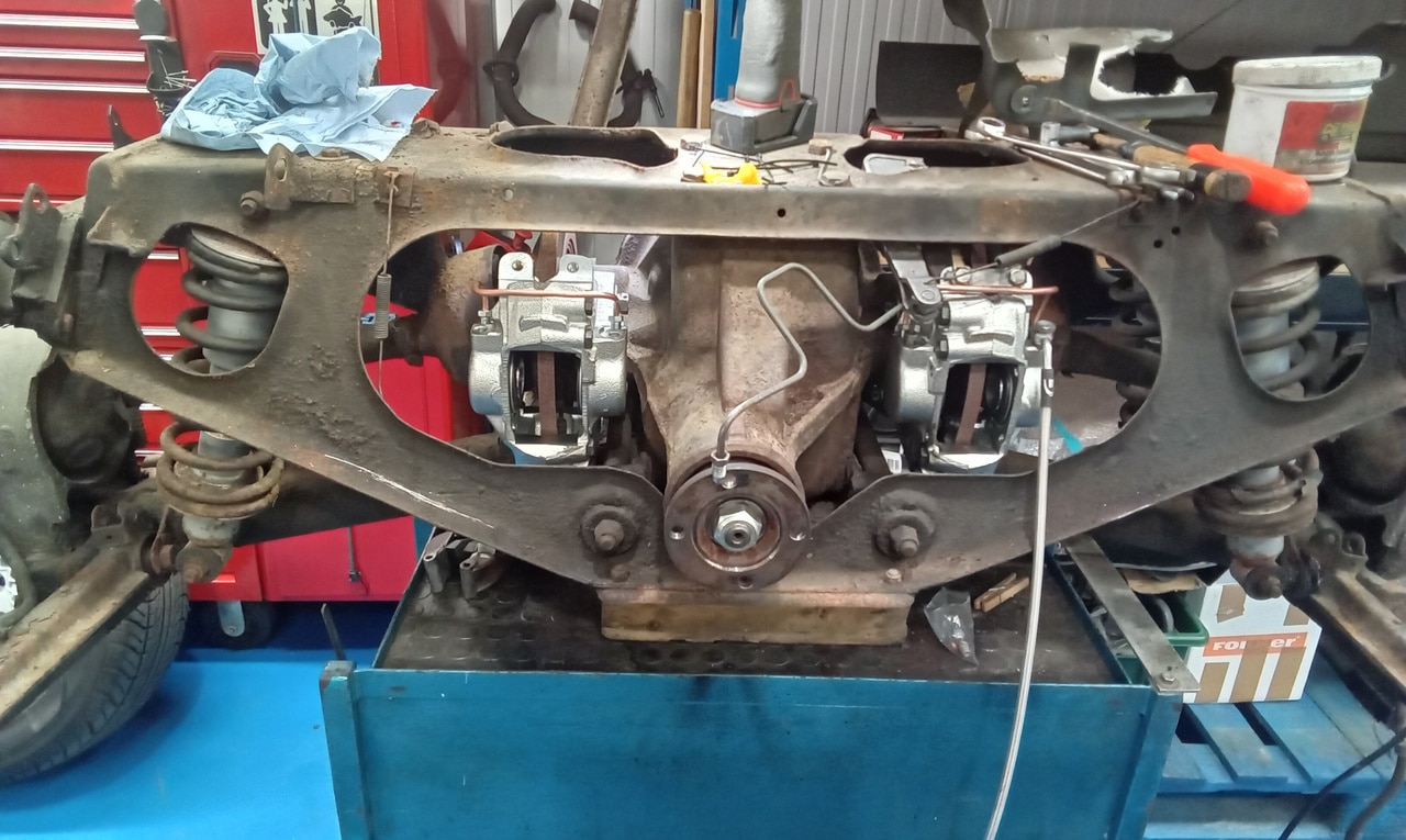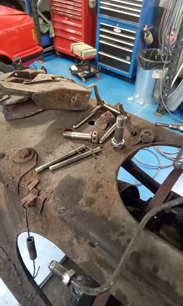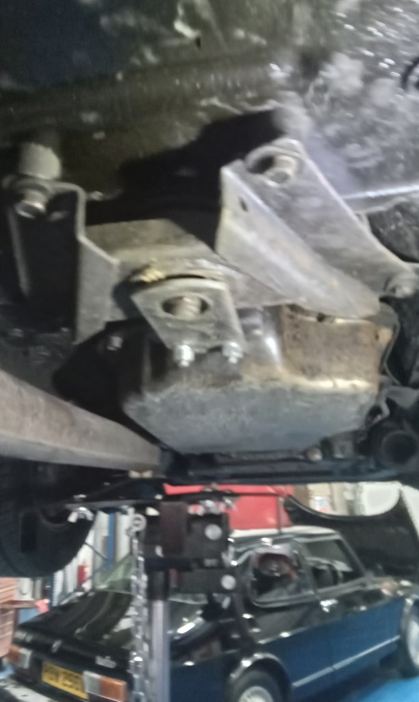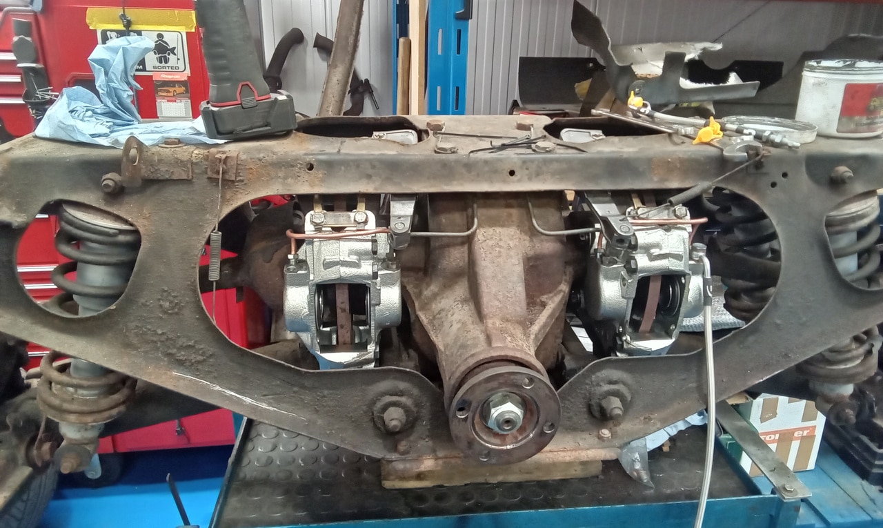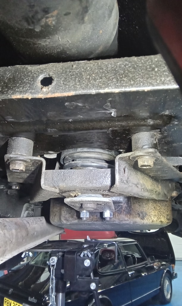 Strip and fit offside rear axle mount. Strip nearside trailing arm and press out old and press in new bush Clean handbrake calipers and all associated parts to be re used. Clean all mounting bolts and find replacement for incorret one fitted to nearside. Strop and remove gearbox mount.”