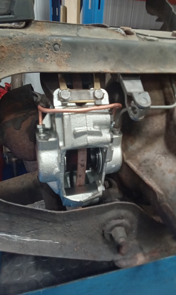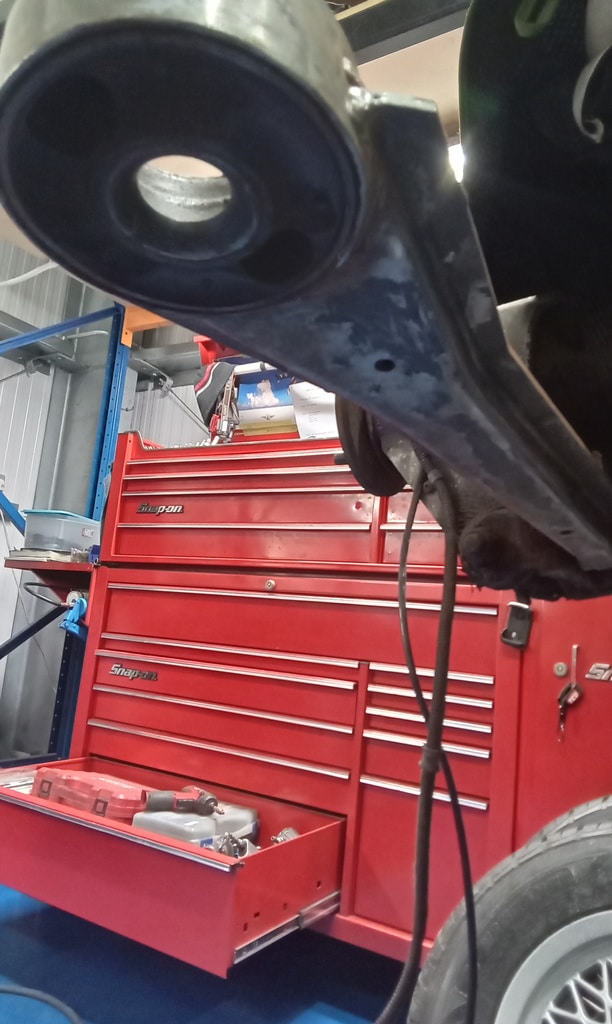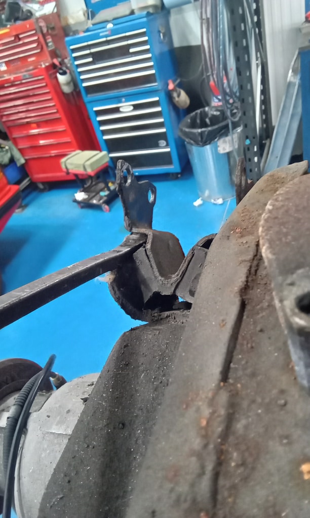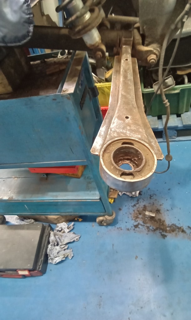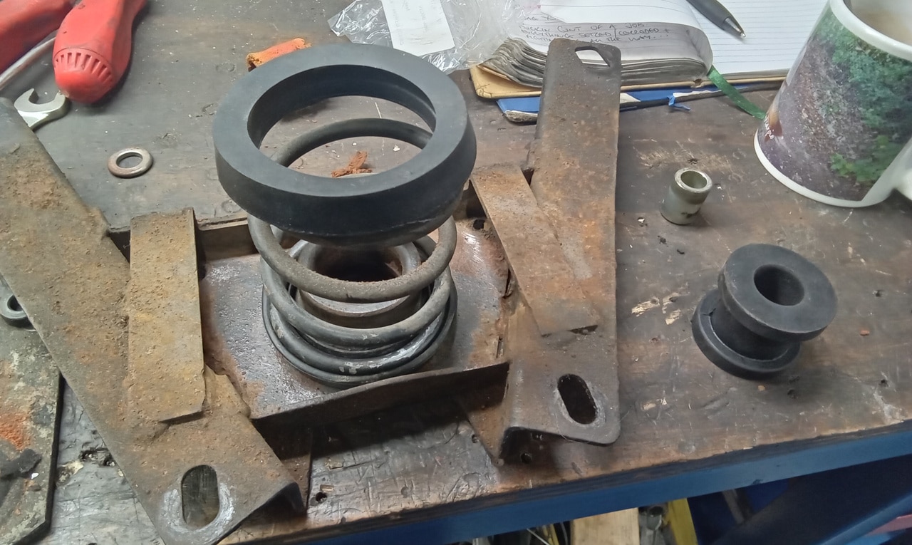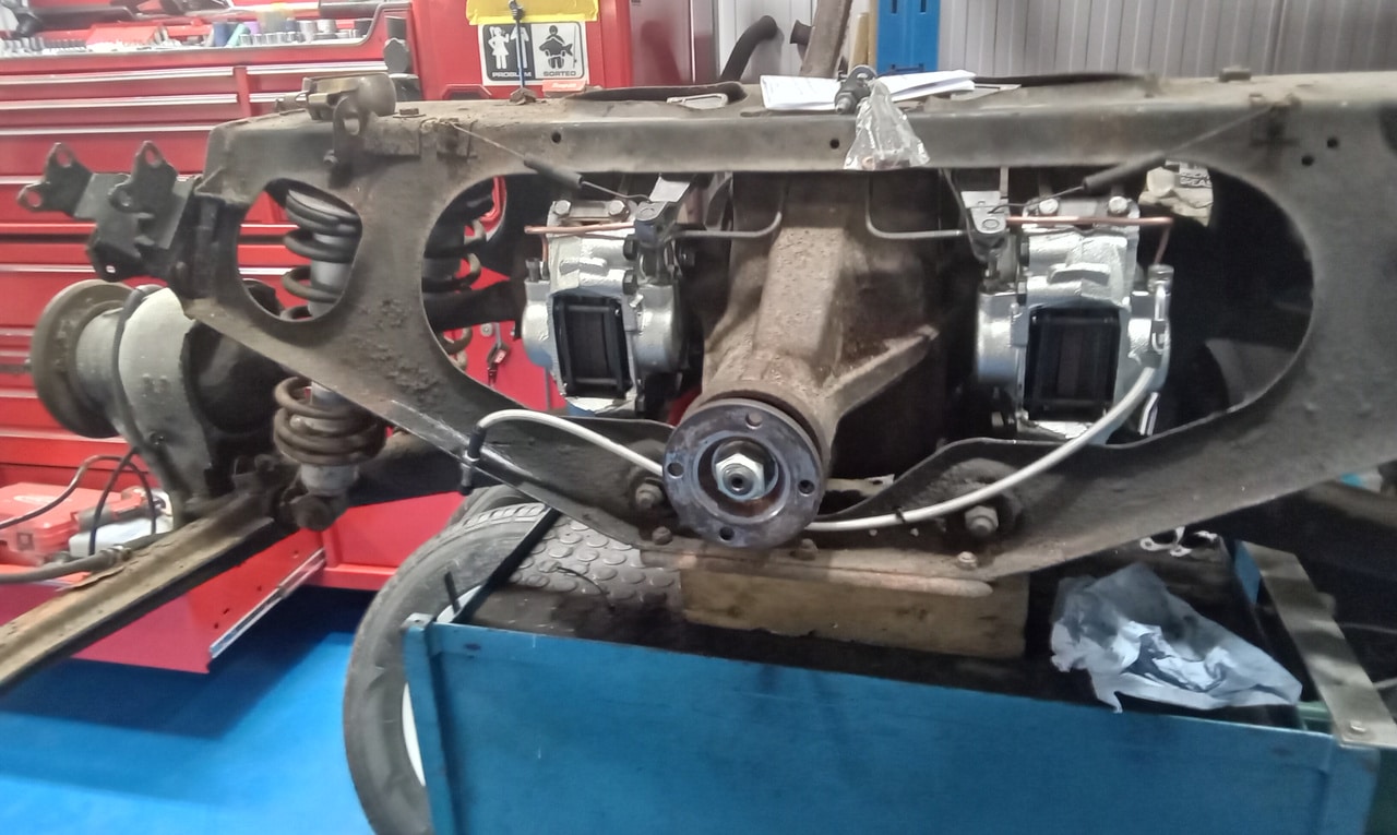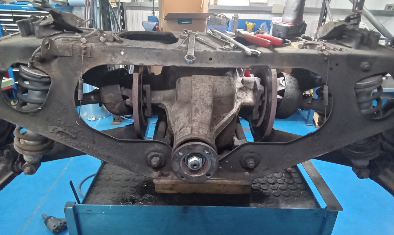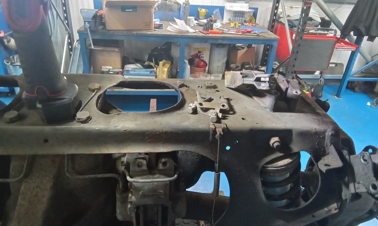 Strip and fit offside rear axle mount. Strip nearside trailing arm and press out old and press in new bush Clean handbrake calipers and all associated parts to be re used. Clean all mounting bolts and find replacement for incorret one fitted to nearside. Strop and remove gearbox mount.”