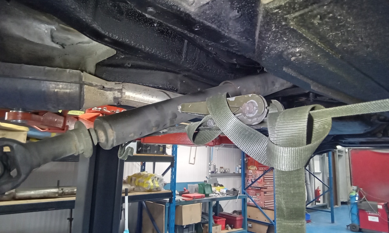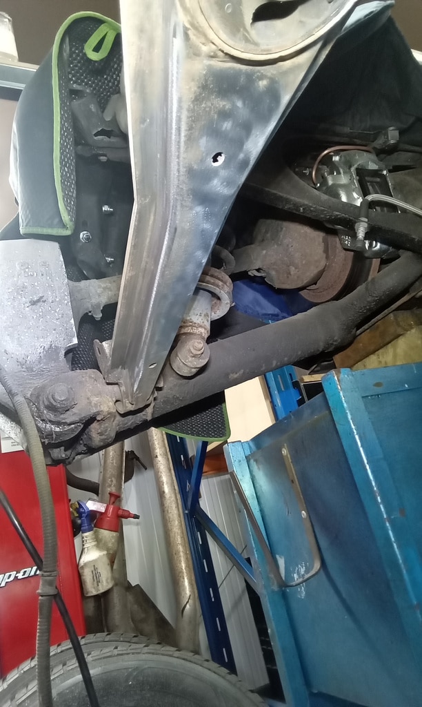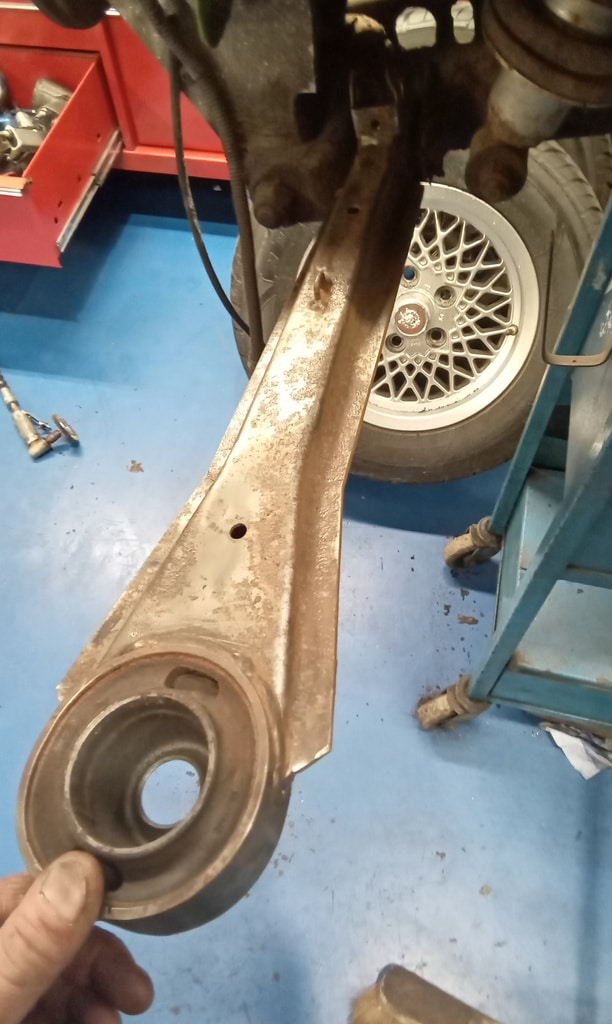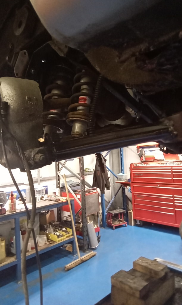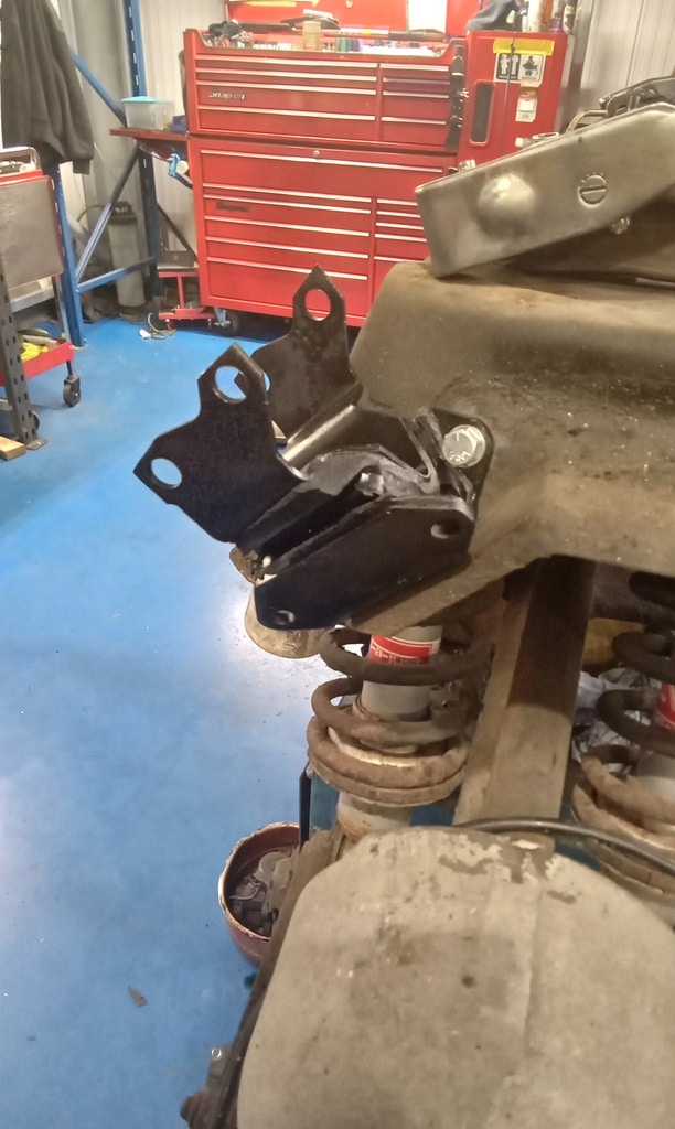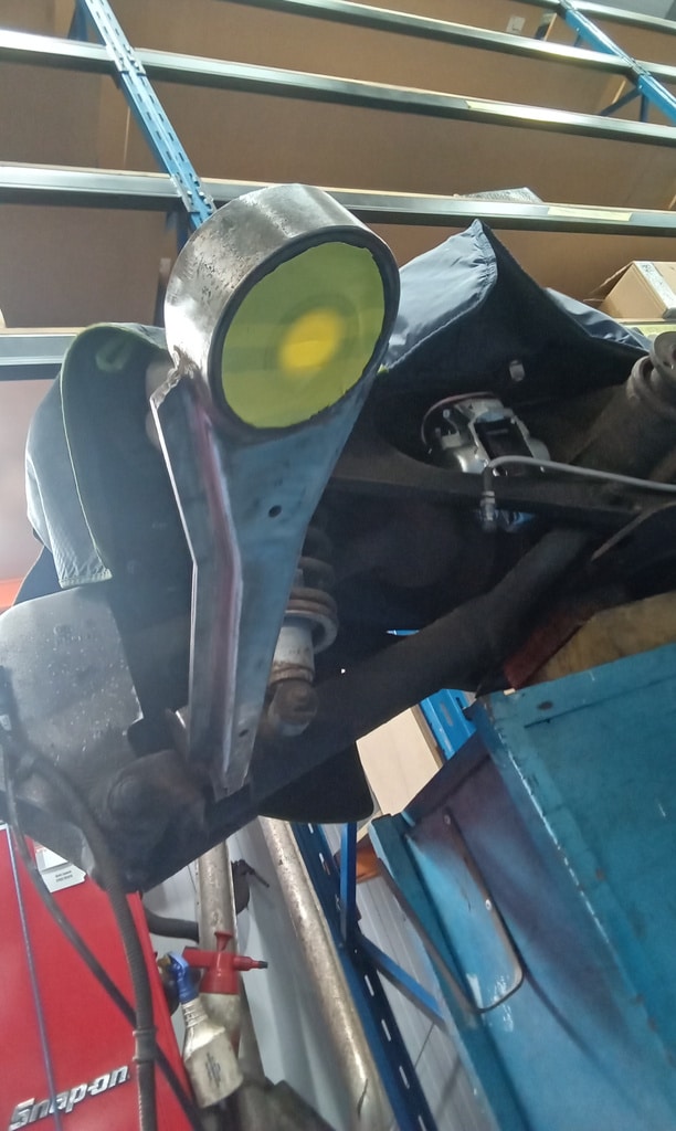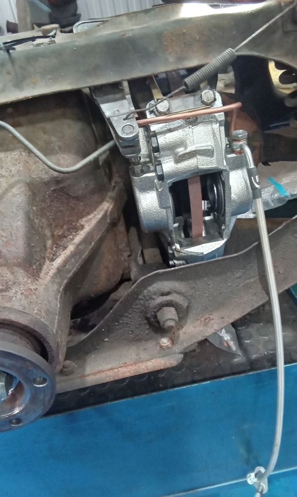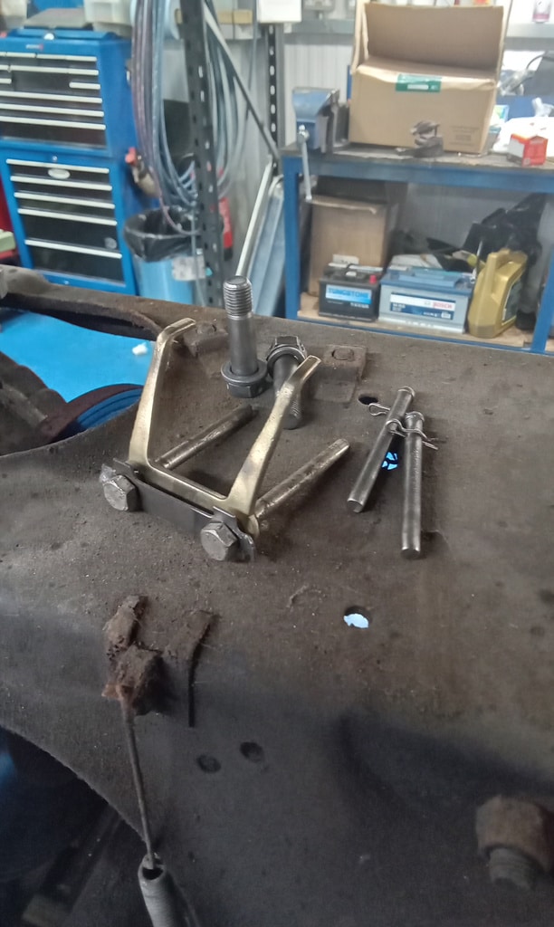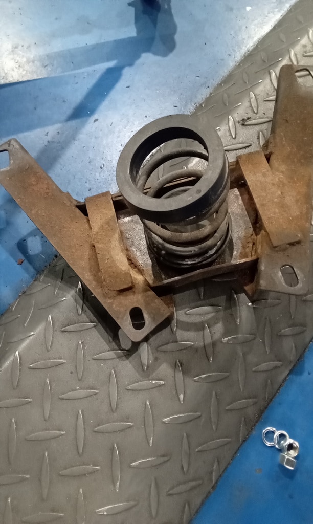 Strip and fit offside rear axle mount. Strip nearside trailing arm and press out old and press in new bush Clean handbrake calipers and all associated parts to be re used. Clean all mounting bolts and find replacement for incorret one fitted to nearside. Strop and remove gearbox mount.”