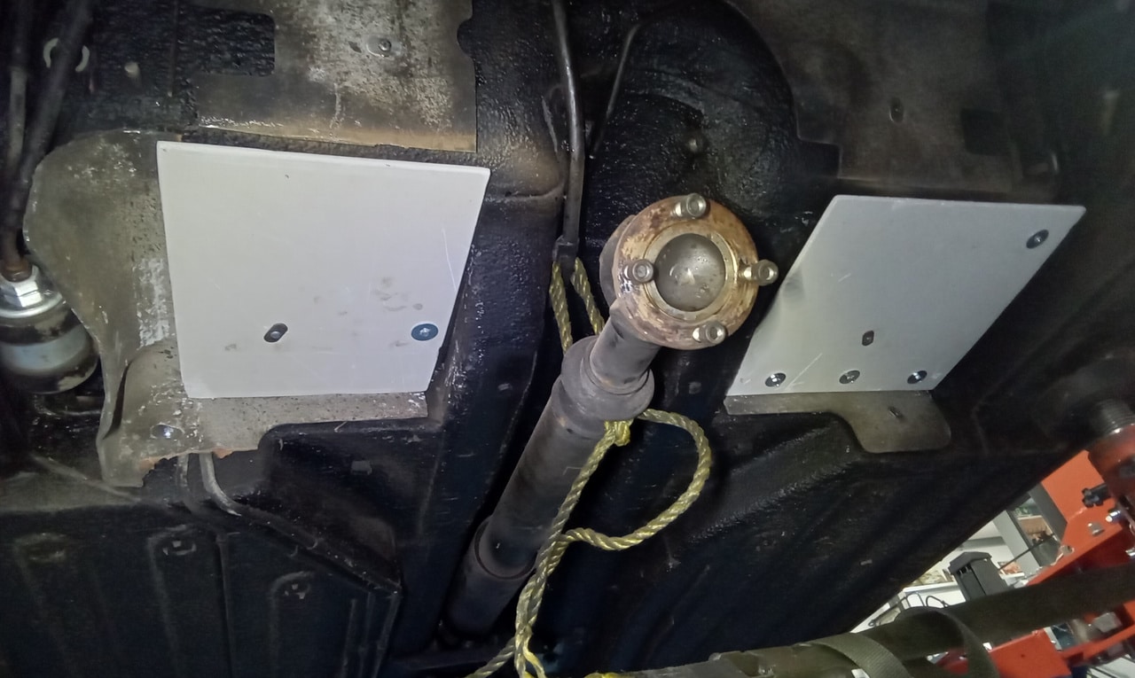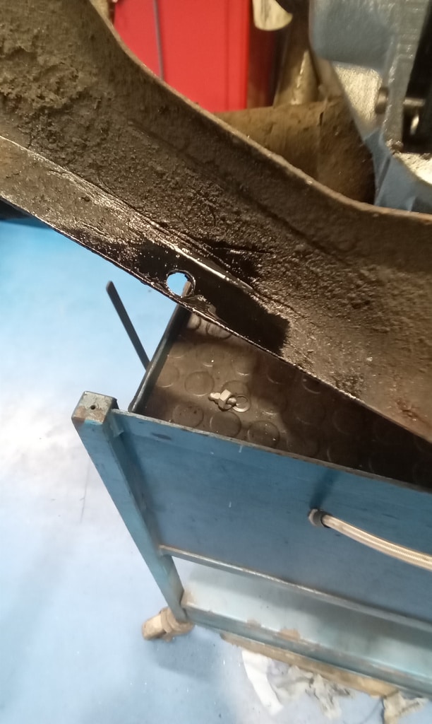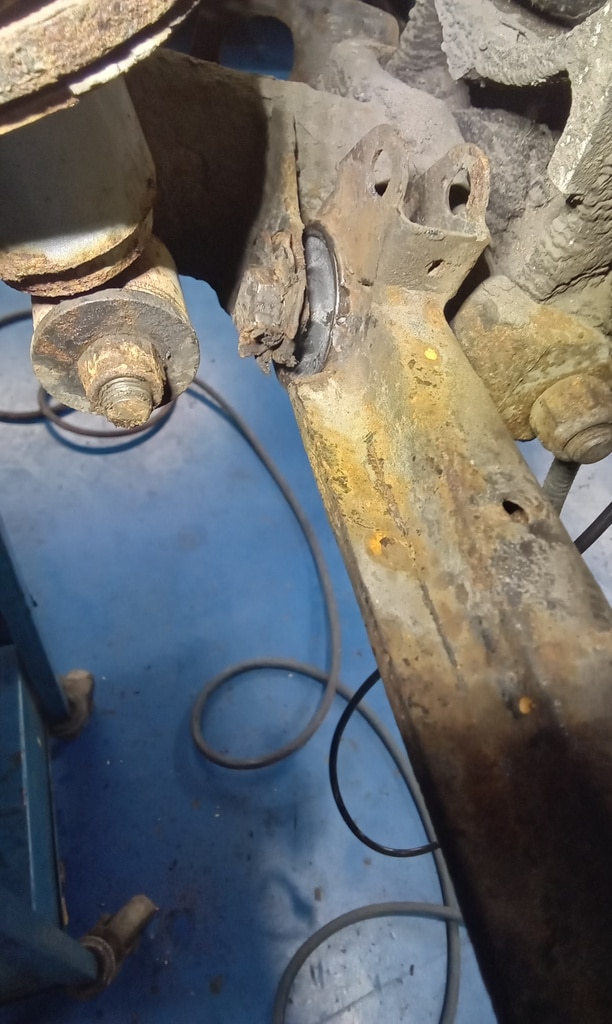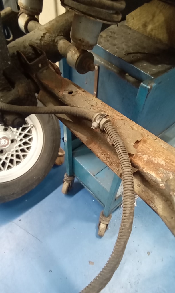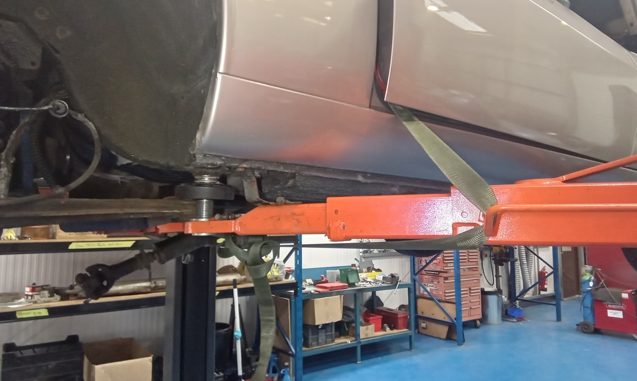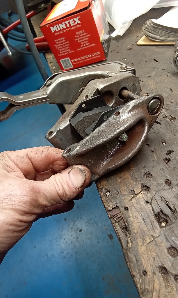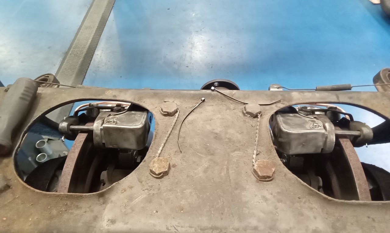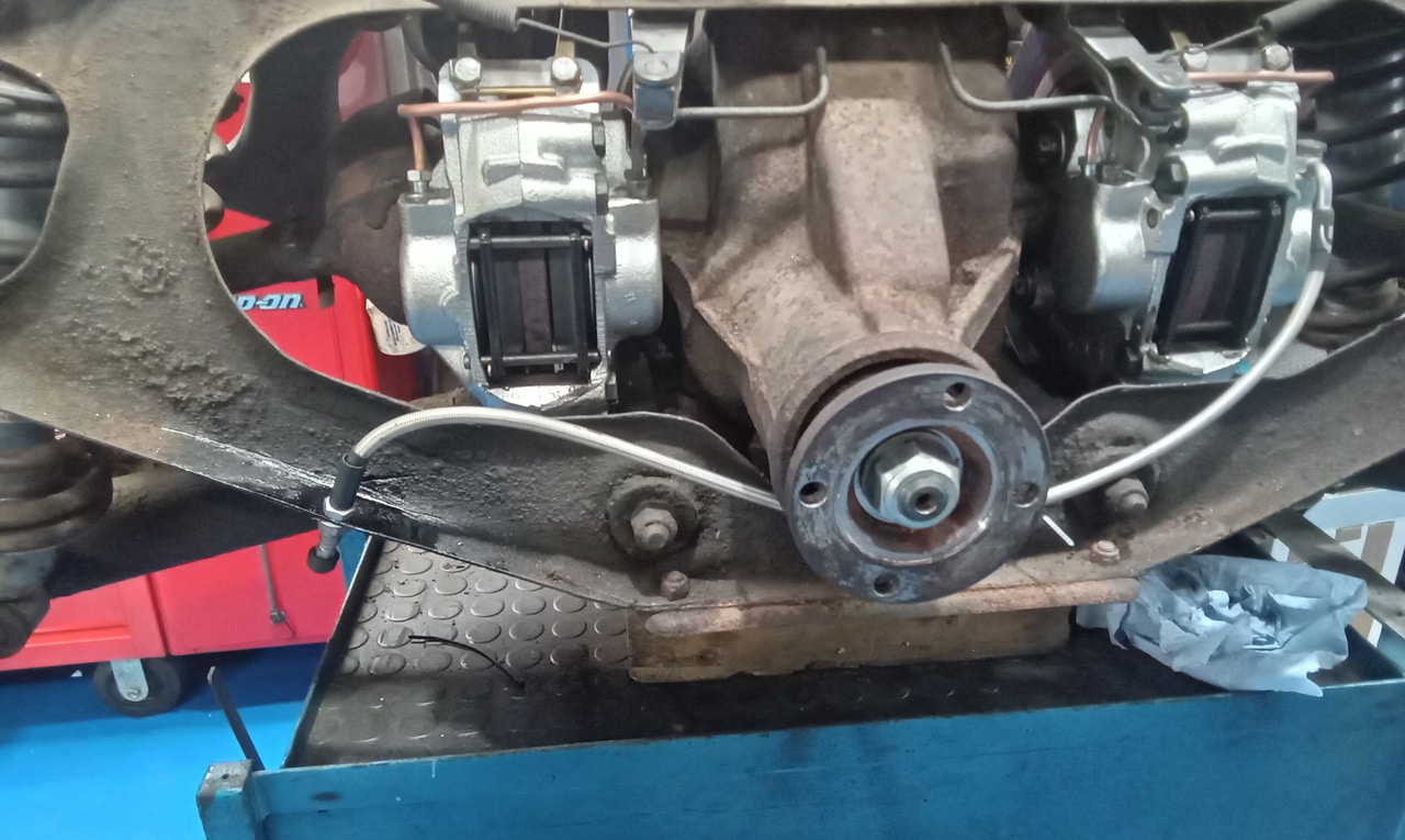 Strip and fit offside rear axle mount. Strip nearside trailing arm and press out old and press in new bush Clean handbrake calipers and all associated parts to be re used. Clean all mounting bolts and find replacement for incorret one fitted to nearside. Strop and remove gearbox mount.”