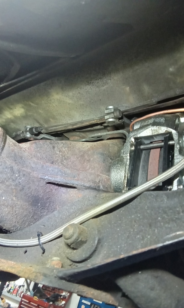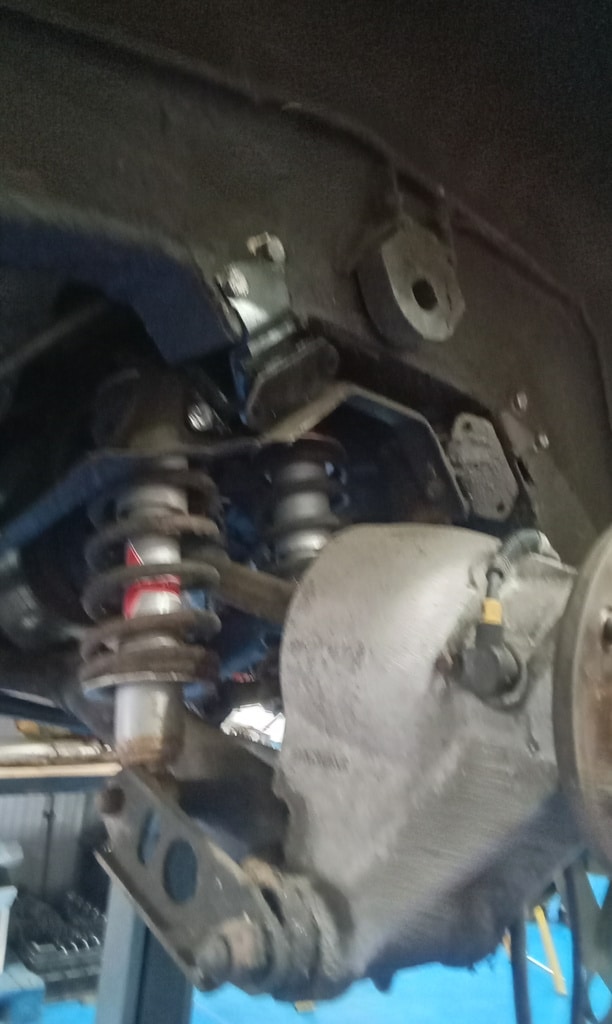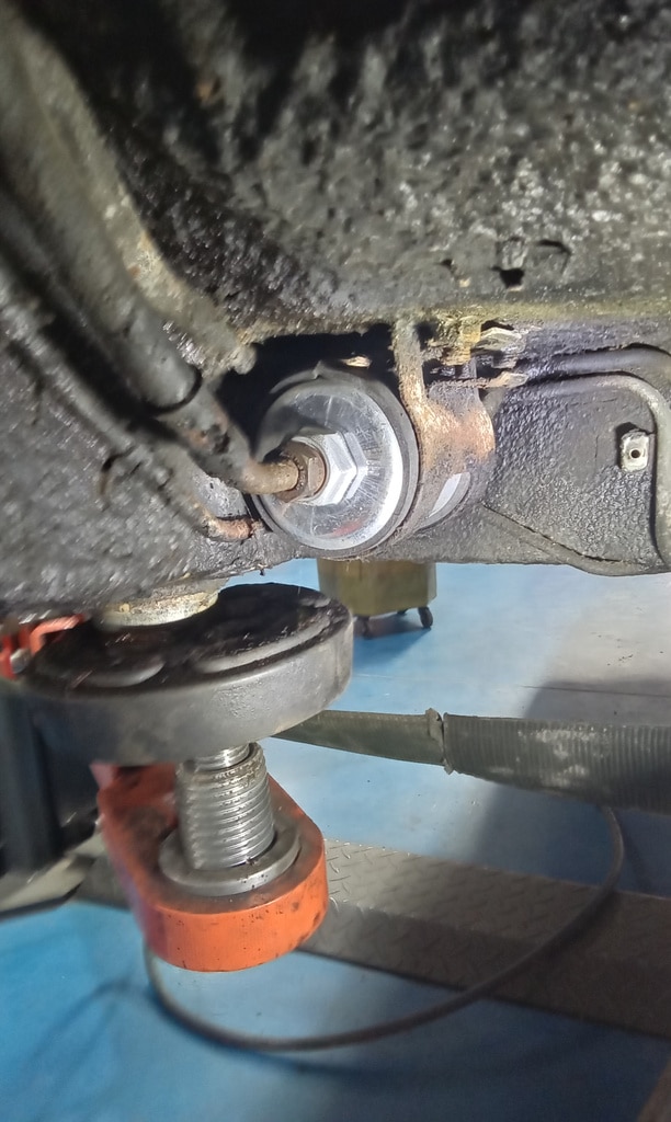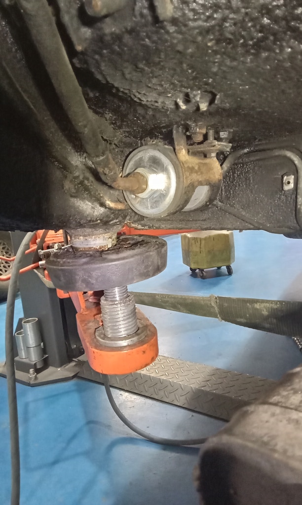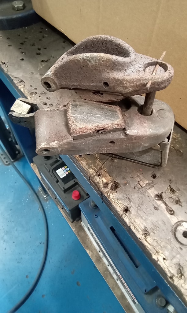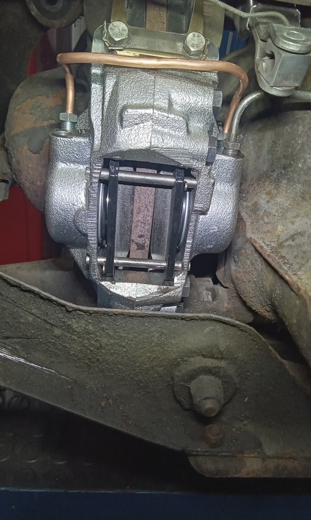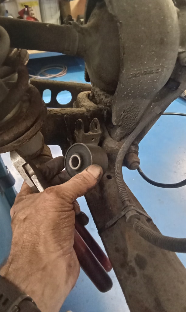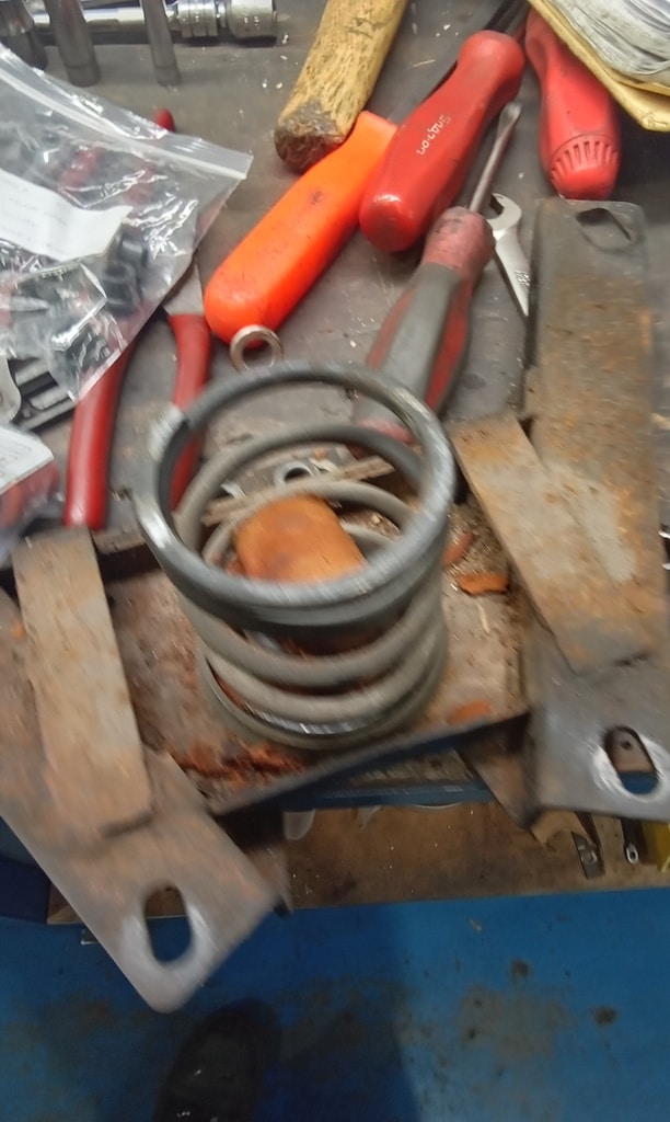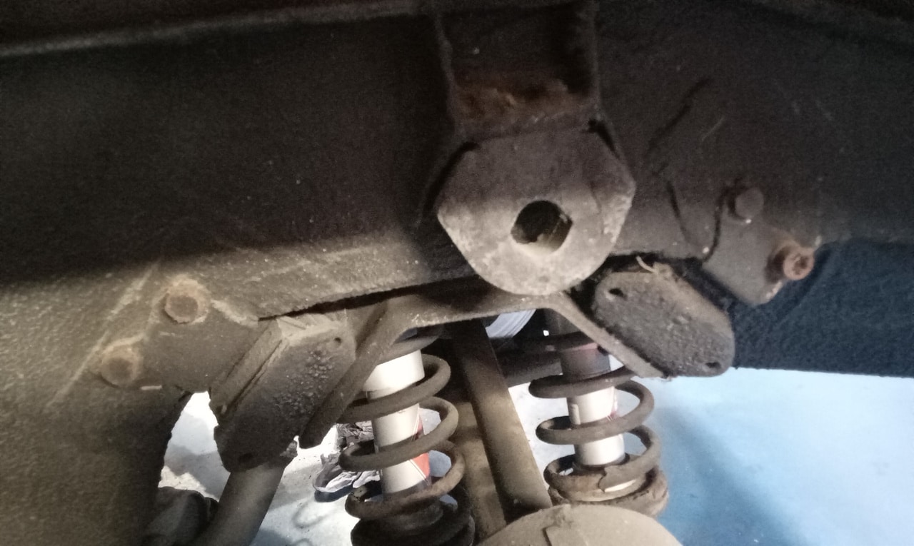Strip and fit offside rear axle mount. Strip nearside trailing arm and press out old and press in new bush Clean handbrake calipers and all associated parts to be re used. Clean all mounting bolts and find replacement for incorret one fitted to nearside. Strop and remove gearbox mount.”
