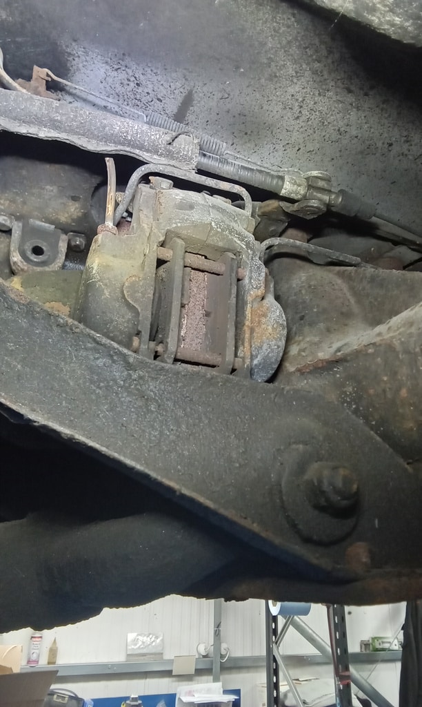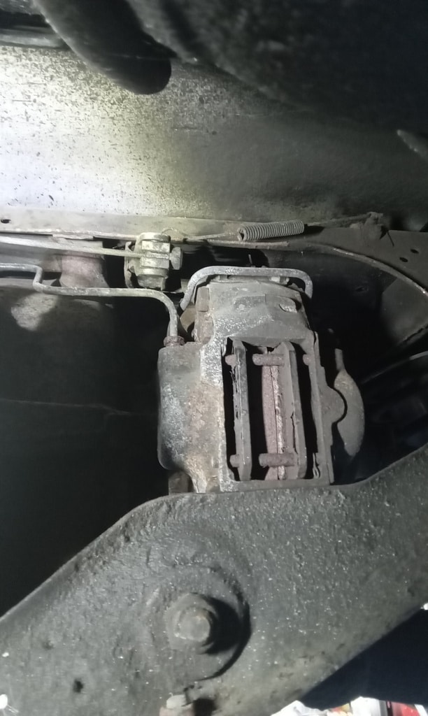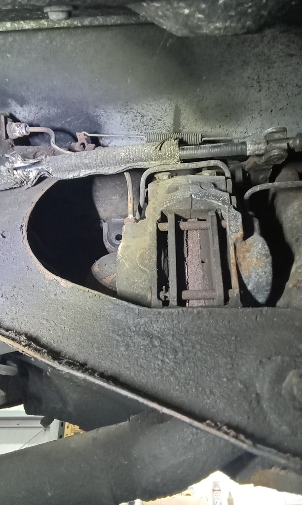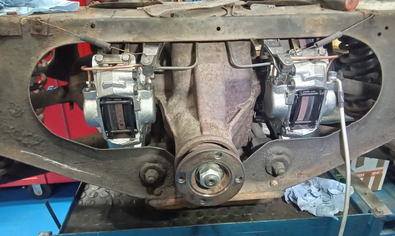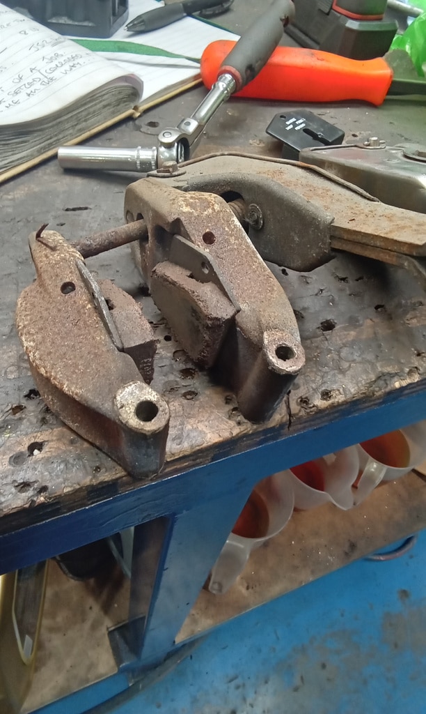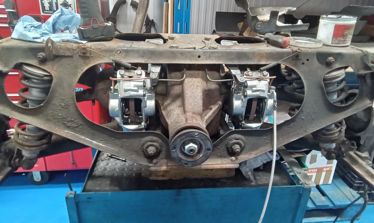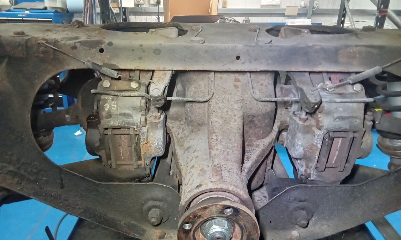 ”Remove rear axle assembly. Strip and remove handbrake calipers. Remove main calipers. Axle now turns freely. Needs new calipers. Start cleaning parts.