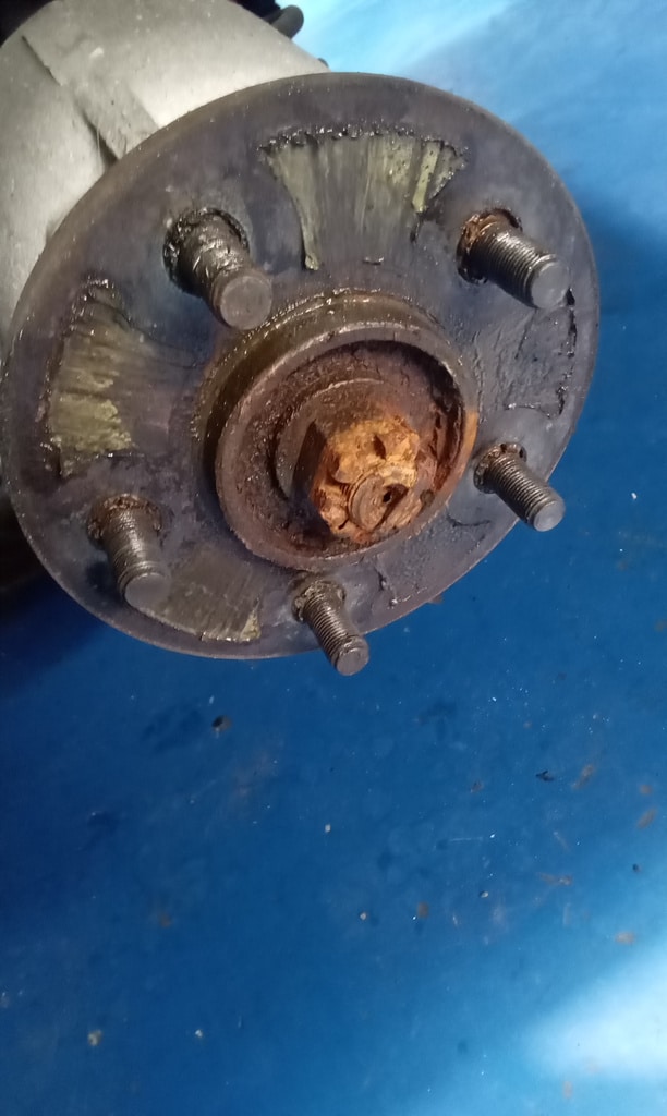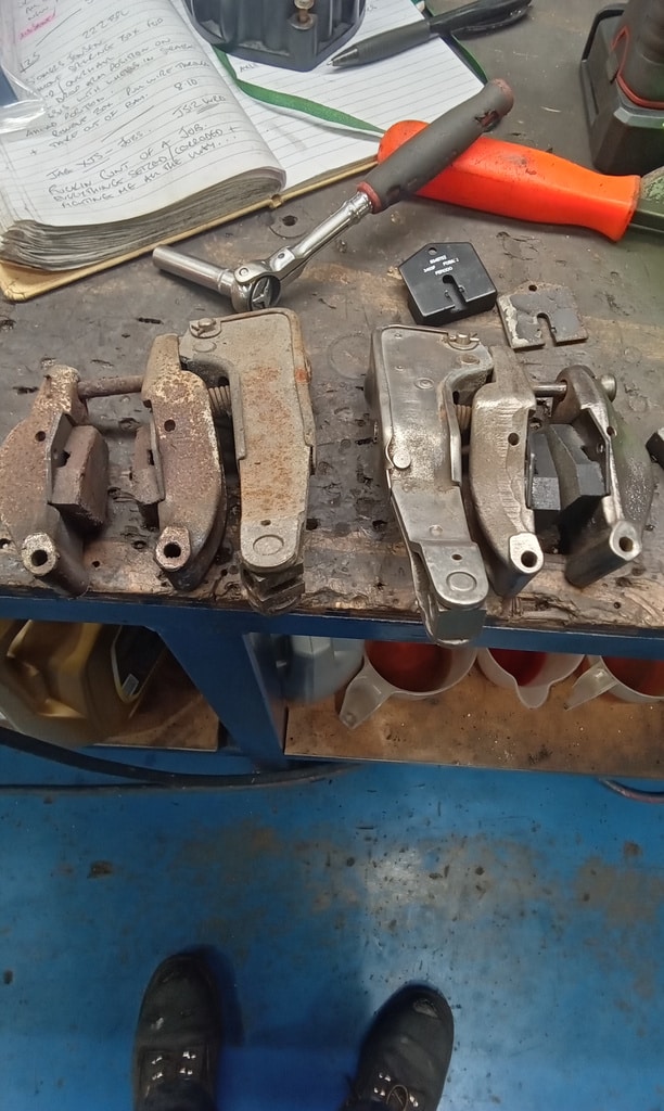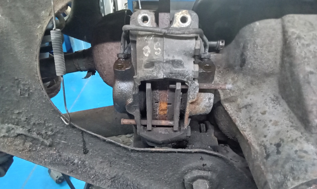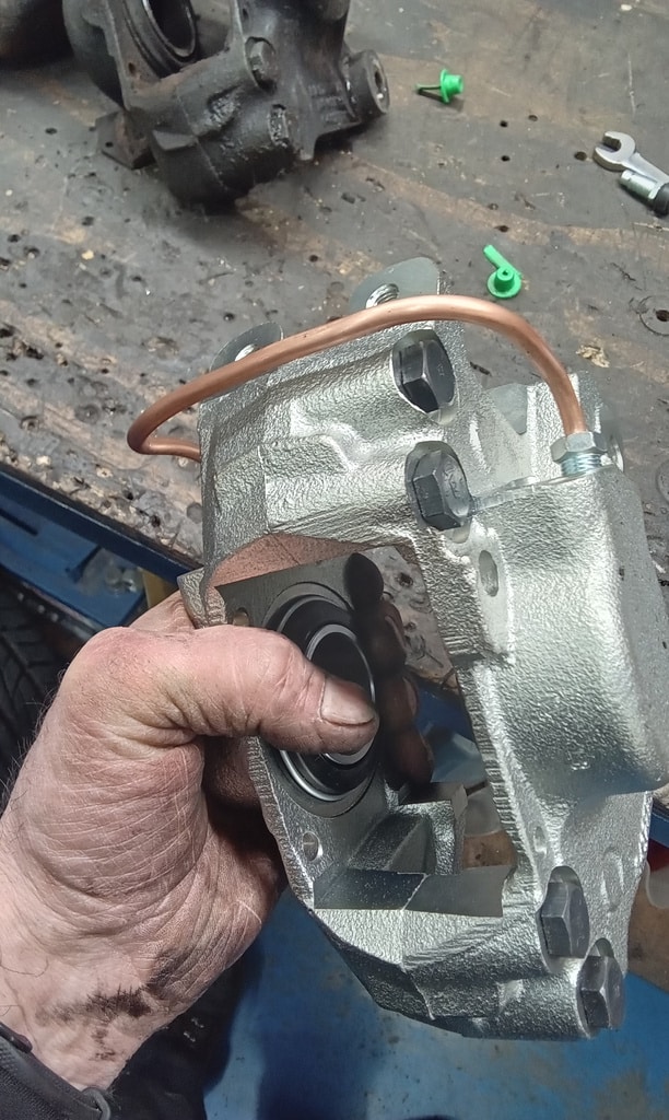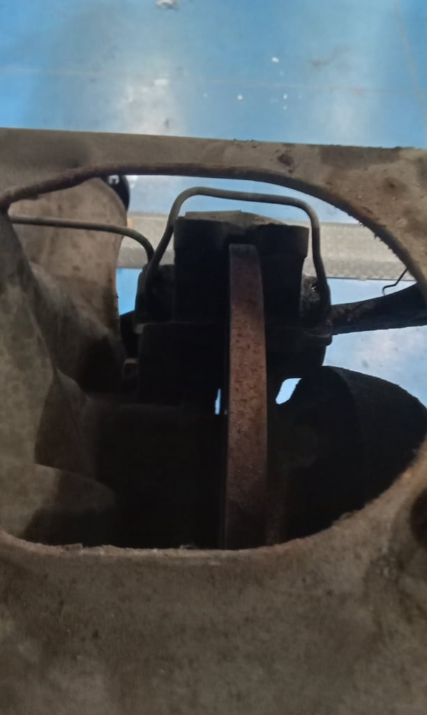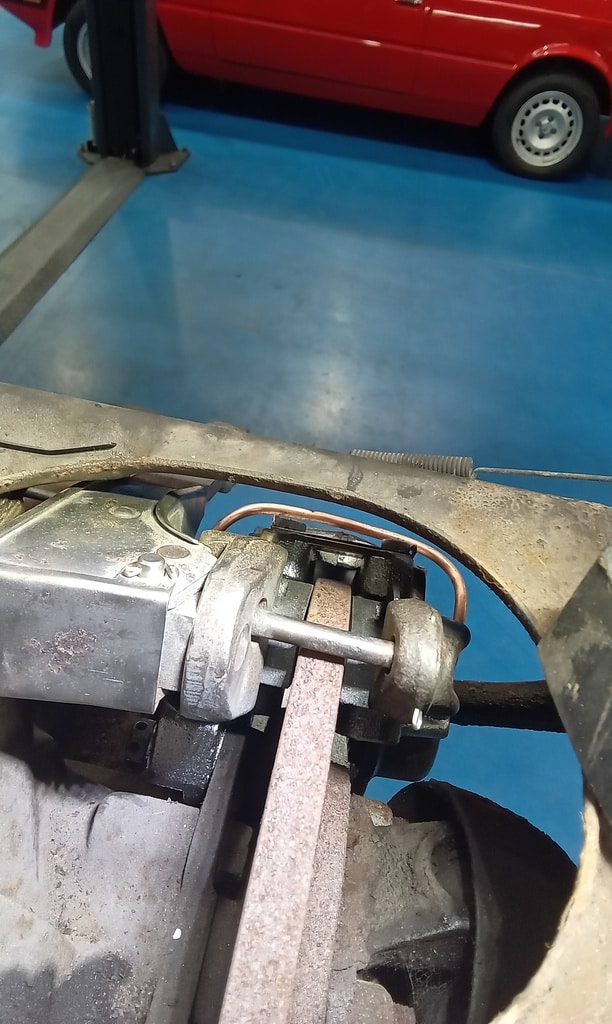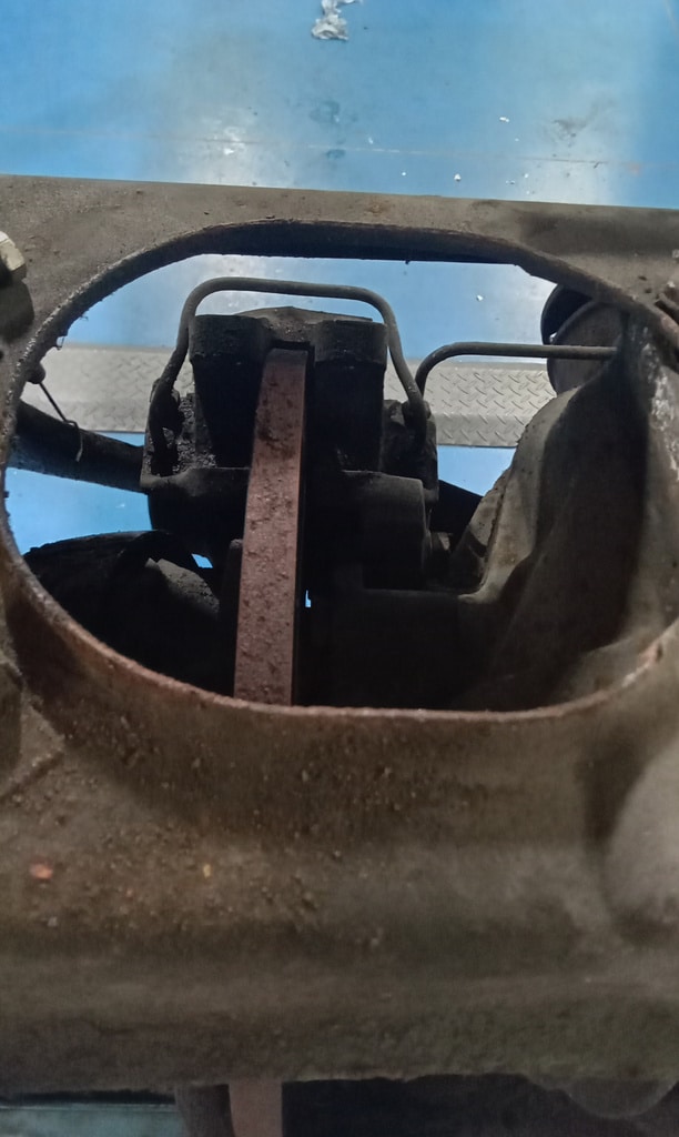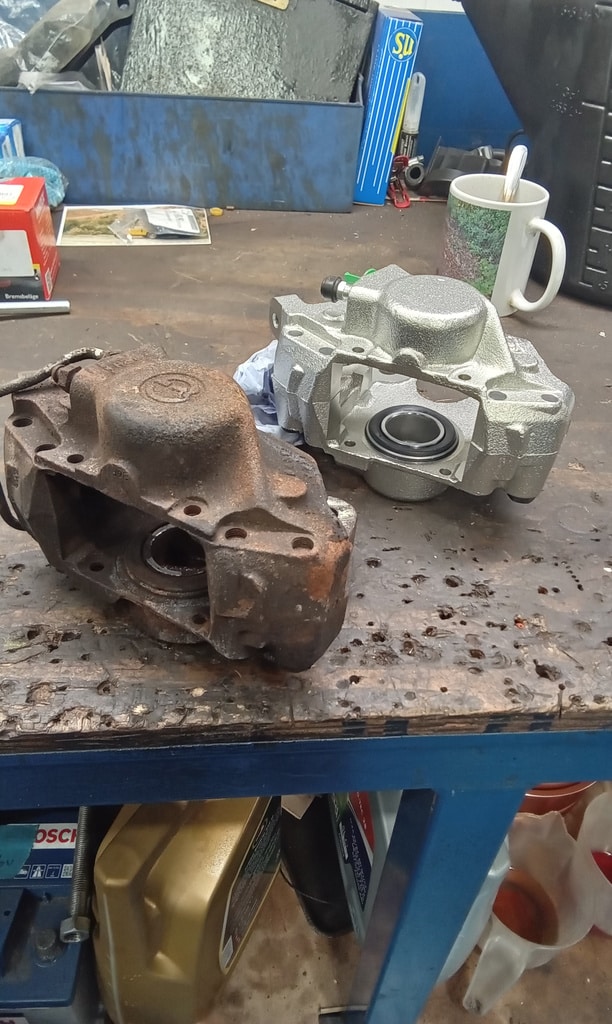 ”Remove rear axle assembly. Strip and remove handbrake calipers. Remove main calipers. Axle now turns freely. Needs new calipers. Start cleaning parts.