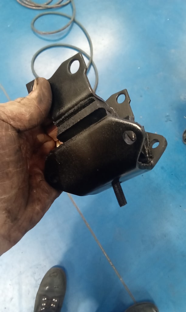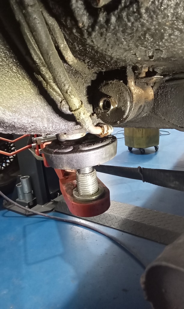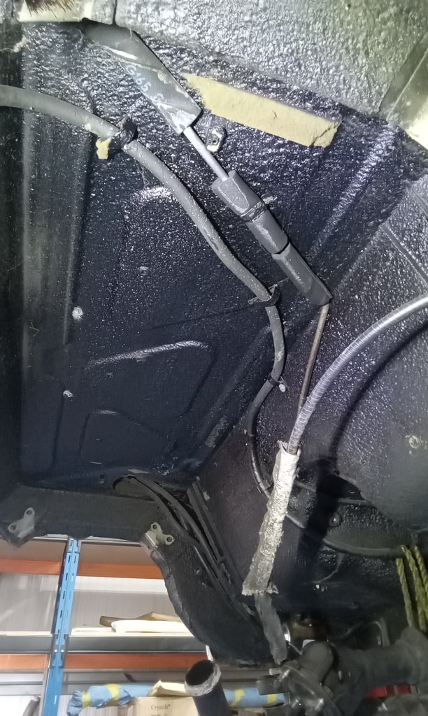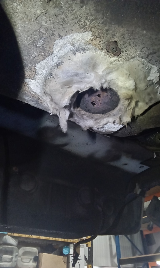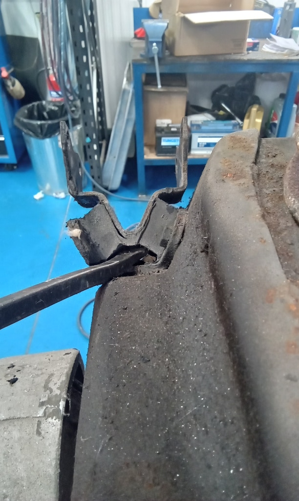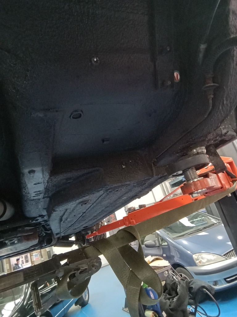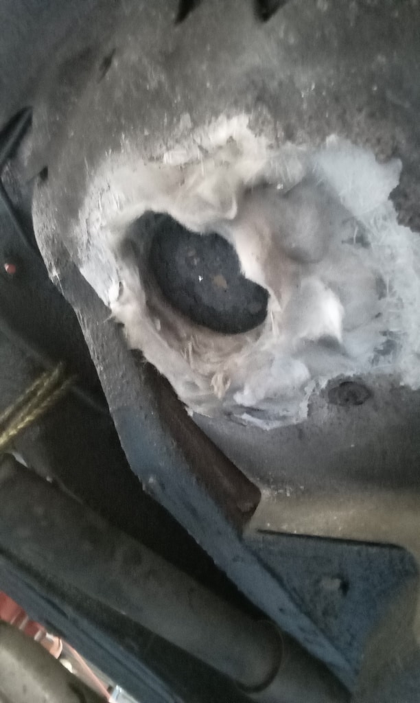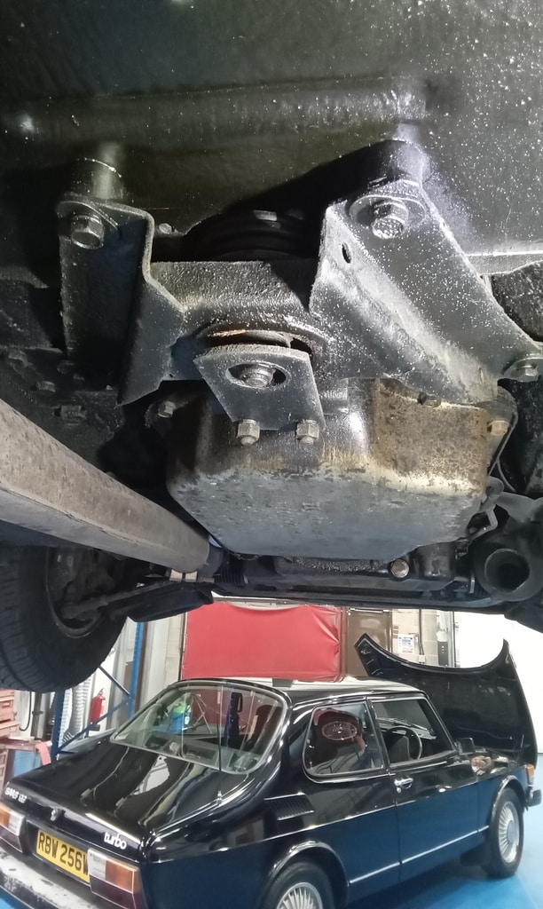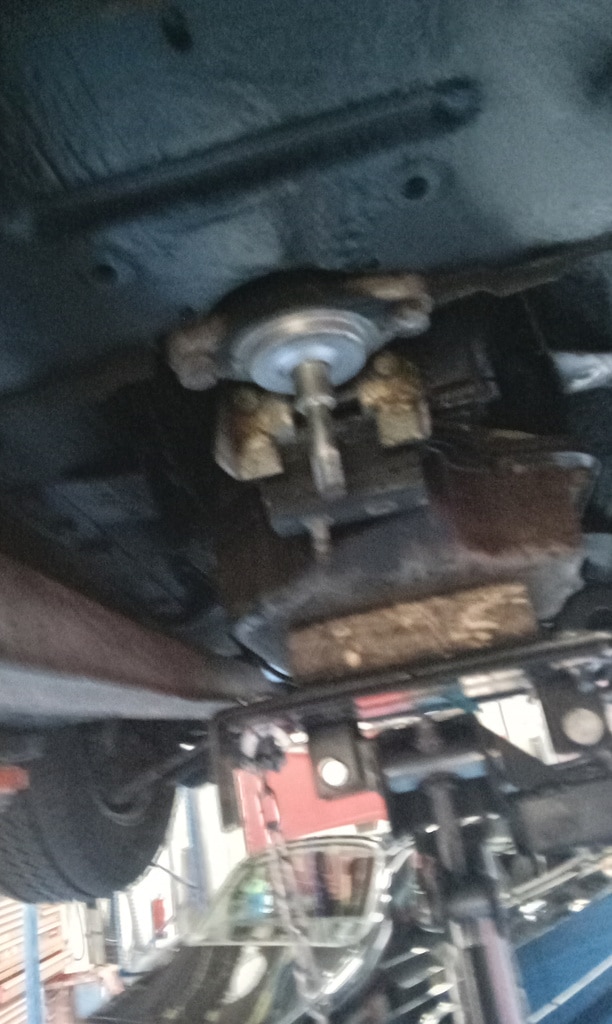 ”Clean and rebuild gearbox mount with new bush and spring cups. Fit and secure. Remove rear heat shield and clean floor. Noticed offside catalyst has been gutted or punched through and most of monolith missing.clewn and straighten flange. Tidy area.