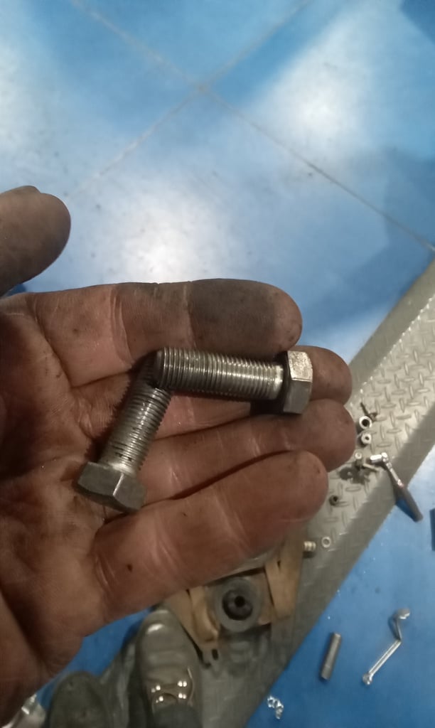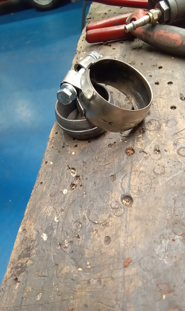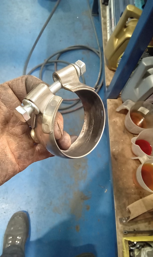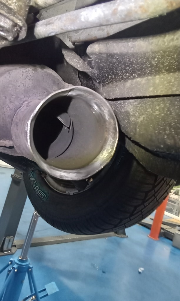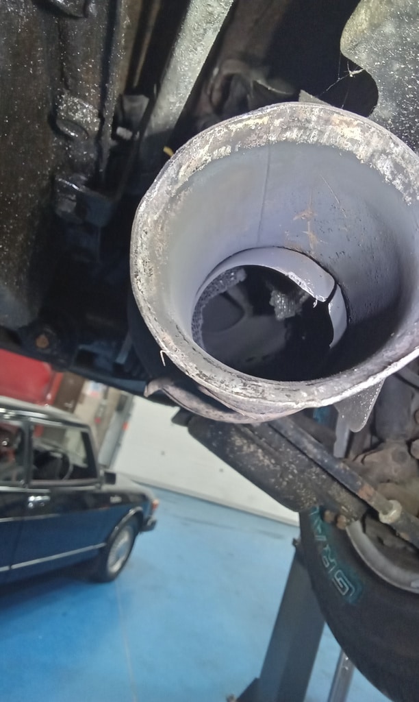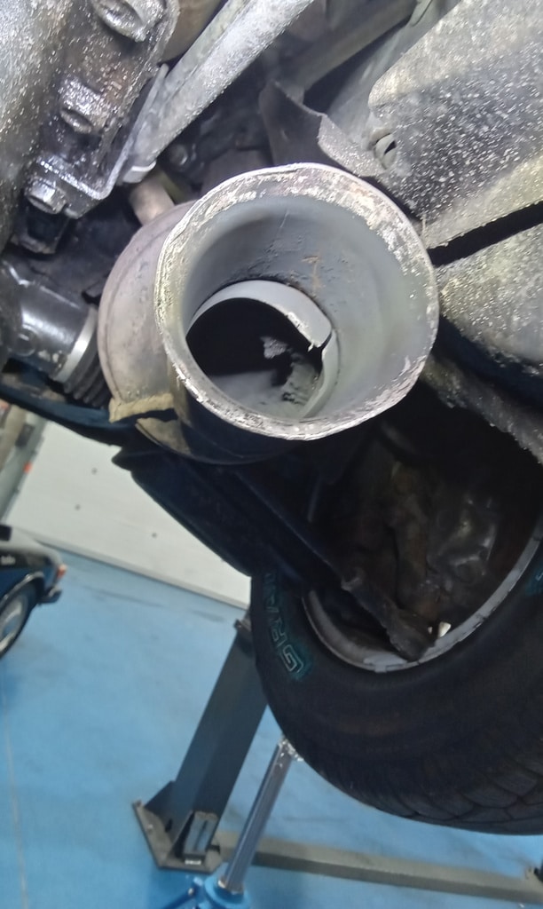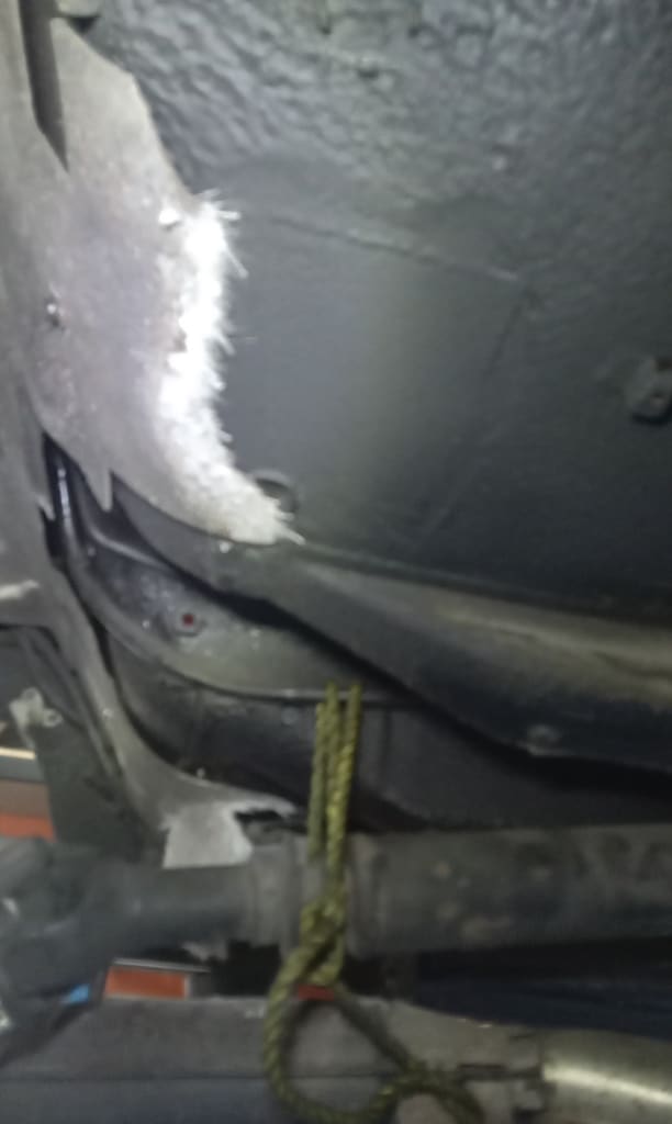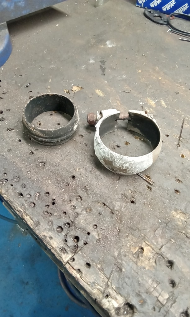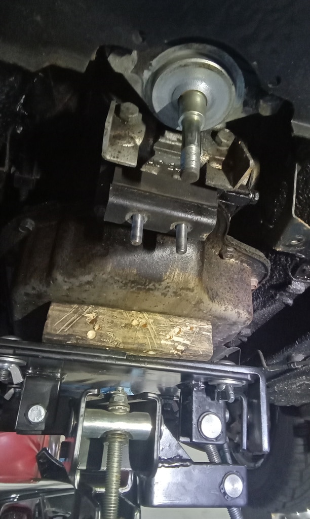 ”Clean and rebuild gearbox mount with new bush and spring cups. Fit and secure. Remove rear heat shield and clean floor. Noticed offside catalyst has been gutted or punched through and most of monolith missing.clewn and straighten flange. Tidy area.
