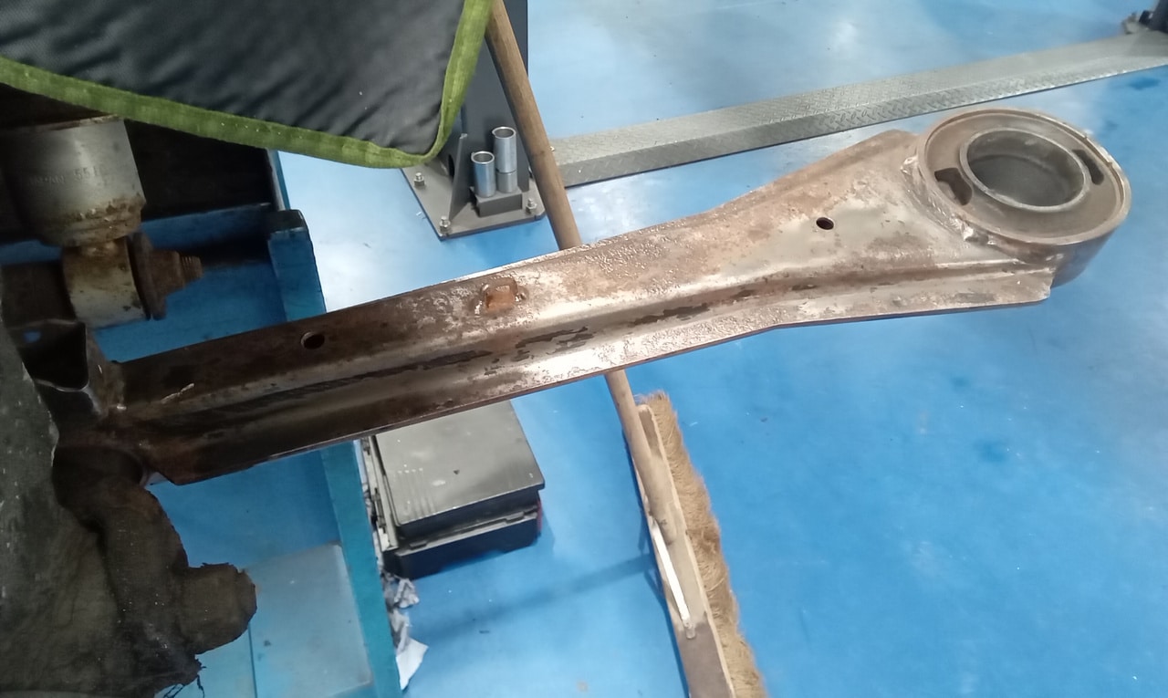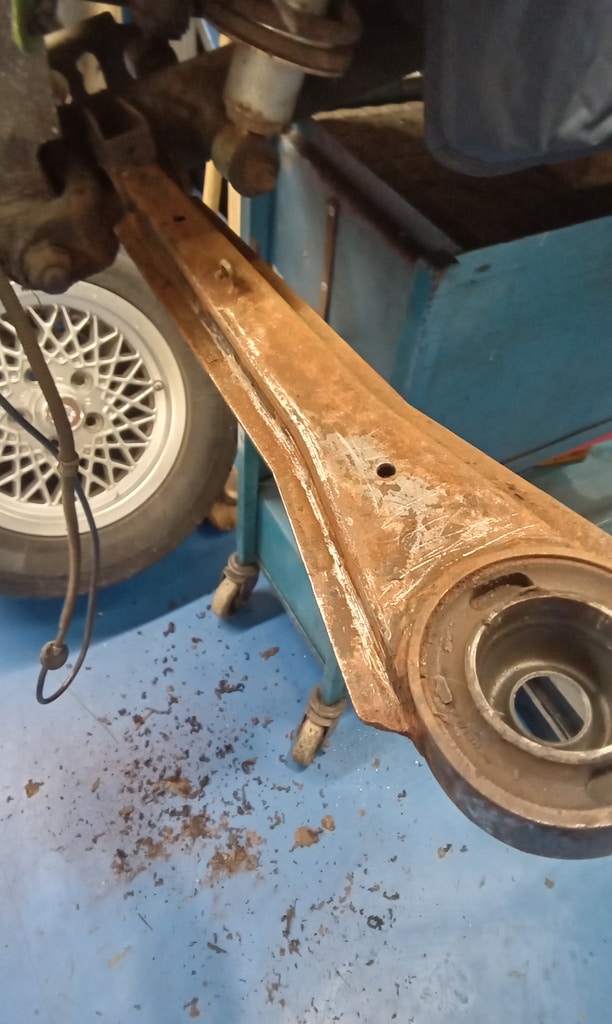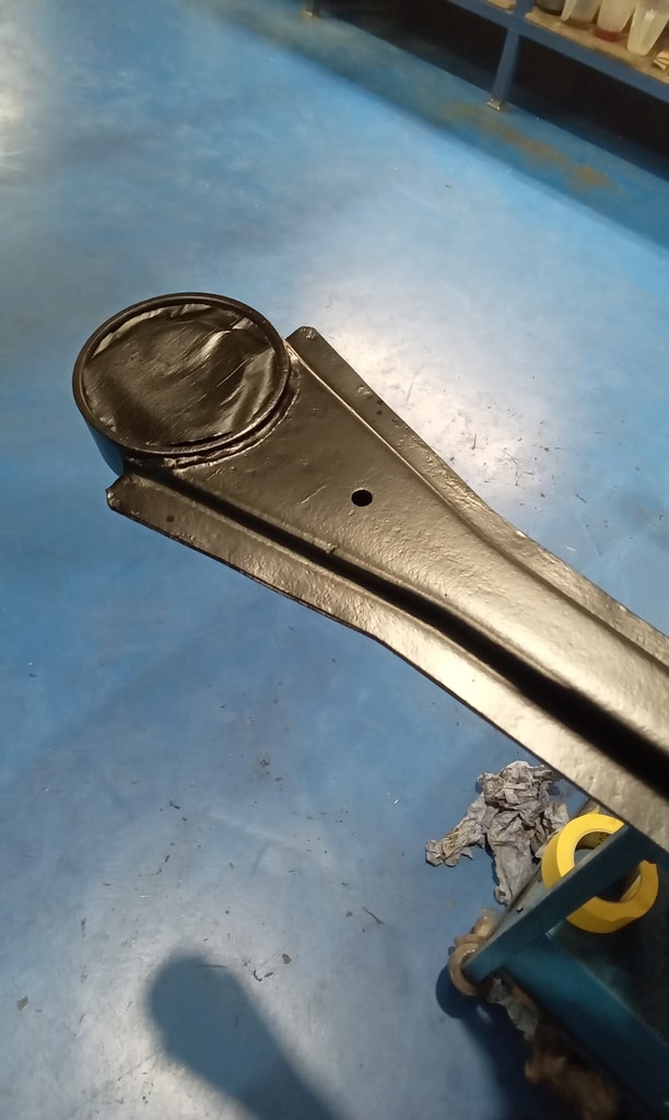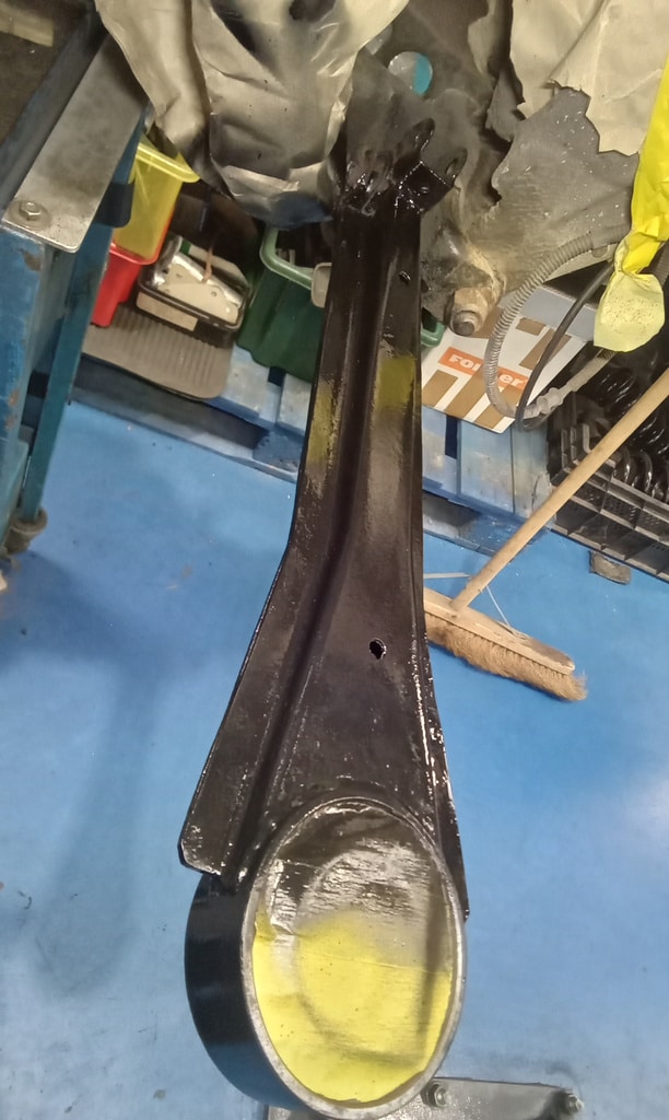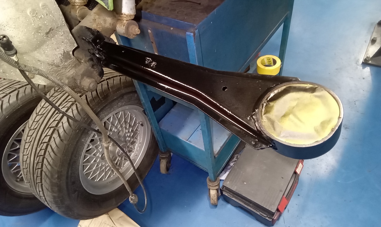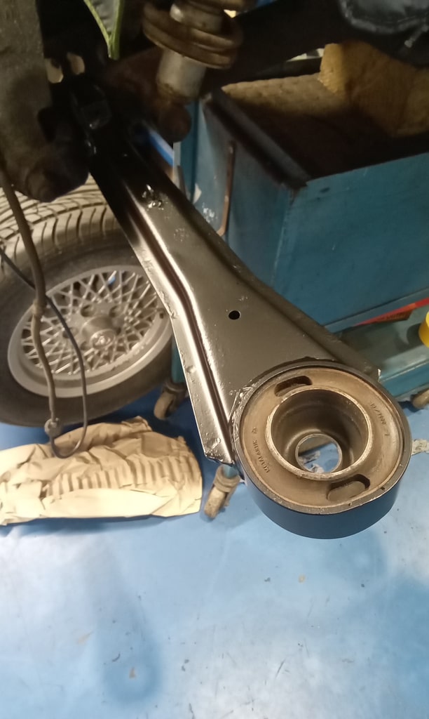 Clean rear axle trailing arms. Wire wheel and sand down. Paint both trailing arms black.”