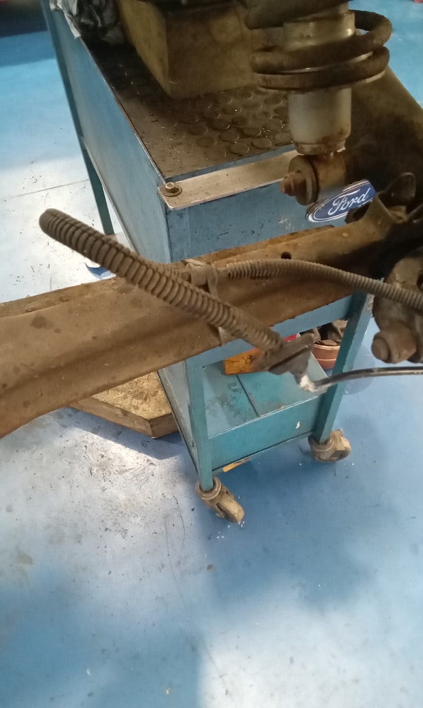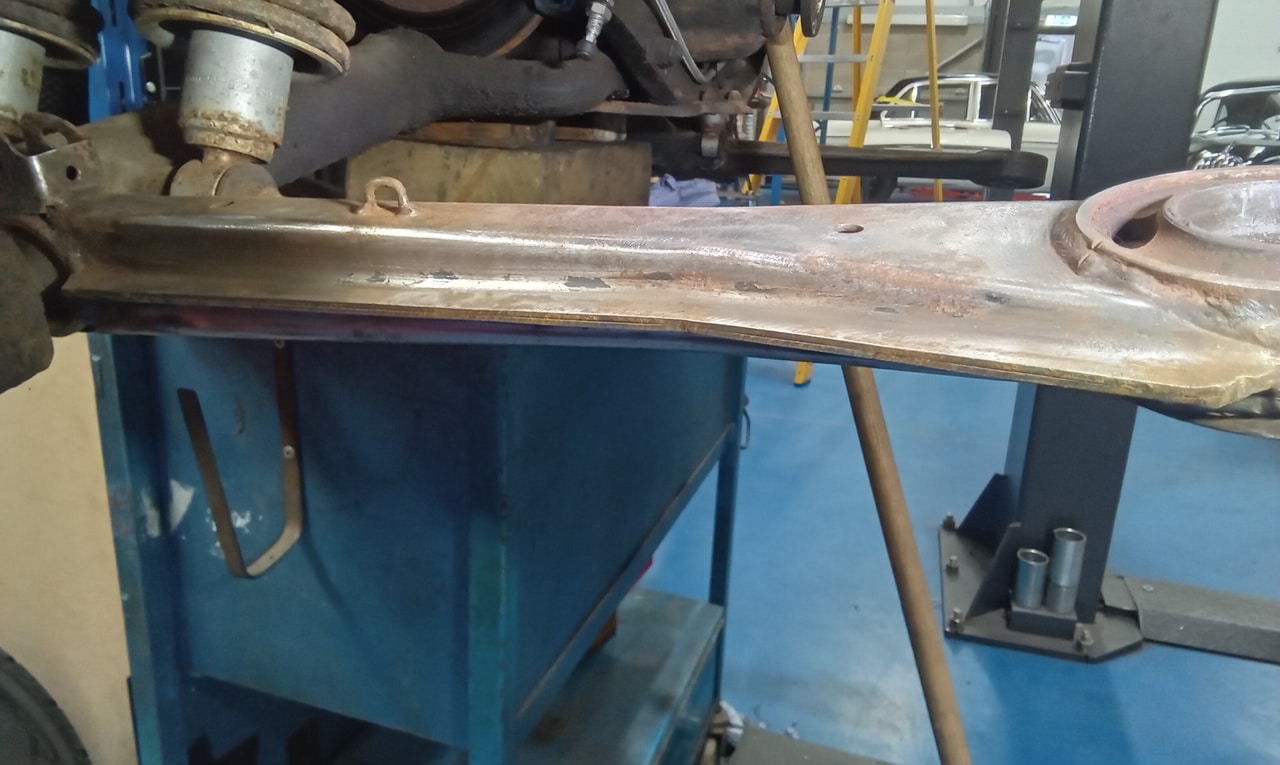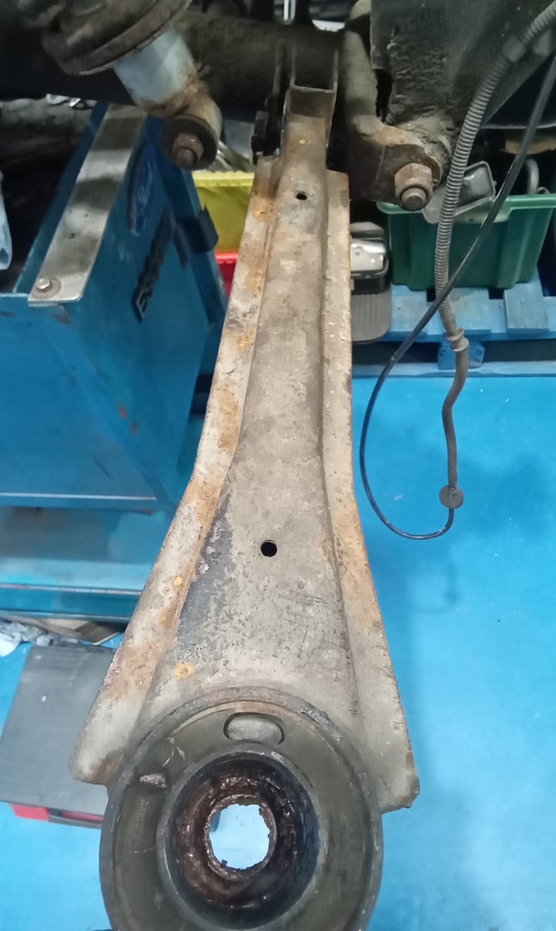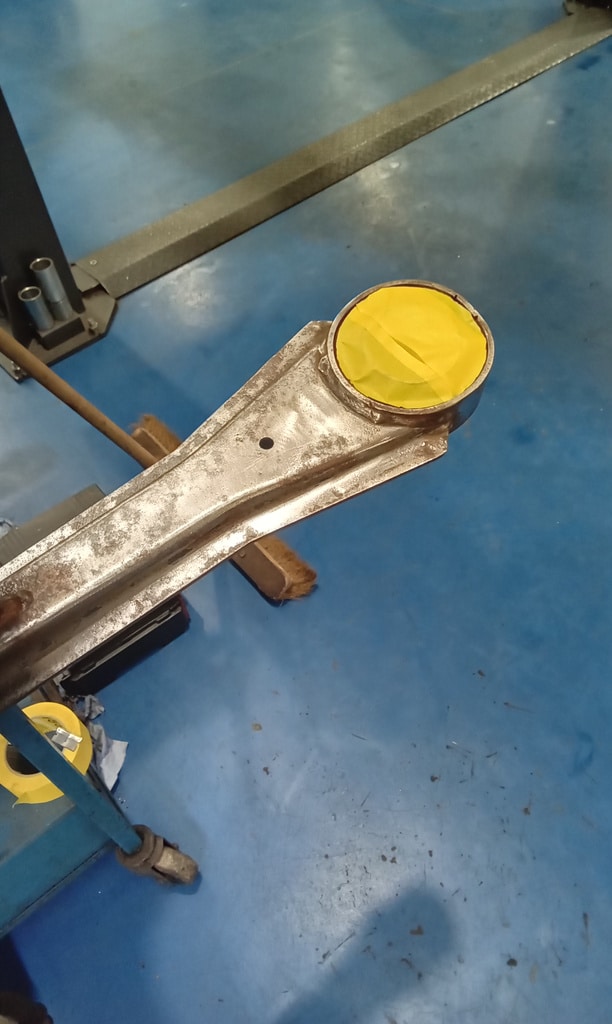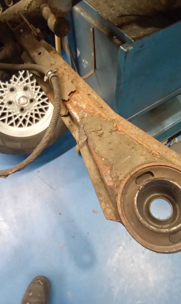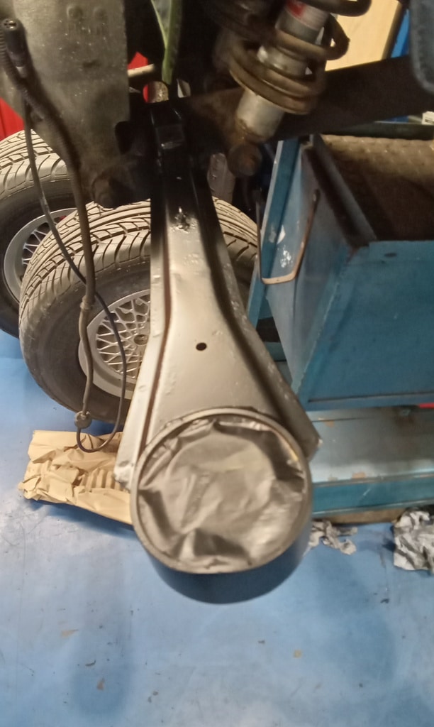 Clean rear axle trailing arms. Wire wheel and sand down. Paint both trailing arms black.”