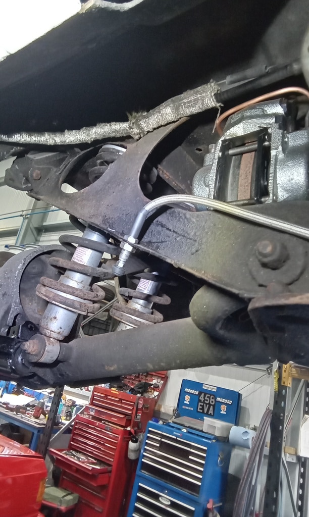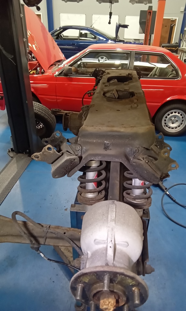 ”Prep to refit axle. Trailing arms have had 3 coats of black DTM paint and have dried. Remove rear flexi hose and let brake fluid drain. Align axle and lower ramp. Secure axle to car and tighten all mounts. Raise car and fit handbrake cable. Tidy area.”