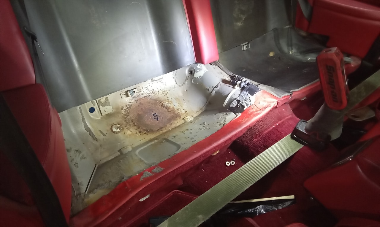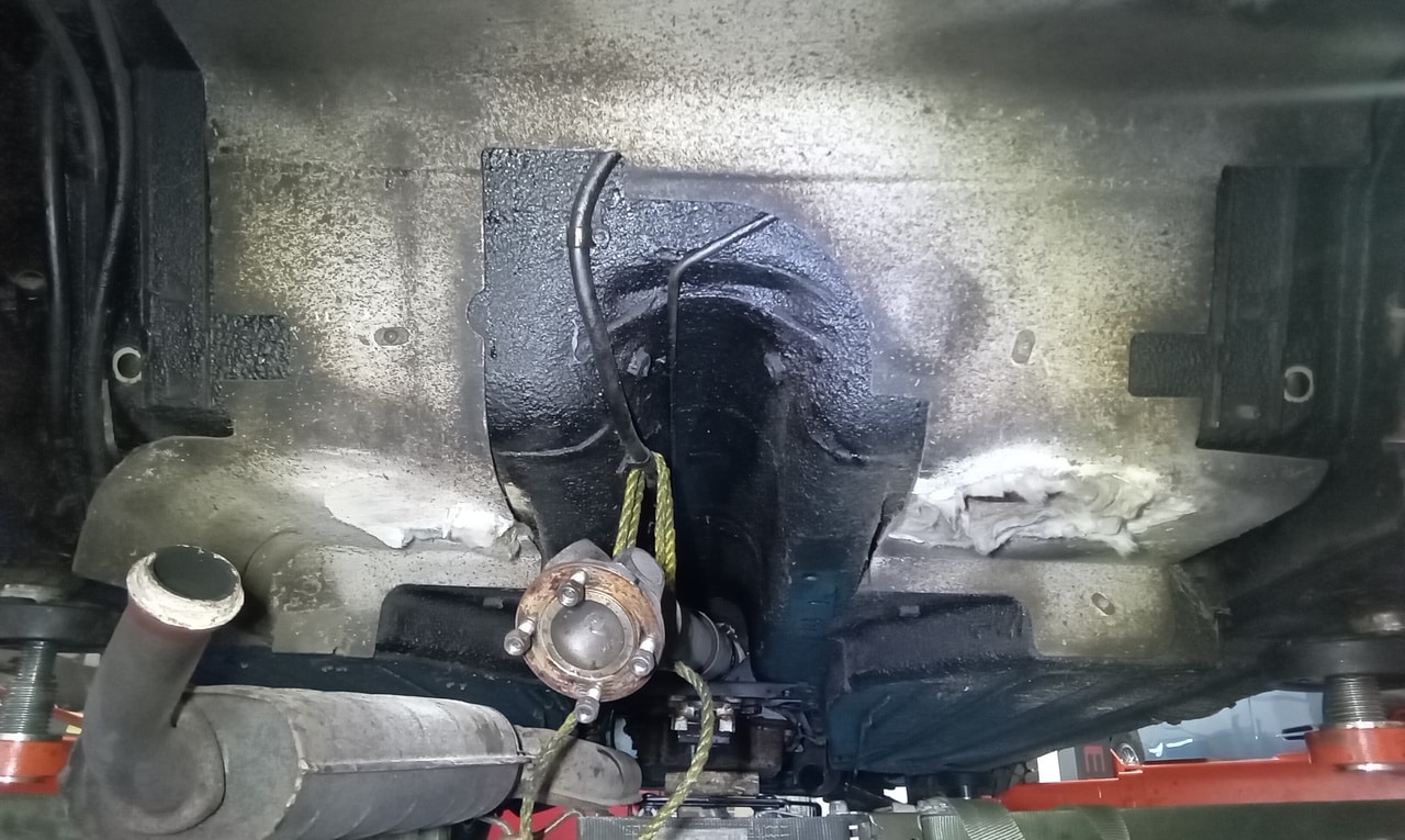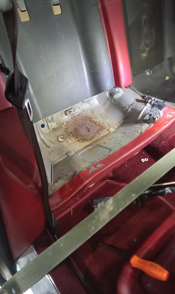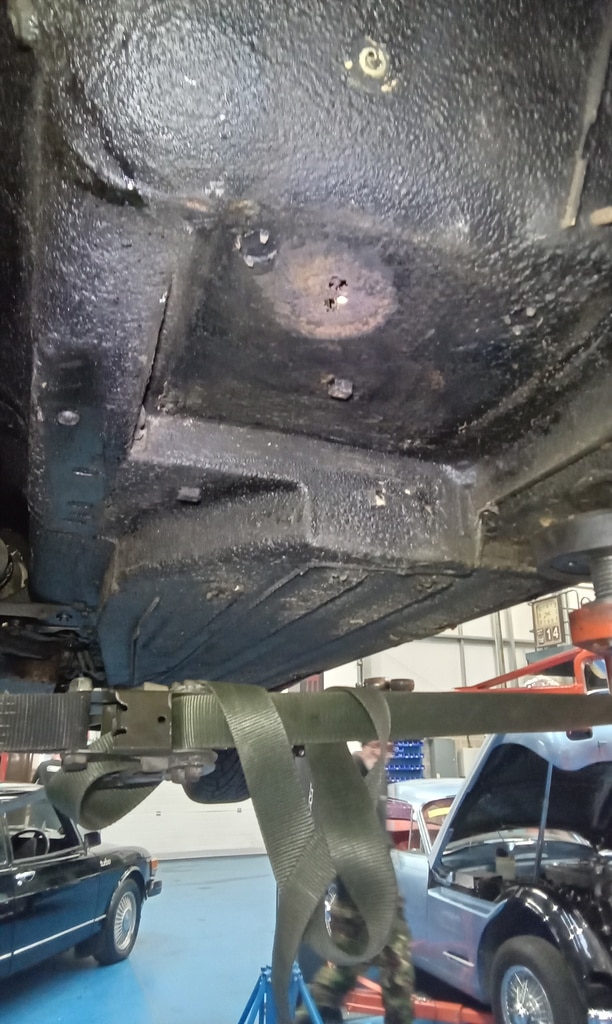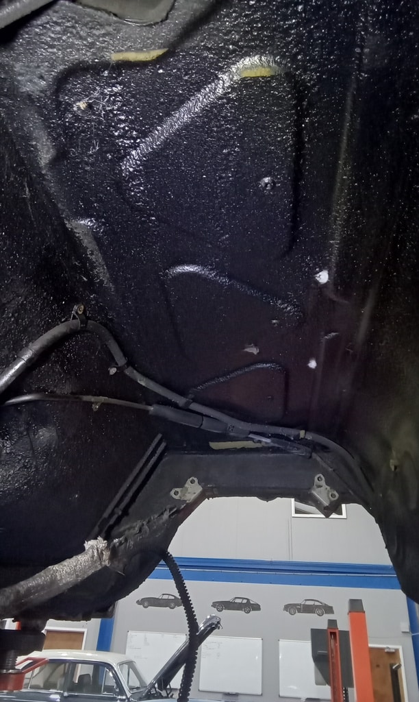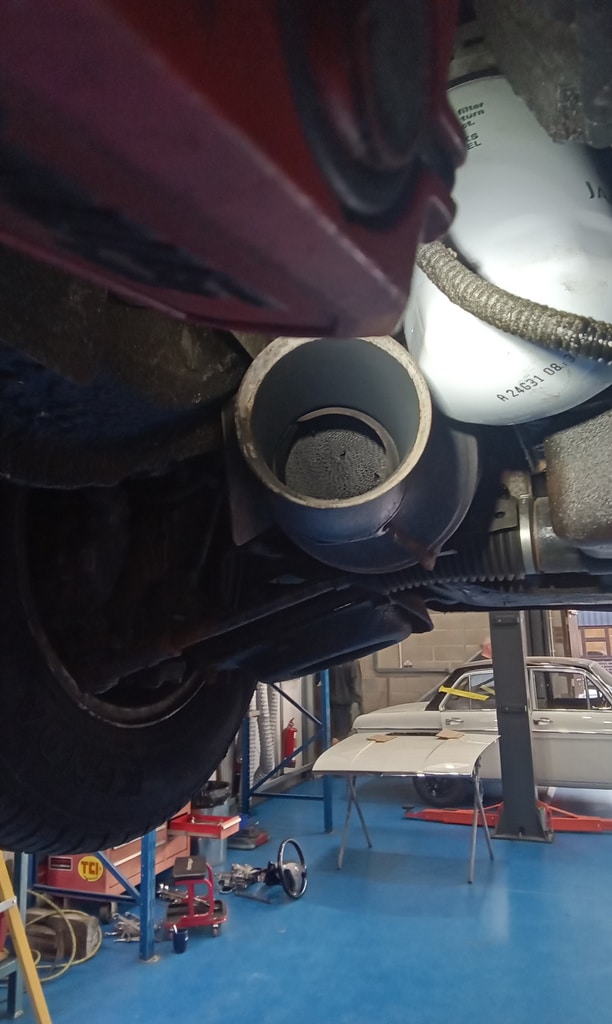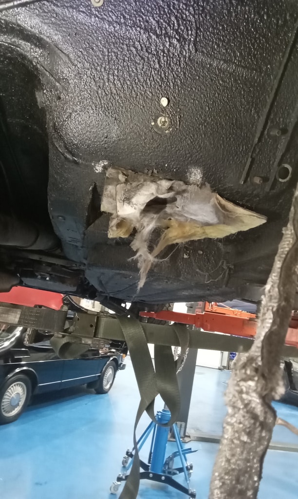 ”Start service. Remove distributor cap and check along with rotor, order new items. Drain oil and filter. Start to remove rear axle while oil is draining. Refit sump bung and secure and fit new oil filter. Remove both exhaust rear sections. Remove propshaft. Remove rear seats to access ABS multiplugs for rear sensors. Found bottom of offside rear seat burnt and damage to foam. Upon inspection, the heat shield for exhaust directly under seat gone and floor rusted and holed. Will need new heat shield and welding repair. Strap car to ramp.”