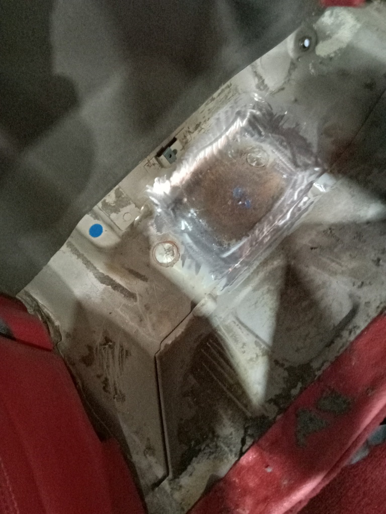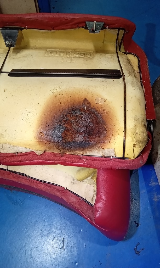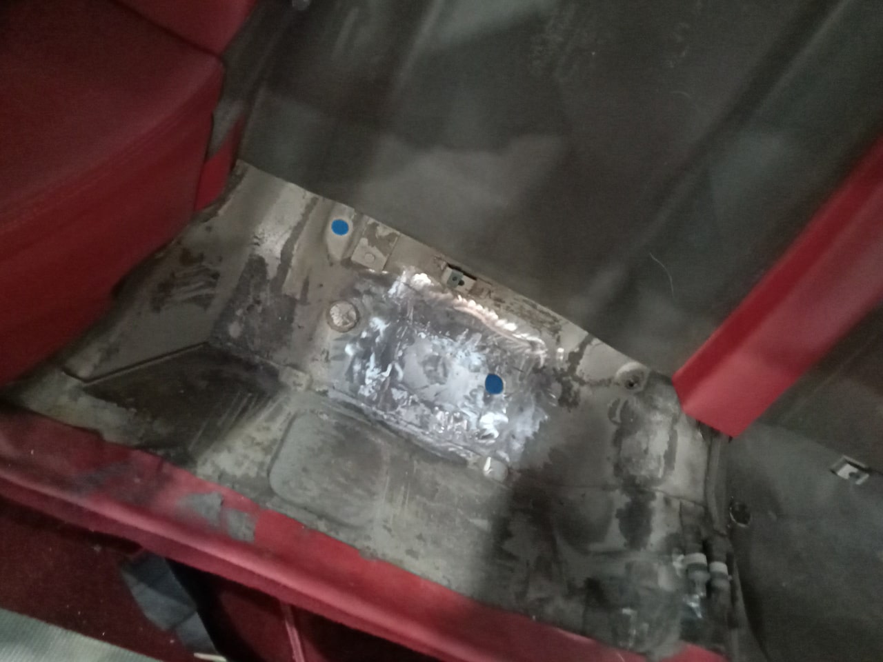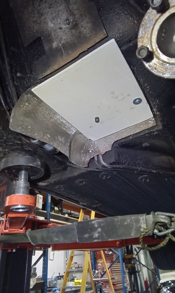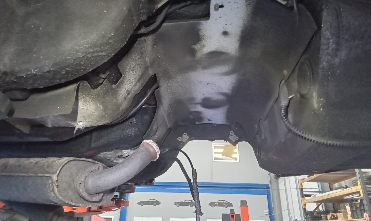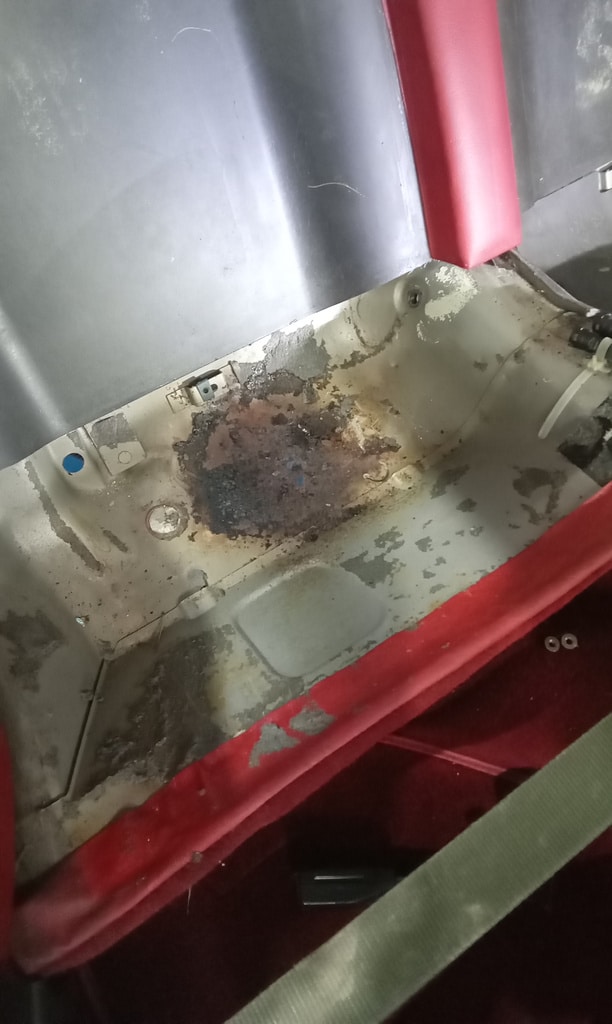 ”Start service. Remove distributor cap and check along with rotor, order new items. Drain oil and filter. Start to remove rear axle while oil is draining. Refit sump bung and secure and fit new oil filter. Remove both exhaust rear sections. Remove propshaft. Remove rear seats to access ABS multiplugs for rear sensors. Found bottom of offside rear seat burnt and damage to foam. Upon inspection, the heat shield for exhaust directly under seat gone and floor rusted and holed. Will need new heat shield and welding repair. Strap car to ramp.”