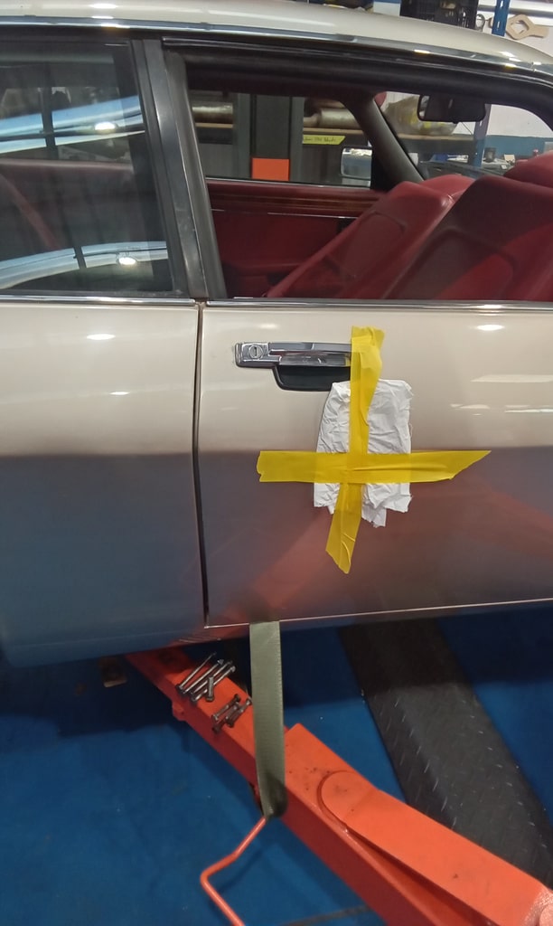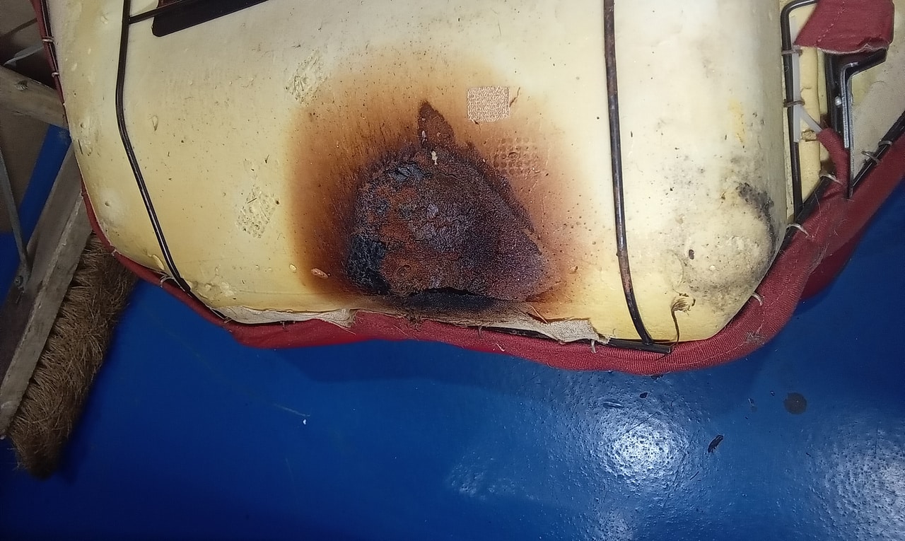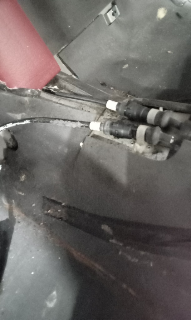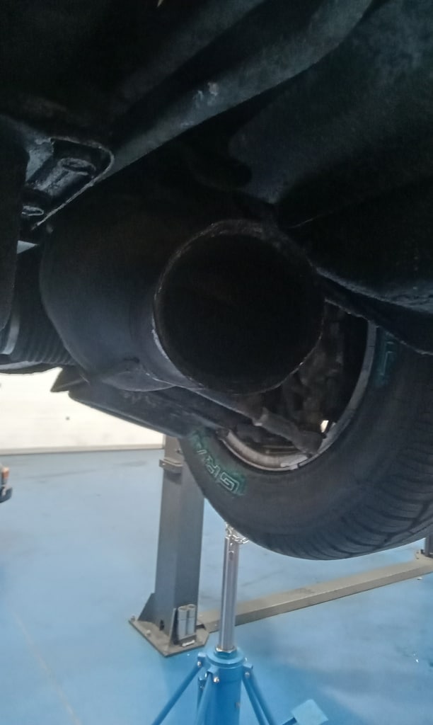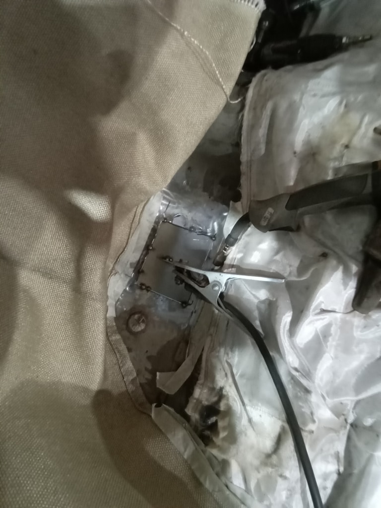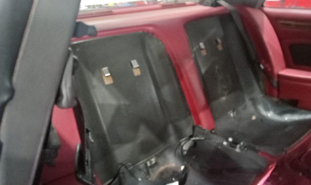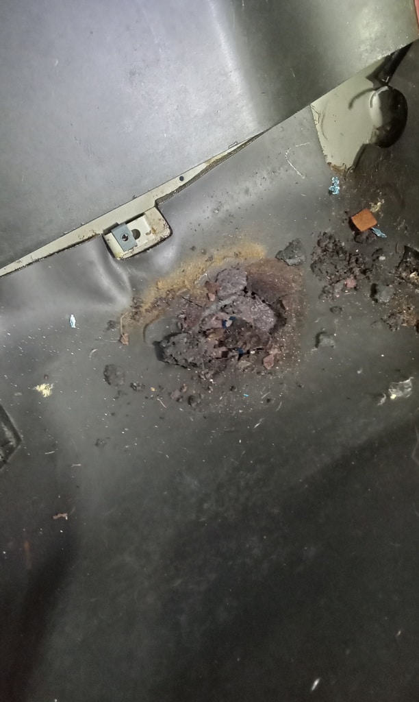 ”Start service. Remove distributor cap and check along with rotor, order new items. Drain oil and filter. Start to remove rear axle while oil is draining. Refit sump bung and secure and fit new oil filter. Remove both exhaust rear sections. Remove propshaft. Remove rear seats to access ABS multiplugs for rear sensors. Found bottom of offside rear seat burnt and damage to foam. Upon inspection, the heat shield for exhaust directly under seat gone and floor rusted and holed. Will need new heat shield and welding repair. Strap car to ramp.”