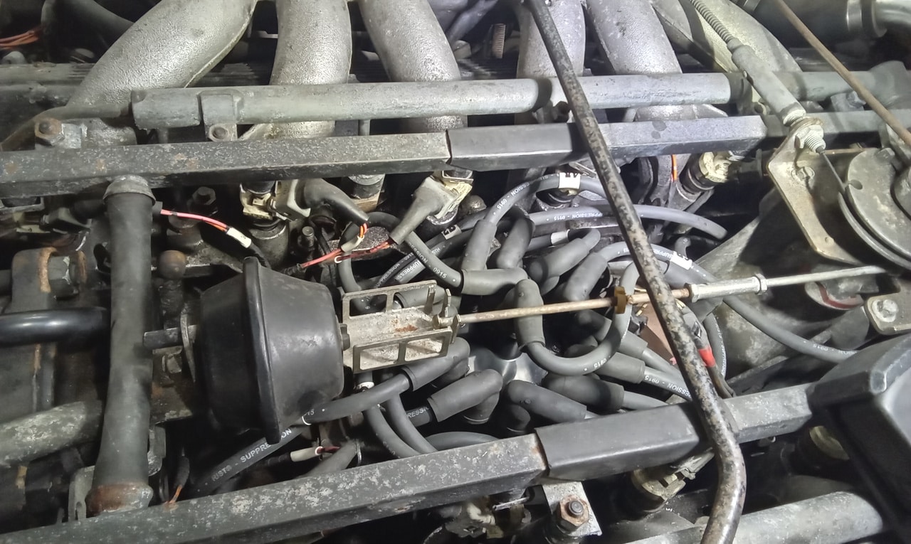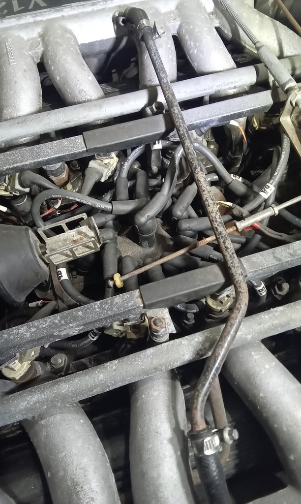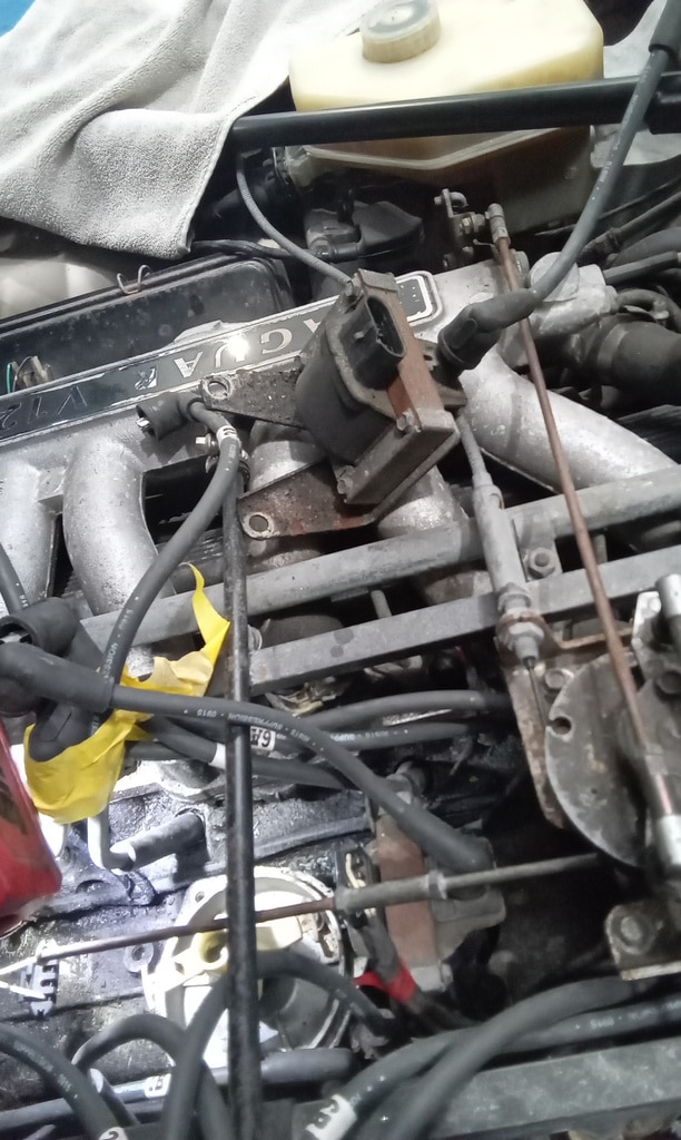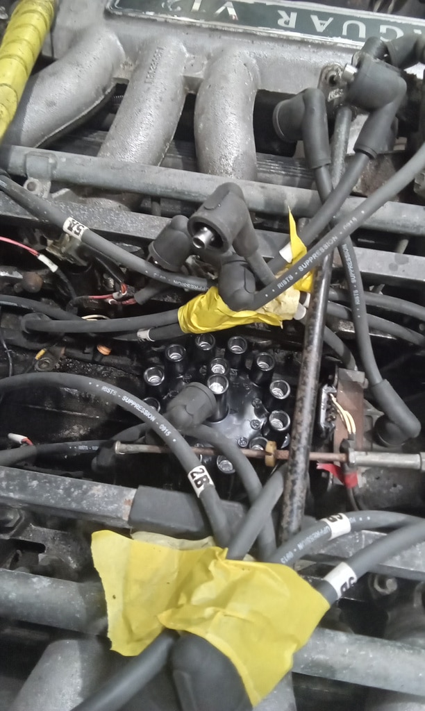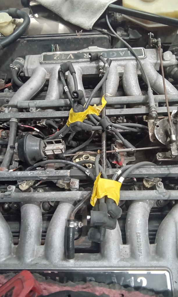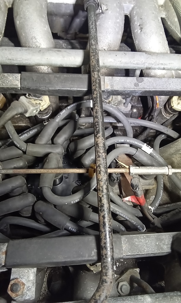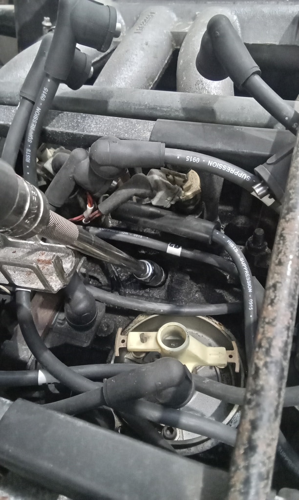 ”Continue replacing spark plugs. Remove throttle tower to gain access to certain plugs. Refit throttle tower and linkage. Replace small return spring. Remove front coil pack and attempt to removeac pump to get to front plugs but AC adjuster seized so undo and move as best as I can to fit new plugs. Resecure ac pump. Fit new rotor arm and distributor cap. Refit HT leads in correct positions. Fit new clip to cruise control linkage.