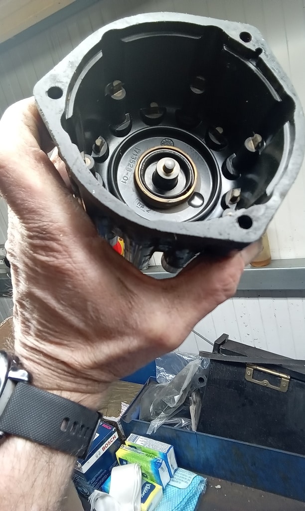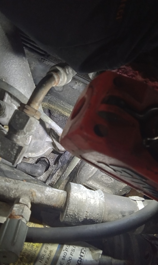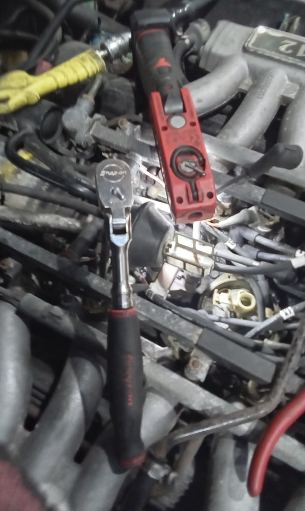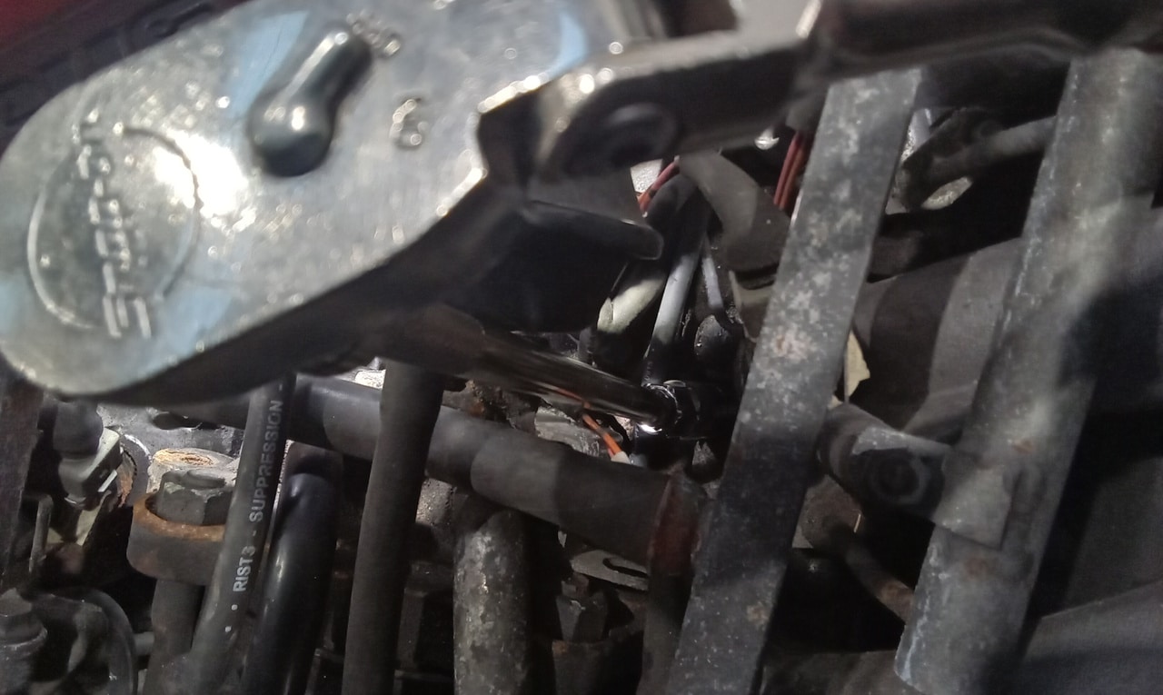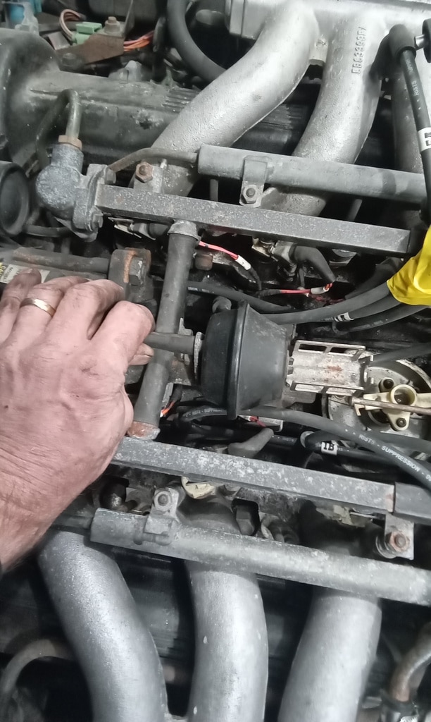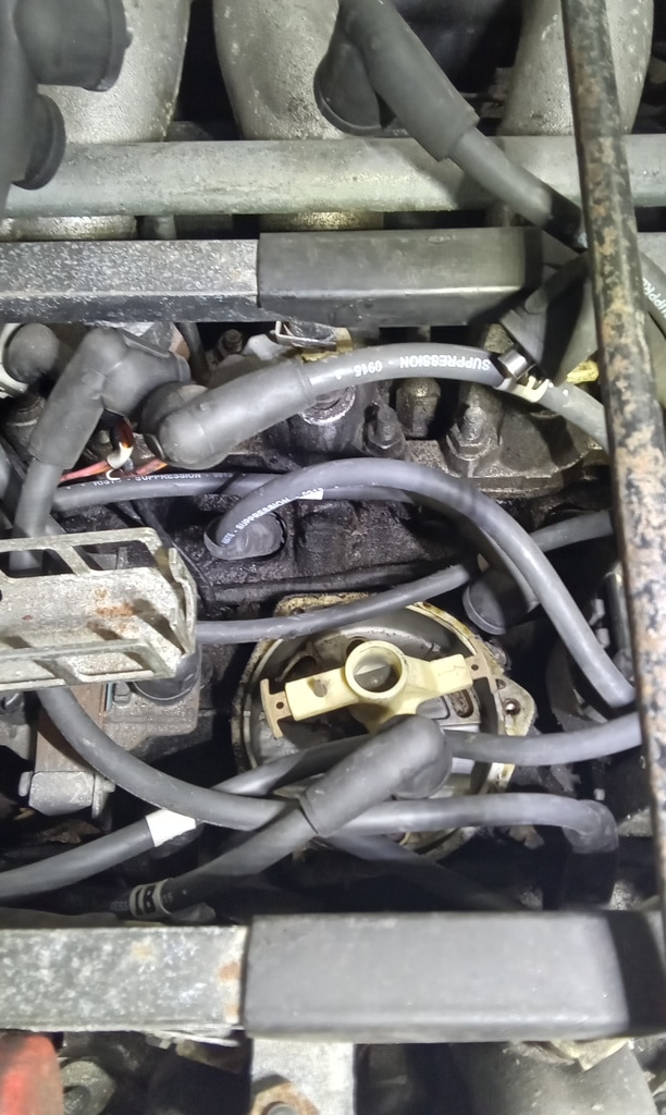 ”Continue replacing spark plugs. Remove throttle tower to gain access to certain plugs. Refit throttle tower and linkage. Replace small return spring. Remove front coil pack and attempt to removeac pump to get to front plugs but AC adjuster seized so undo and move as best as I can to fit new plugs. Resecure ac pump. Fit new rotor arm and distributor cap. Refit HT leads in correct positions. Fit new clip to cruise control linkage.