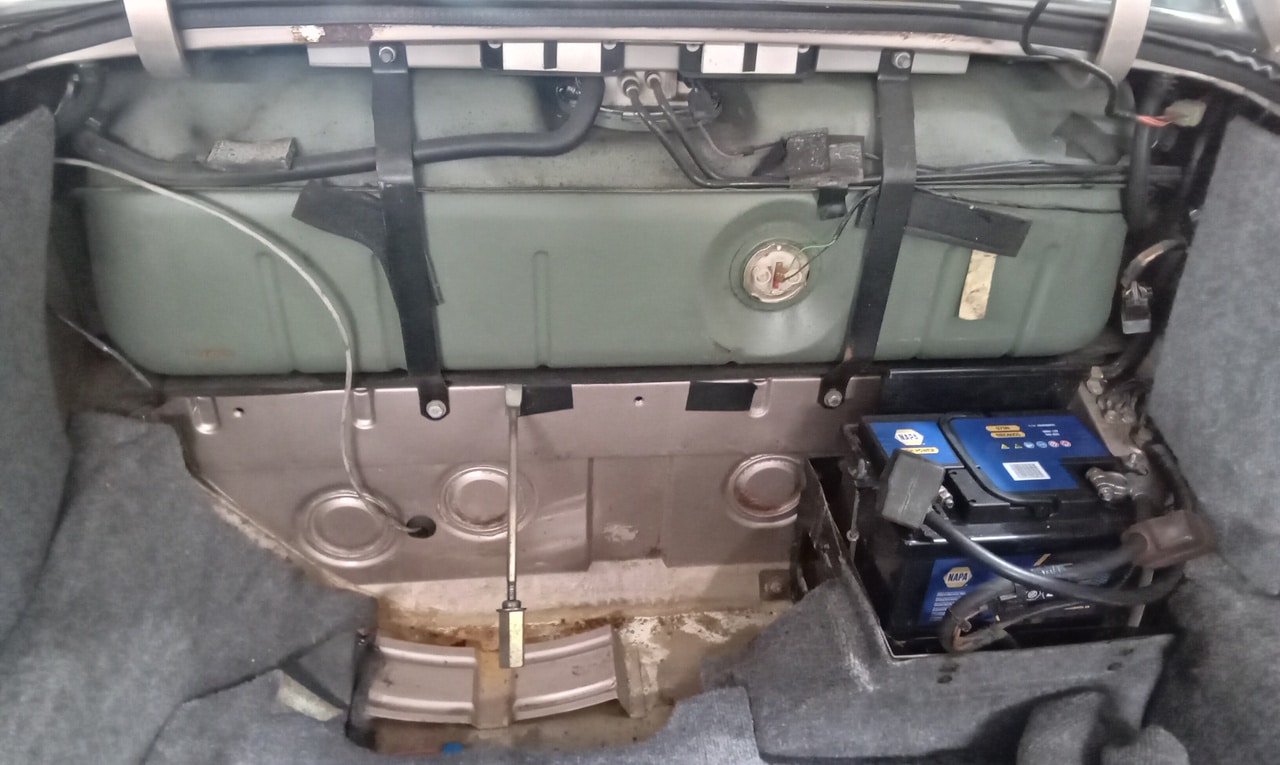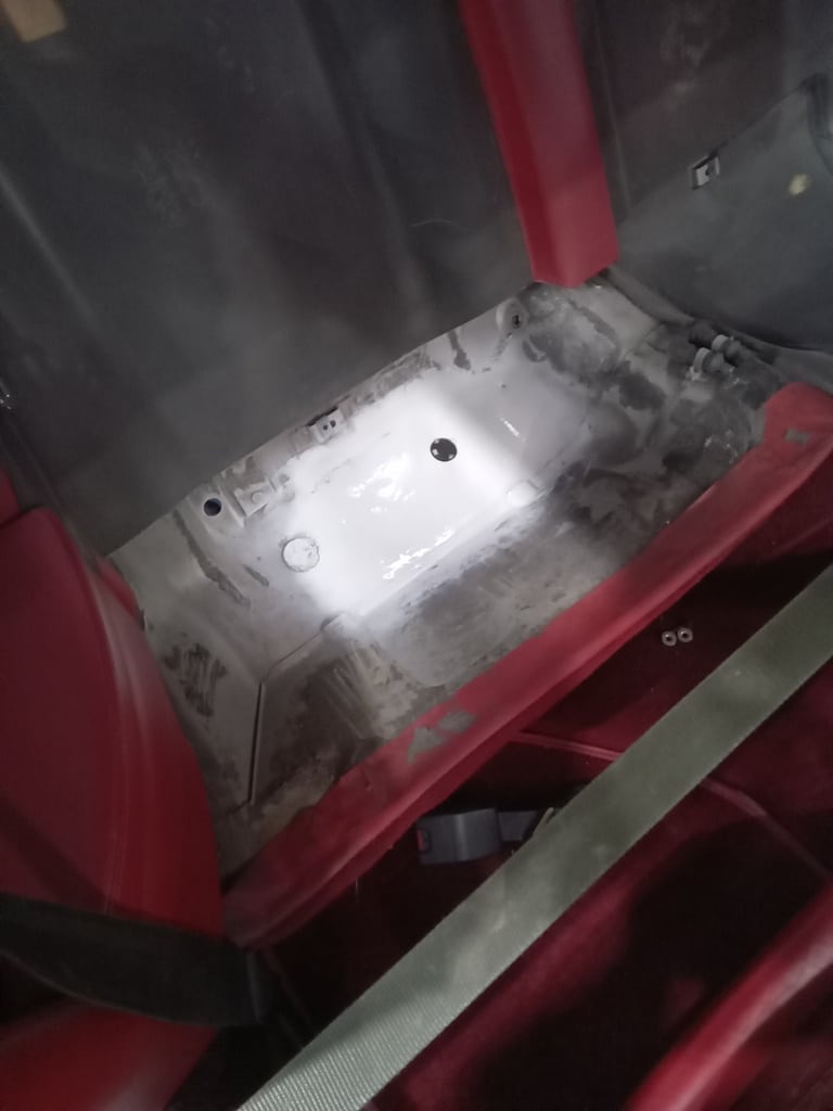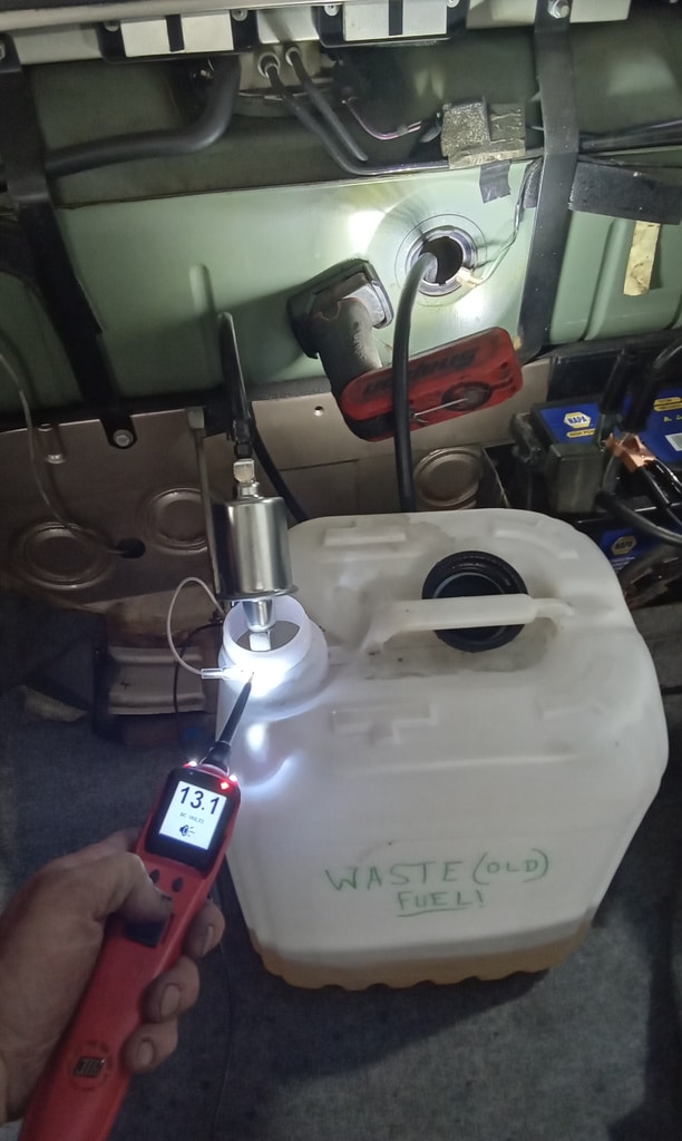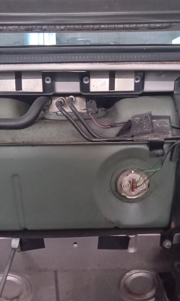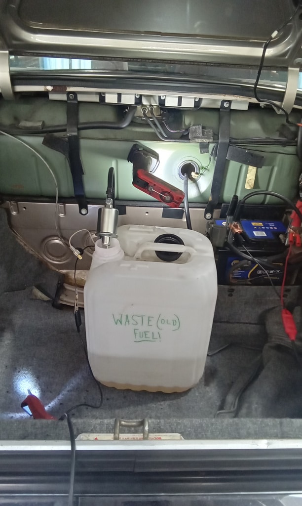 Clean floor from inside and grind back to good metal where floor is holed and requires welding. Strip boot and remove fuel sender. Test sender and not functioning correctly. Tank has 10 to 15 litres. Use our pump to empty tank. Disconnect fuel filter and blow lines back from engine and back to tank. Fit new fuel filter and connect. Put 10ltrs E5 in tank.