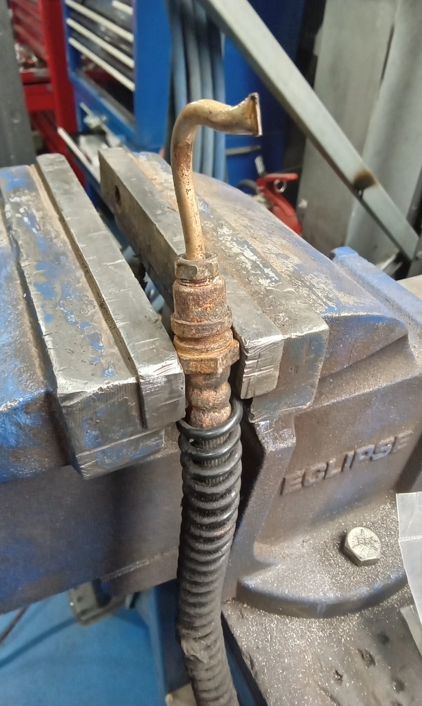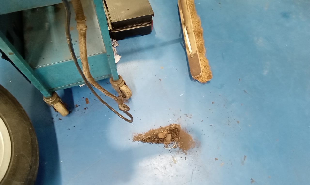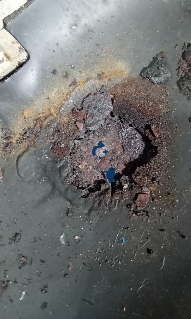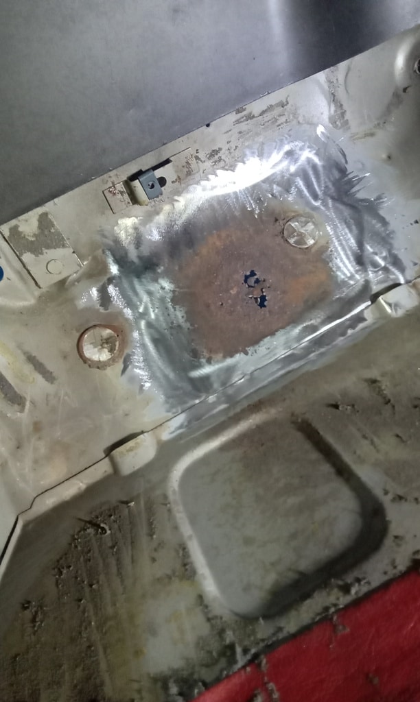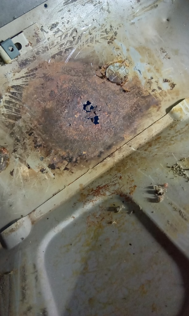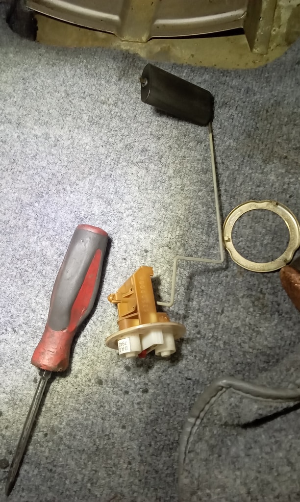 Clean floor from inside and grind back to good metal where floor is holed and requires welding. Strip boot and remove fuel sender. Test sender and not functioning correctly. Tank has 10 to 15 litres. Use our pump to empty tank. Disconnect fuel filter and blow lines back from engine and back to tank. Fit new fuel filter and connect. Put 10ltrs E5 in tank.