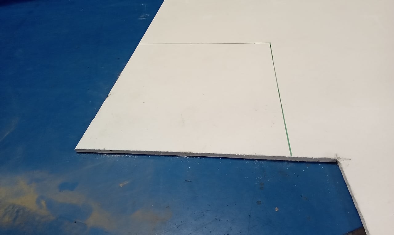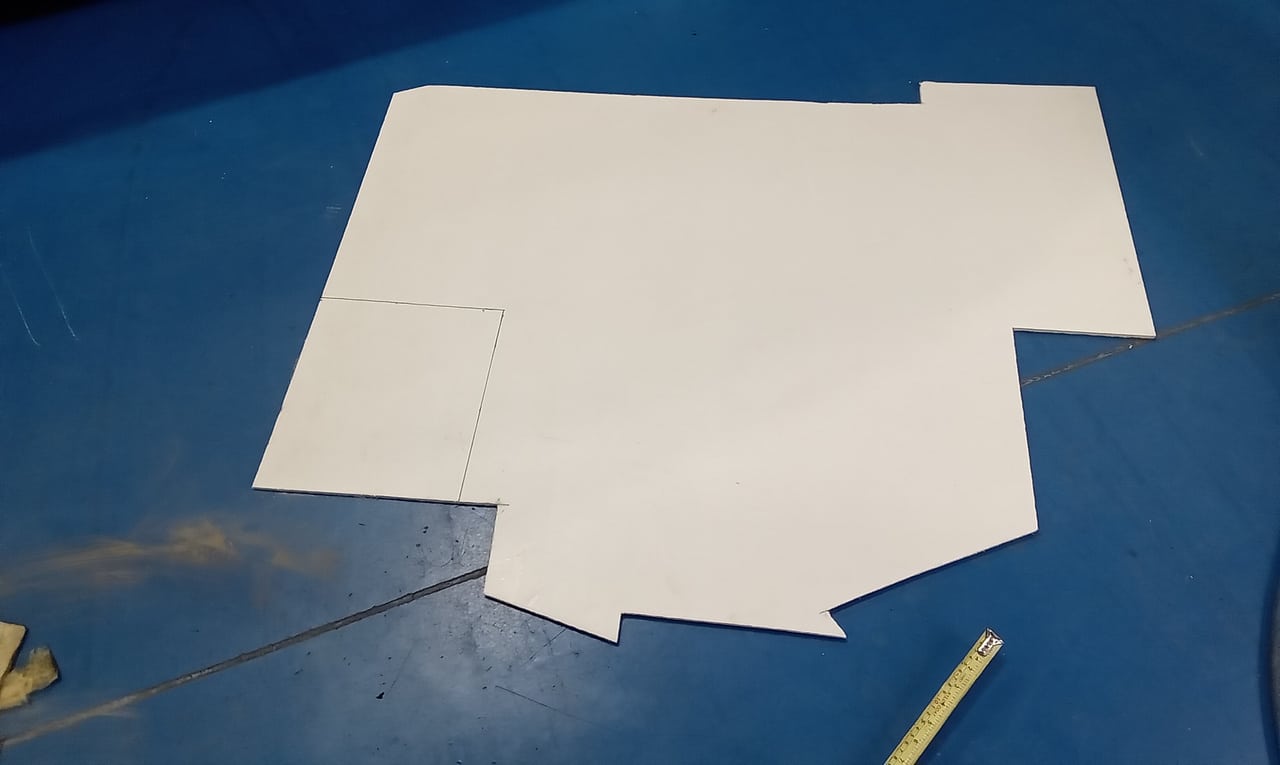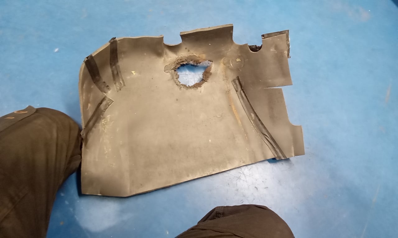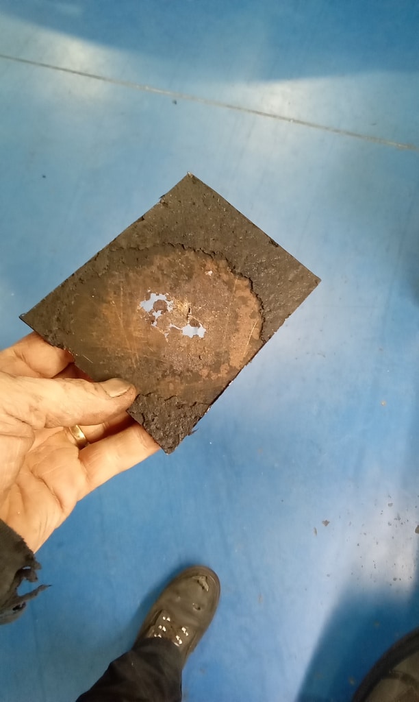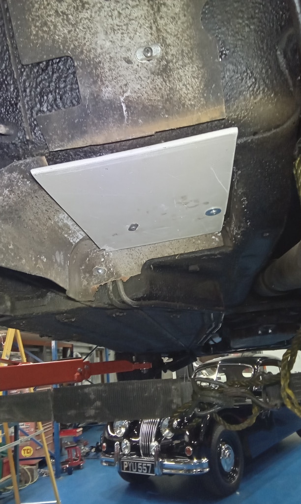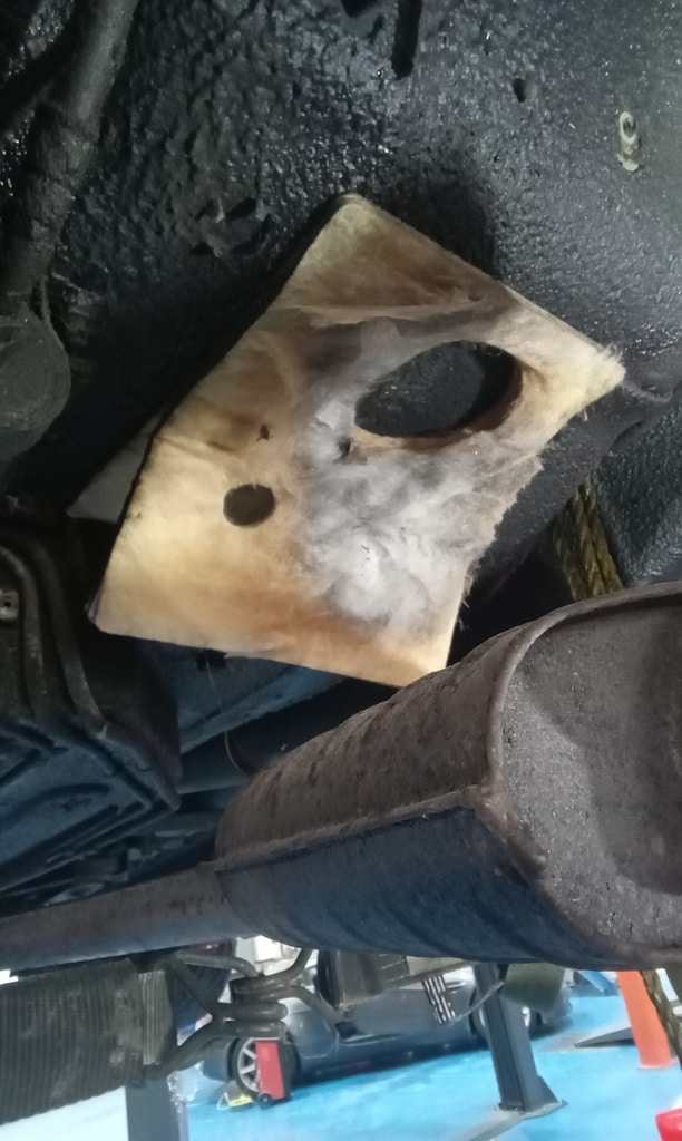 ”Refit rear heatshield. Trim off broken areas both sides.measure and cut new heatshiels from thermolite sheet. Reuse part from old offside shield and fix to new. Remove nearside exhaust and check catalyst. Cat OK nearside. Clean flange. Measure and cut plates and make new shield for offside. Re-use sides from old shield and fix in place.