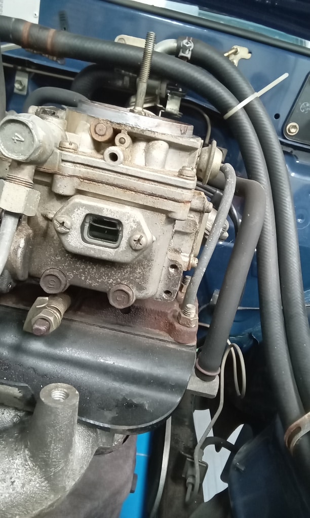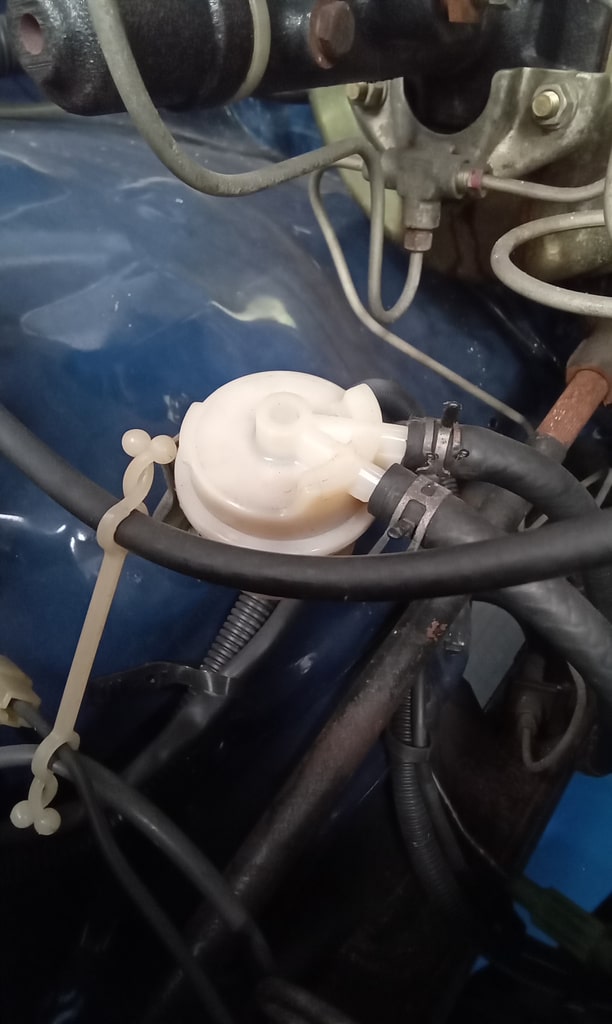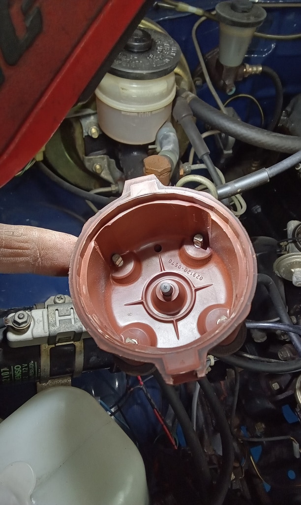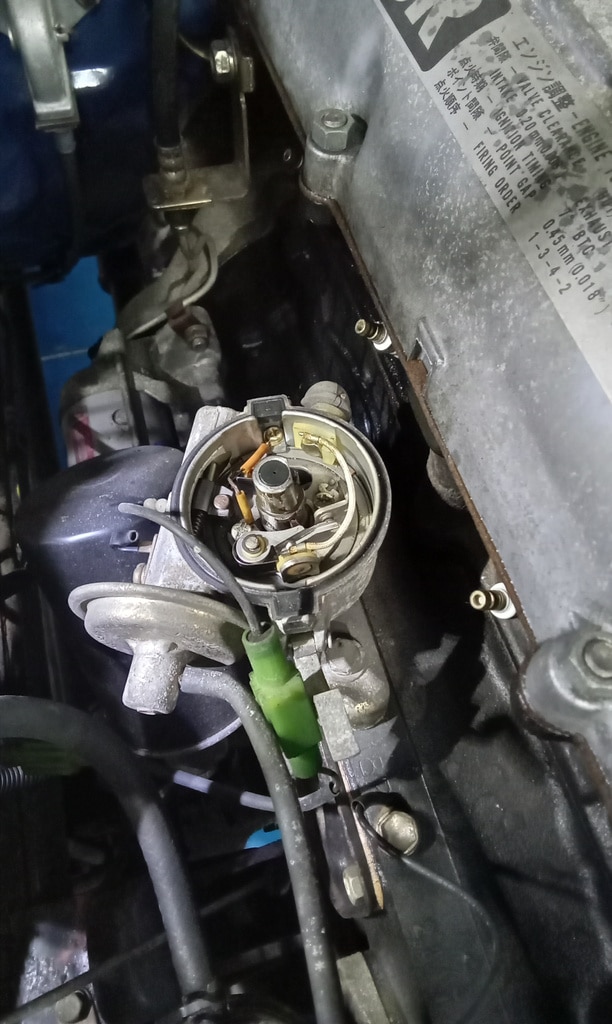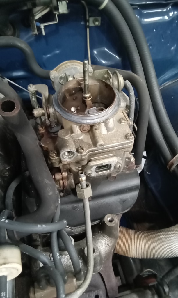 ”Get on ramp and painful tank. Disconnect fuel line from pre filter and blow back to tank. Removeair filter. Disconnect pipe from pump to carb and also blow out. Reconnect pipes to filterand pump. Remove distributor cap and check points. Clean rotor arm and oil cam. Refit cap. Remove spark plugs. Clean and regap to 0.8mm and tighten top caps. Refit and connect Ht leads. Reconnect pipe at carb. Put 10 ltrs E5 petrol in. Jump start and check exhaust. Centre silencer holed and blowing. Order new battery and exhaust and wait until replaced to check running etc.”